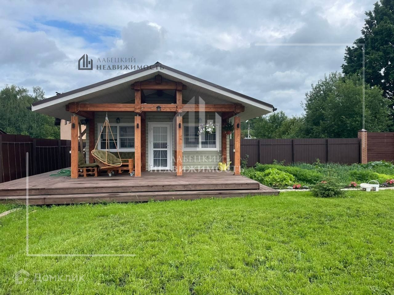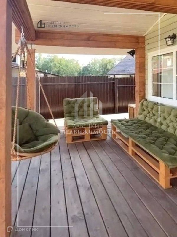 Терраса (5,5х2,5м) с летней мебелью и качелей. На террасе проведено освещение.