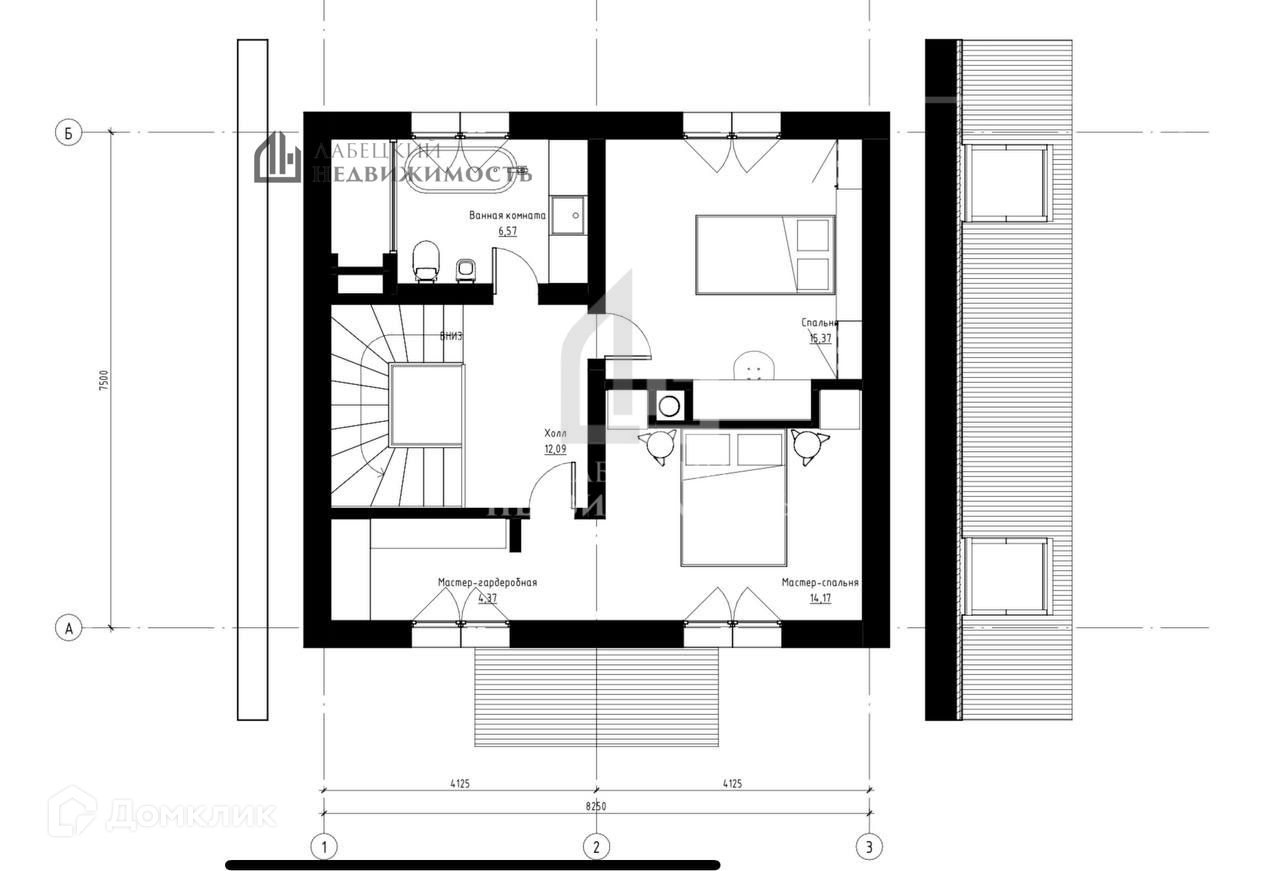 На втором этаже проектом предусмотрено размещение двух спален (мастер спальня площадью 14 м.кв с собственной гардеробной (4,5 м.кв),ванной комнатой 6,5 м.кв и дополнительной спальней площадью 15 м.кв. Все помещения второго этажа светлые и имеют большие окна.