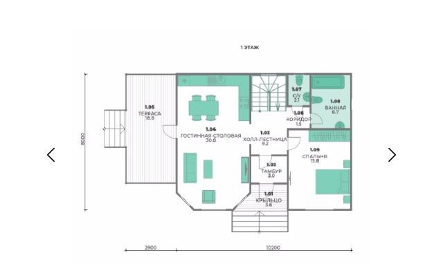 1 Этаж: гостиная-столовая , холл-лестница ,тамбур, ванная, с/у, веранда, спальня;