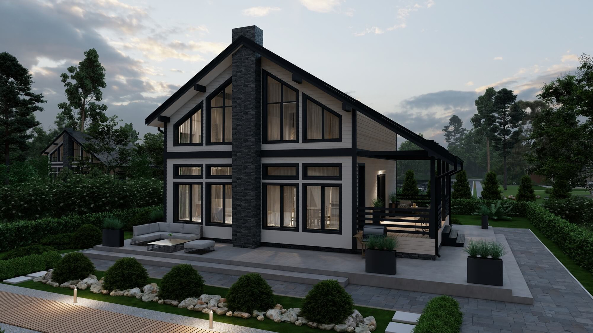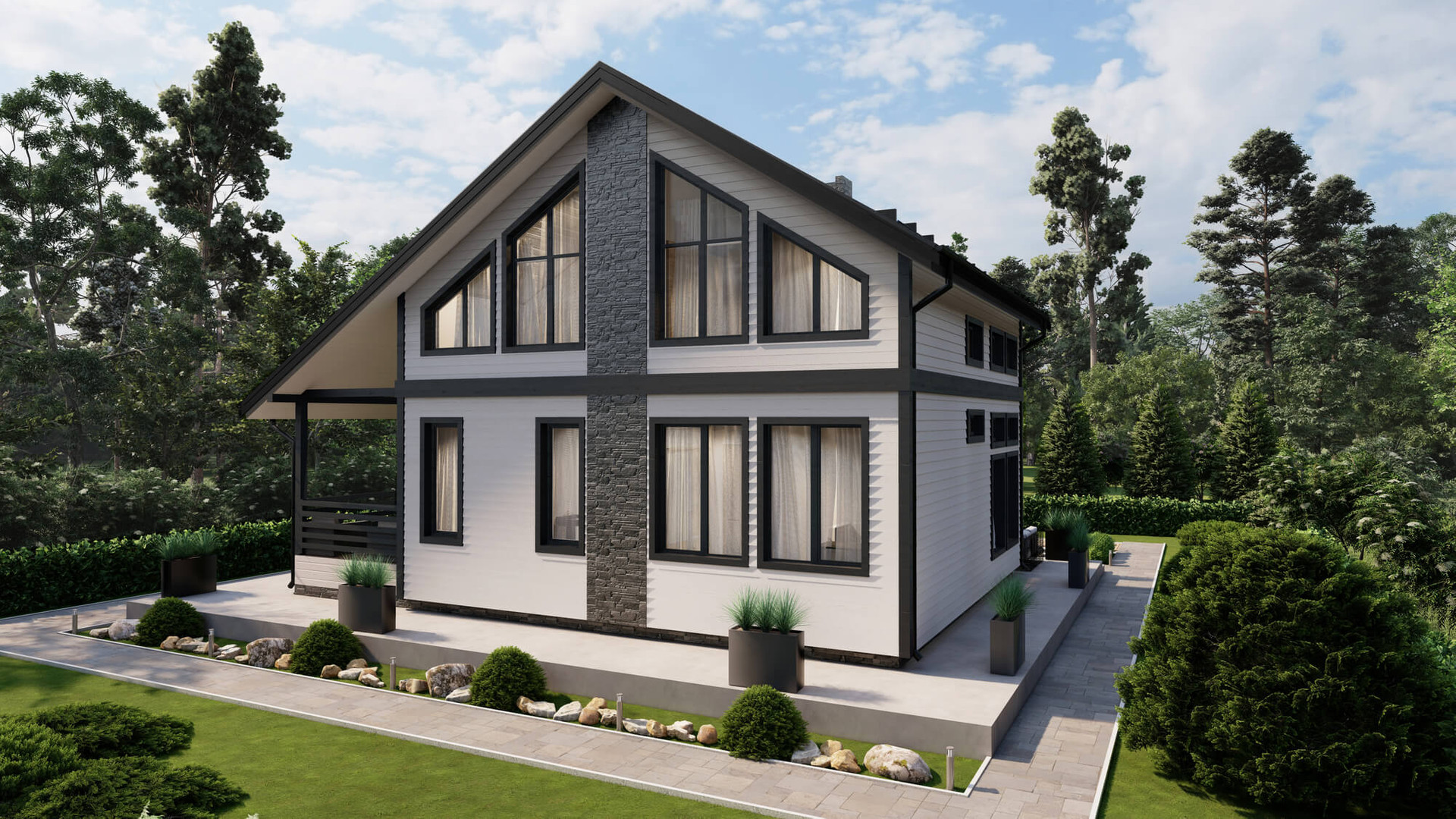 В данном проекте идеально все: продуманная планировка, высокие потолки, большое количество освещения в доме и стильный фасад.