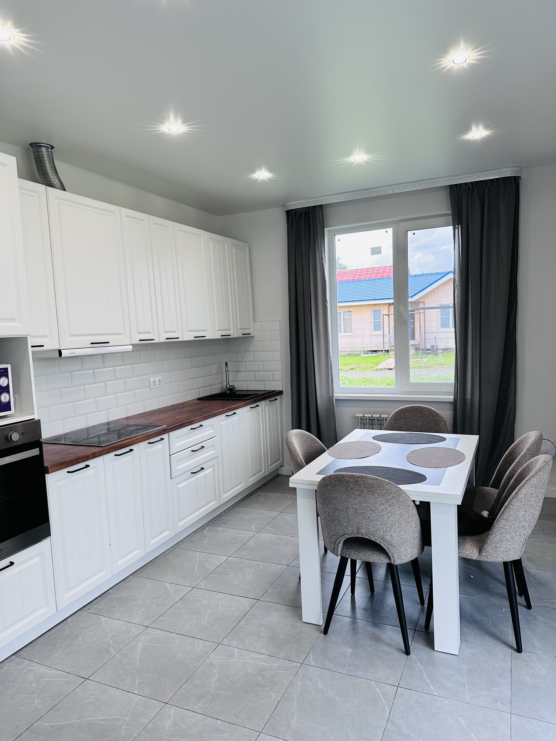 - В доме сделаны натяжные потолки с точечными светильниками.