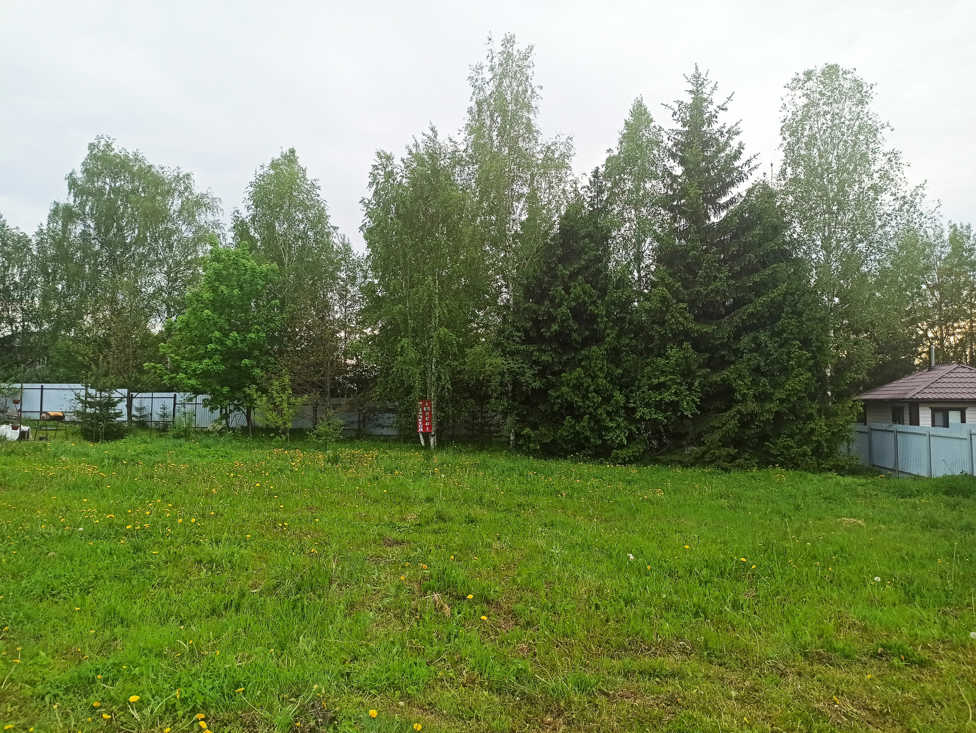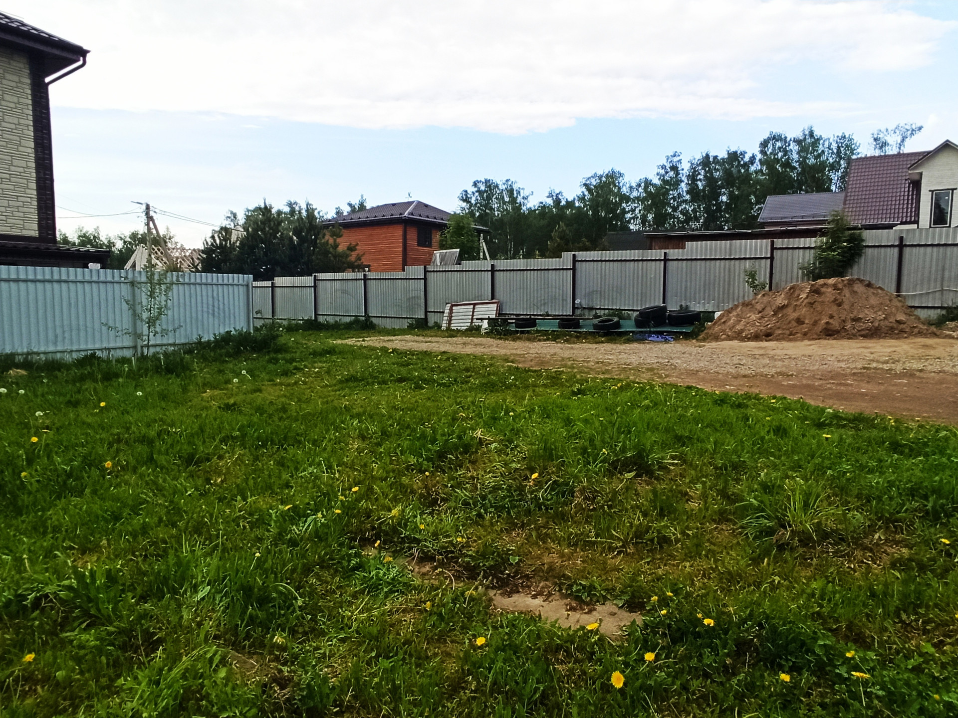 Участок ровный, прямоугольный, сухой, огорожен с двух сторон новым забором.