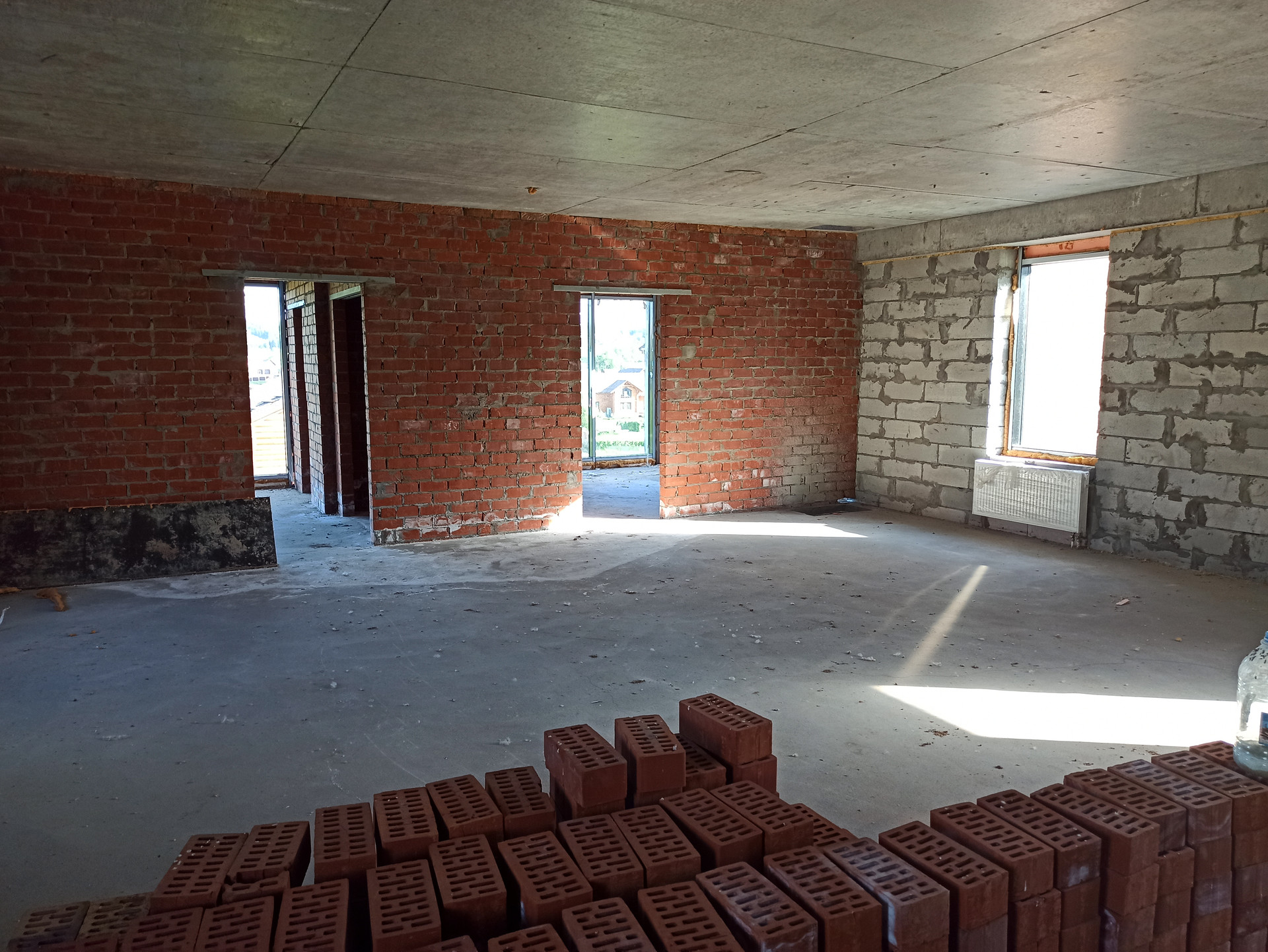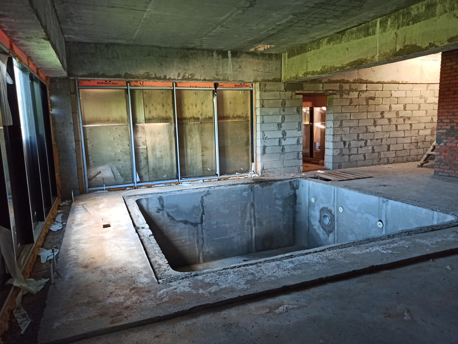 Обьект готов к отделке, смонтированна разводка для теплых полов и отопления, залиты полы. Дом законсервирован, все витражные окна закрыты от внешнего воздействия, обьект находится под охраной.