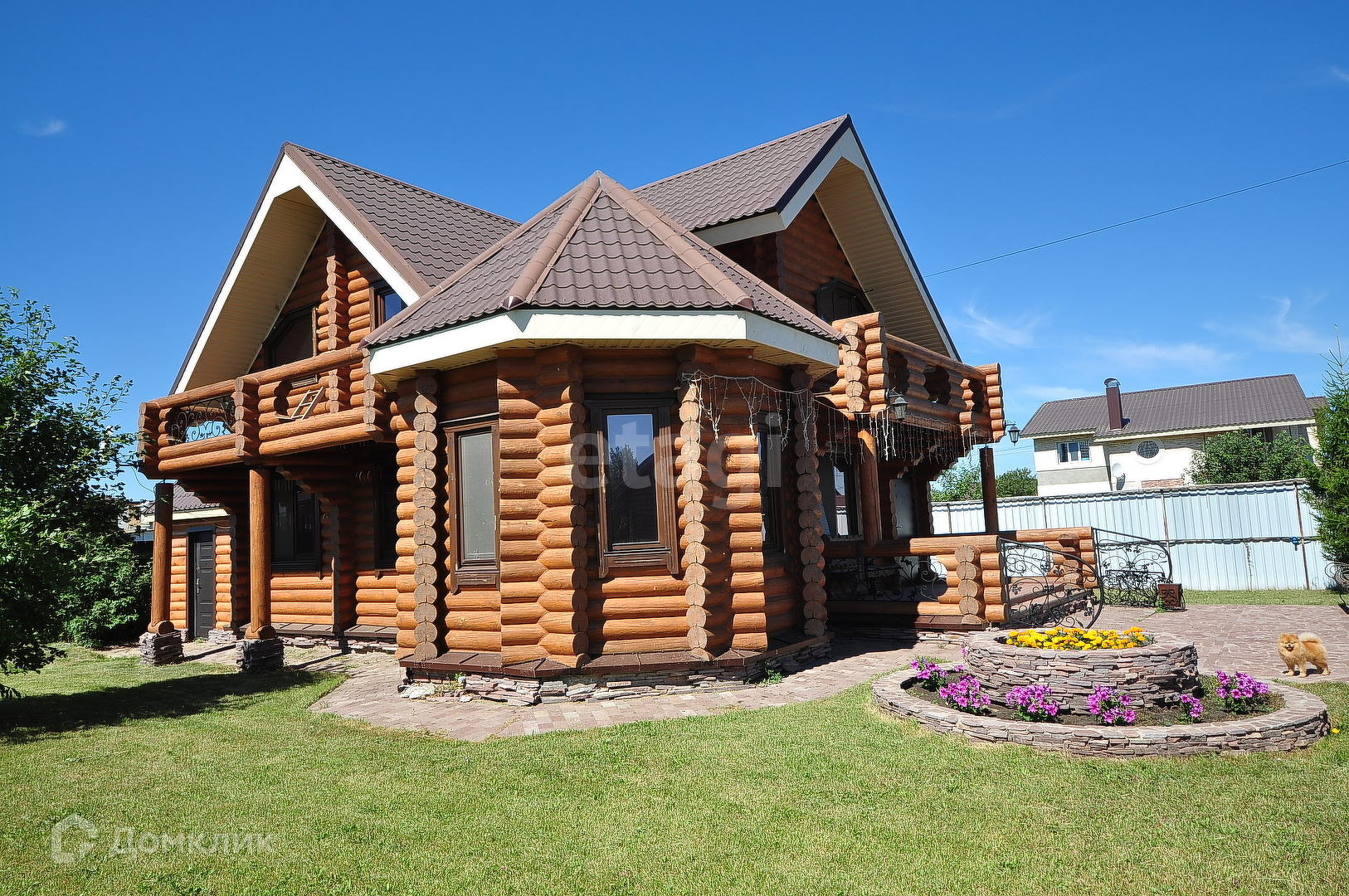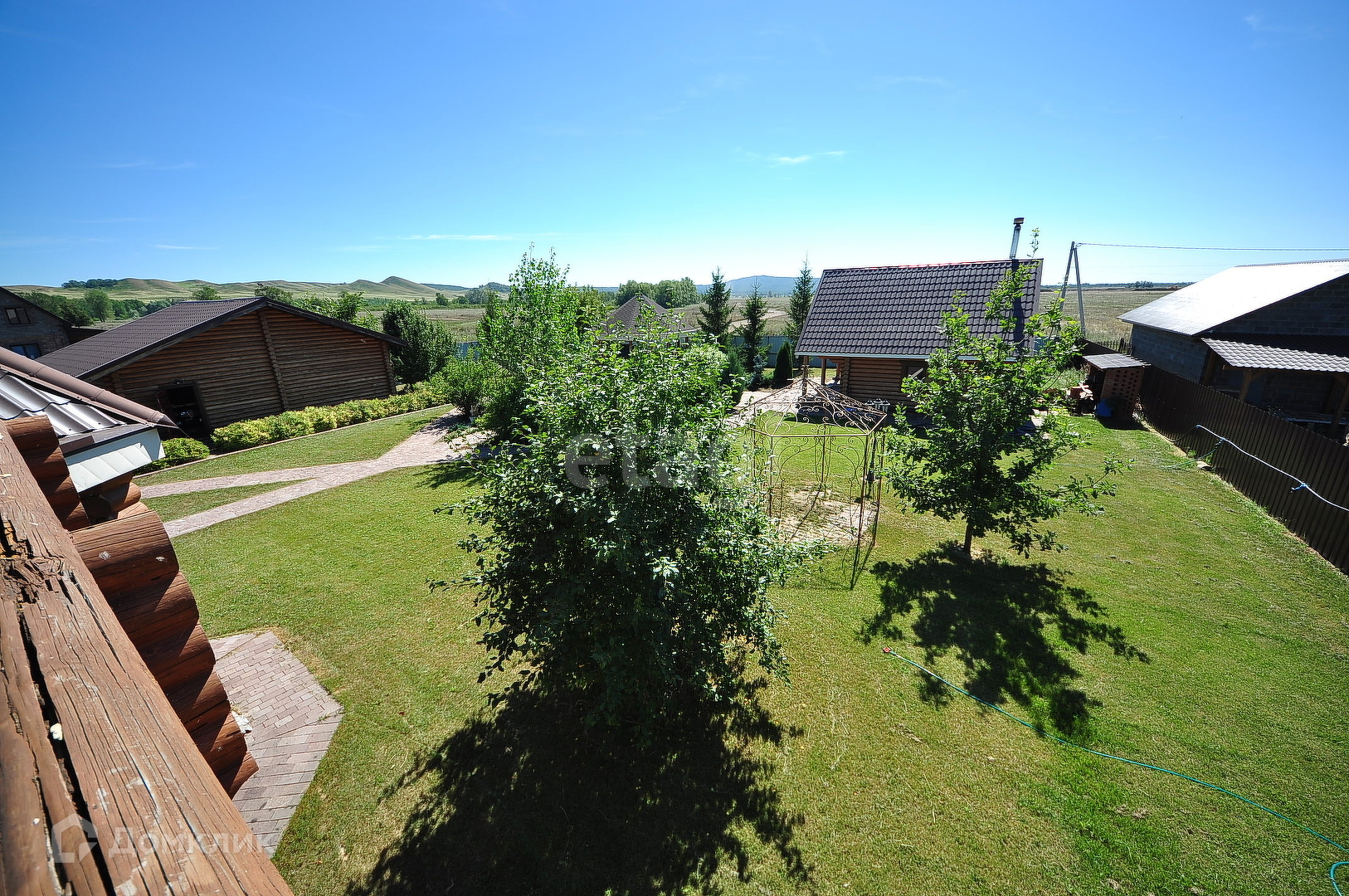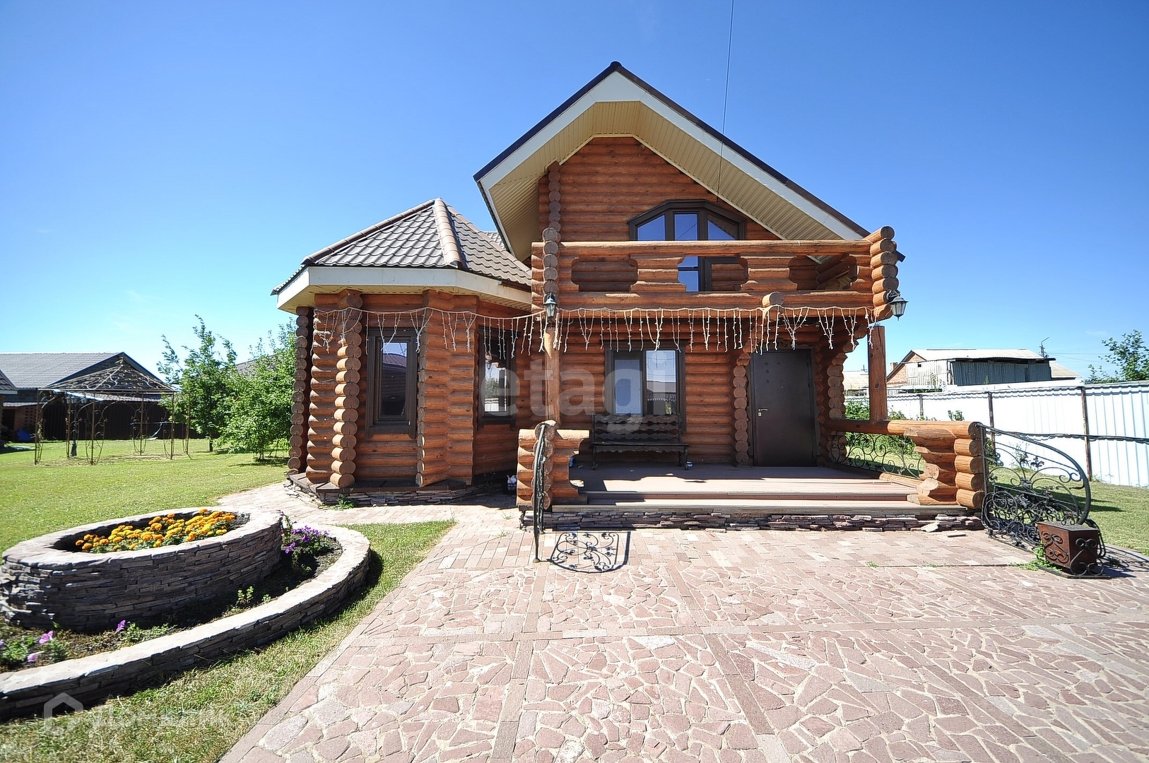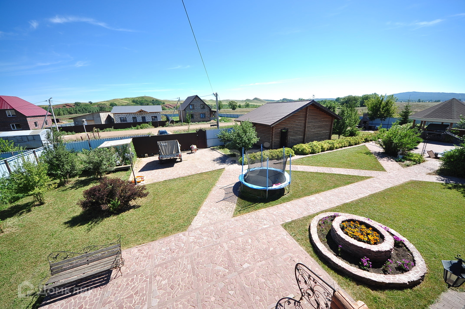 Территория облагороженная, 18 сот, (насаждения: кедр, туи, ели, барбарисы, плодово- ягодные растения, хвойные насаждения), рулонный газон по всей территории, полностью обустроен поливочной системой, все дорожки, отмостки, опорные стенки, мангал, выложены из природного камня.