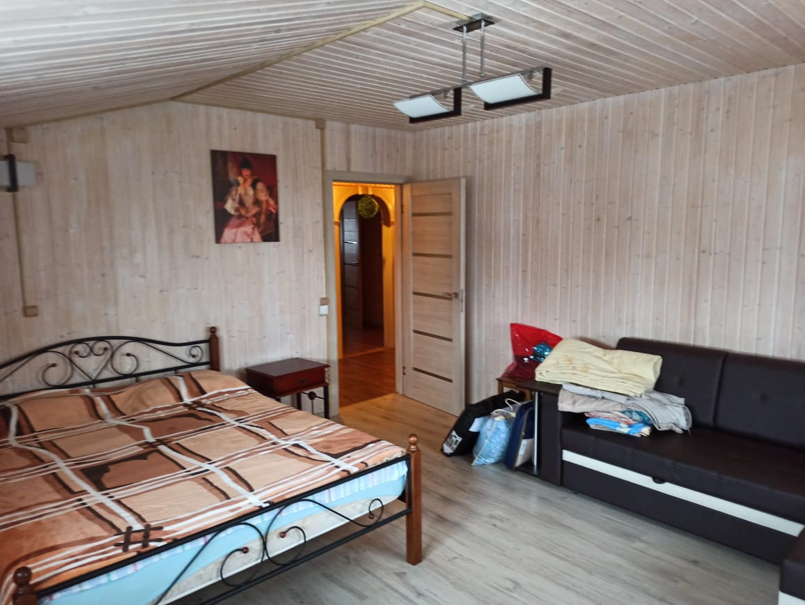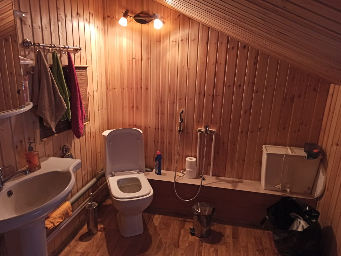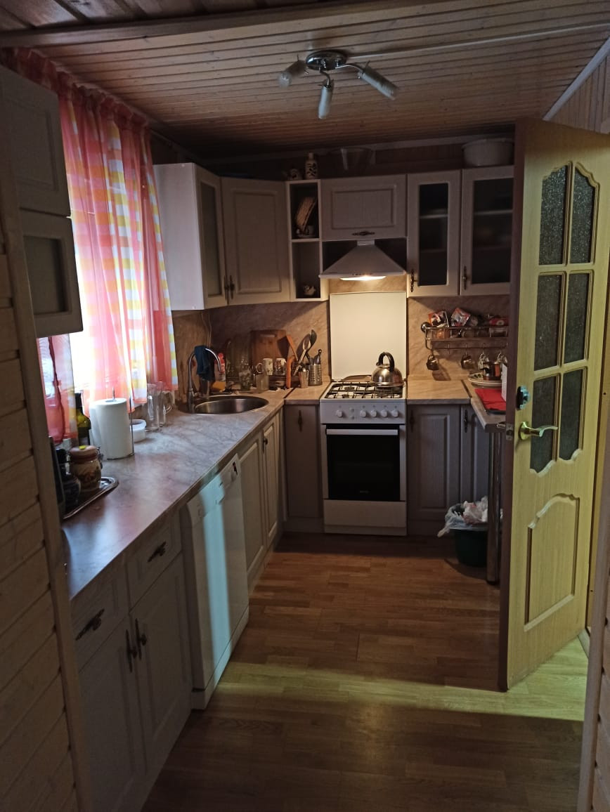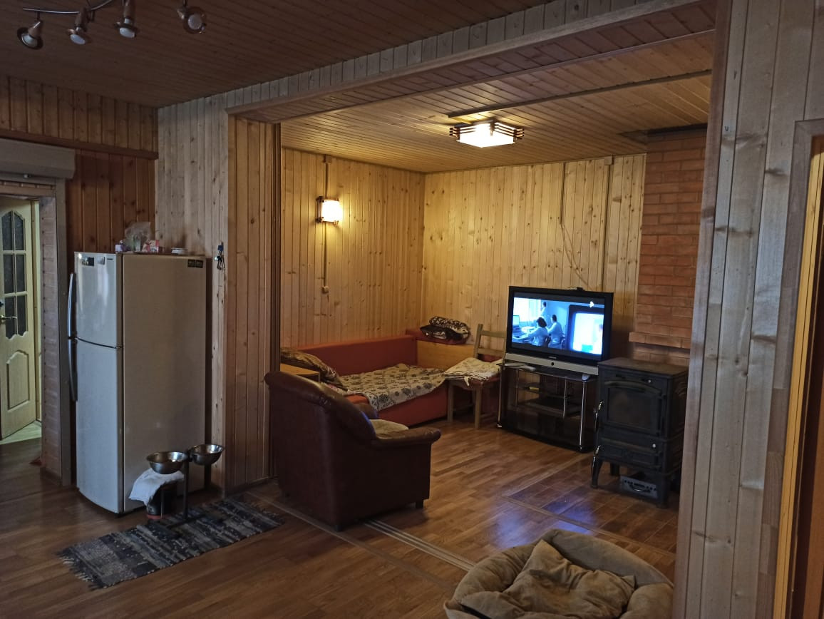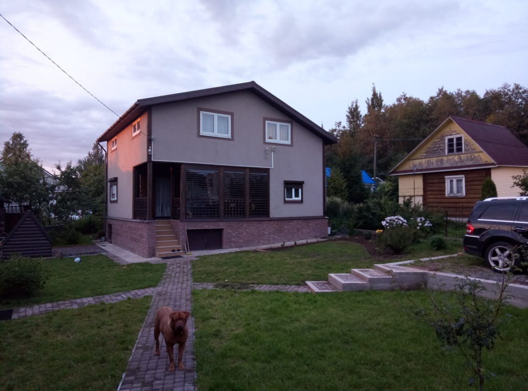 Двухэтажный дом из сип-панелей 161 кв.м жилой площади, без учета уличной террасы. Дом подготовлен для круглогодичного проживания. Температура внутри не опускается ниже 10 градусов, даже если долго не протапливать. В доме в общей сложности 5 больших жилых комнат, 4 на 2-ом этаже и 1 на первом, полностью мебелированы. Огромный холл с большим обеденным столом и большим плазменным телевизором. Помещение с печкой можно также полностью отделить раздвижными дверьми. Имеется 2 санузла по 1-му на этаже, на первом этаже санузел с душевой кабиной и стиральной машинкой. Бойлер на 100 литров воды. Кухня оборудована всей необходимой техникой, включая посудомоечную машинку и газовую плиту с духовкой, газ выведен отдельно на улицу в баллонах. Уличная терраса полностью отделяется прозрачными роль-ставнями, поэтому можно сидеть и зимой. Делали всё для себя, поэтому денег на технику и мебель не жалели. Подключен также высокоскоростной интернет (оптика) и кабельное ТВ