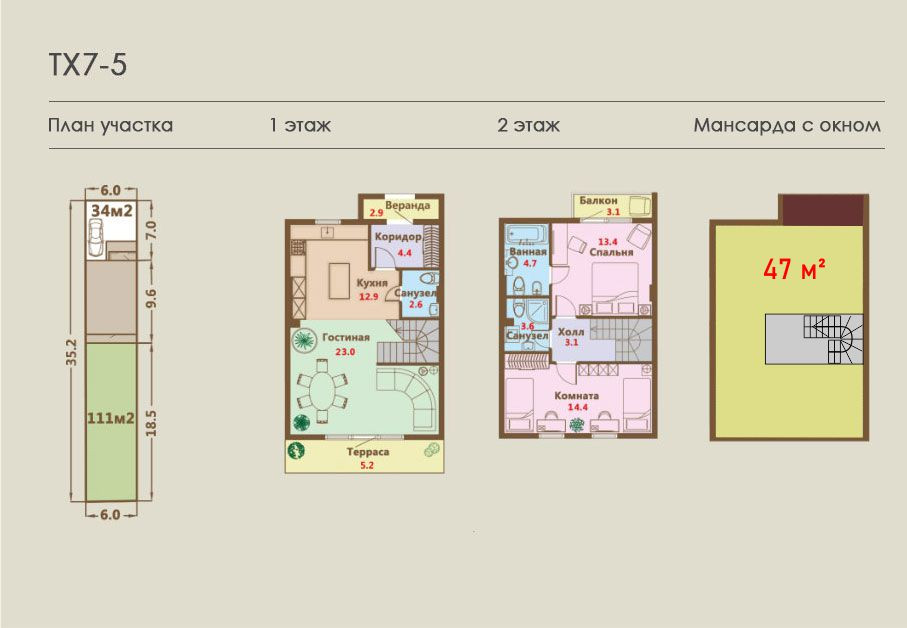 Площадь 1 и 2 этажа по 47 кв.м., Высота потолков 3,0м.