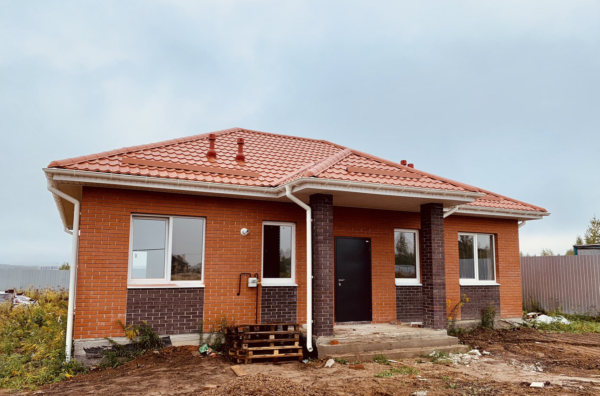 Одноэтажный дом со всеми коммуникациями (газ, вода, электричество, канализация) сделана отделка. Забор по периметру, откатные ворота, калитка.