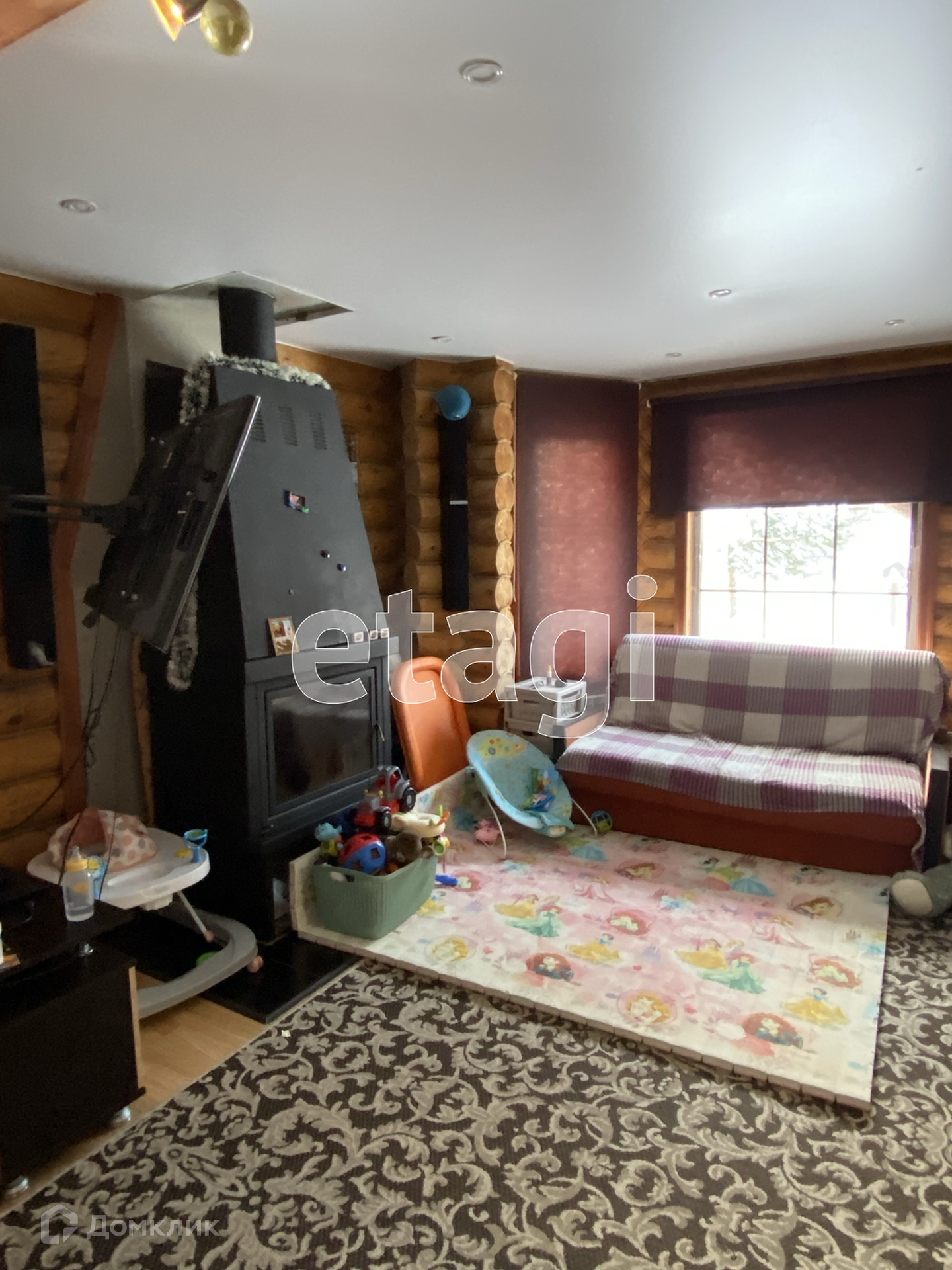 На первом этаже дома находится кухня-гостиная с камином и жилая комната.