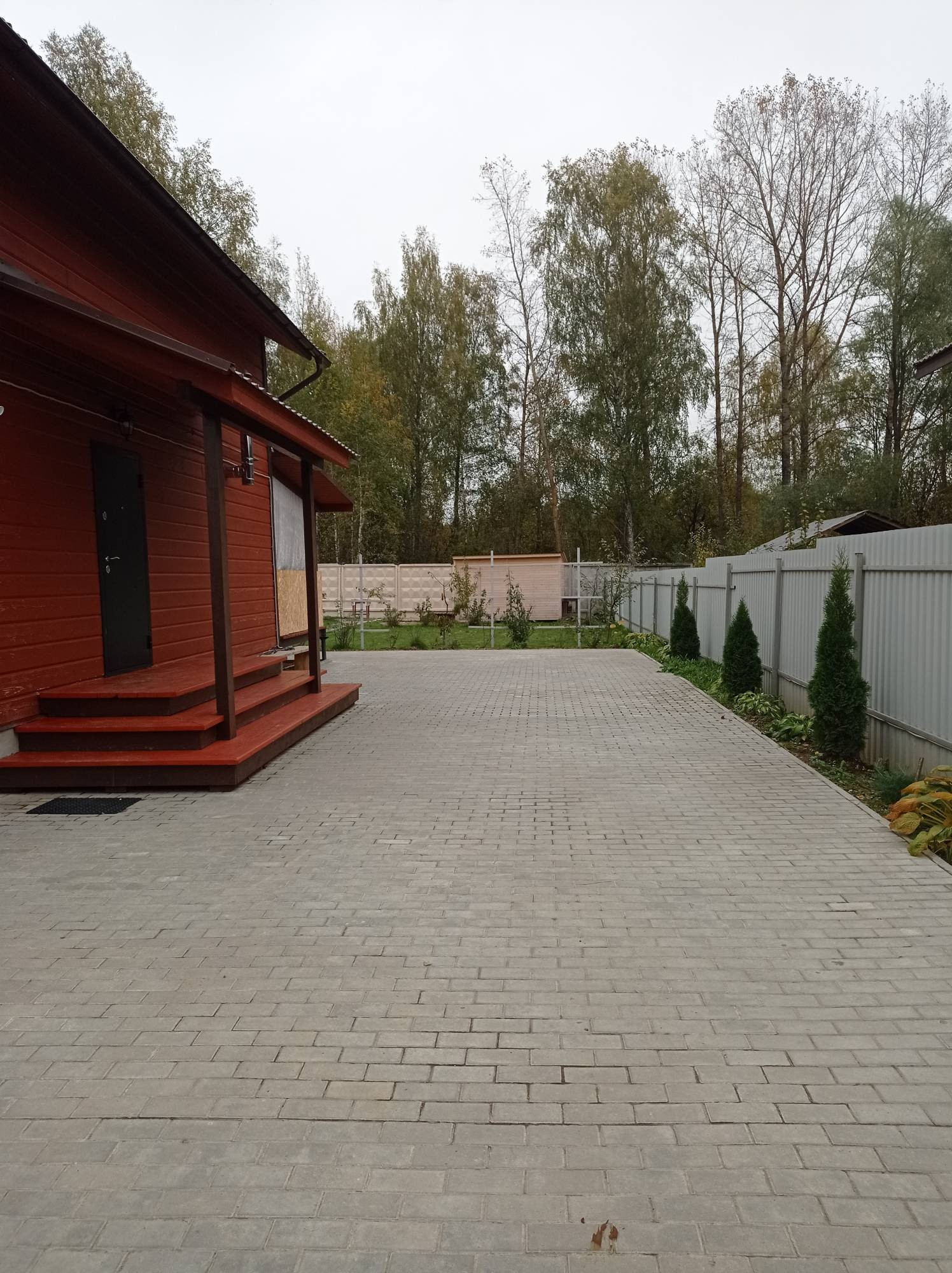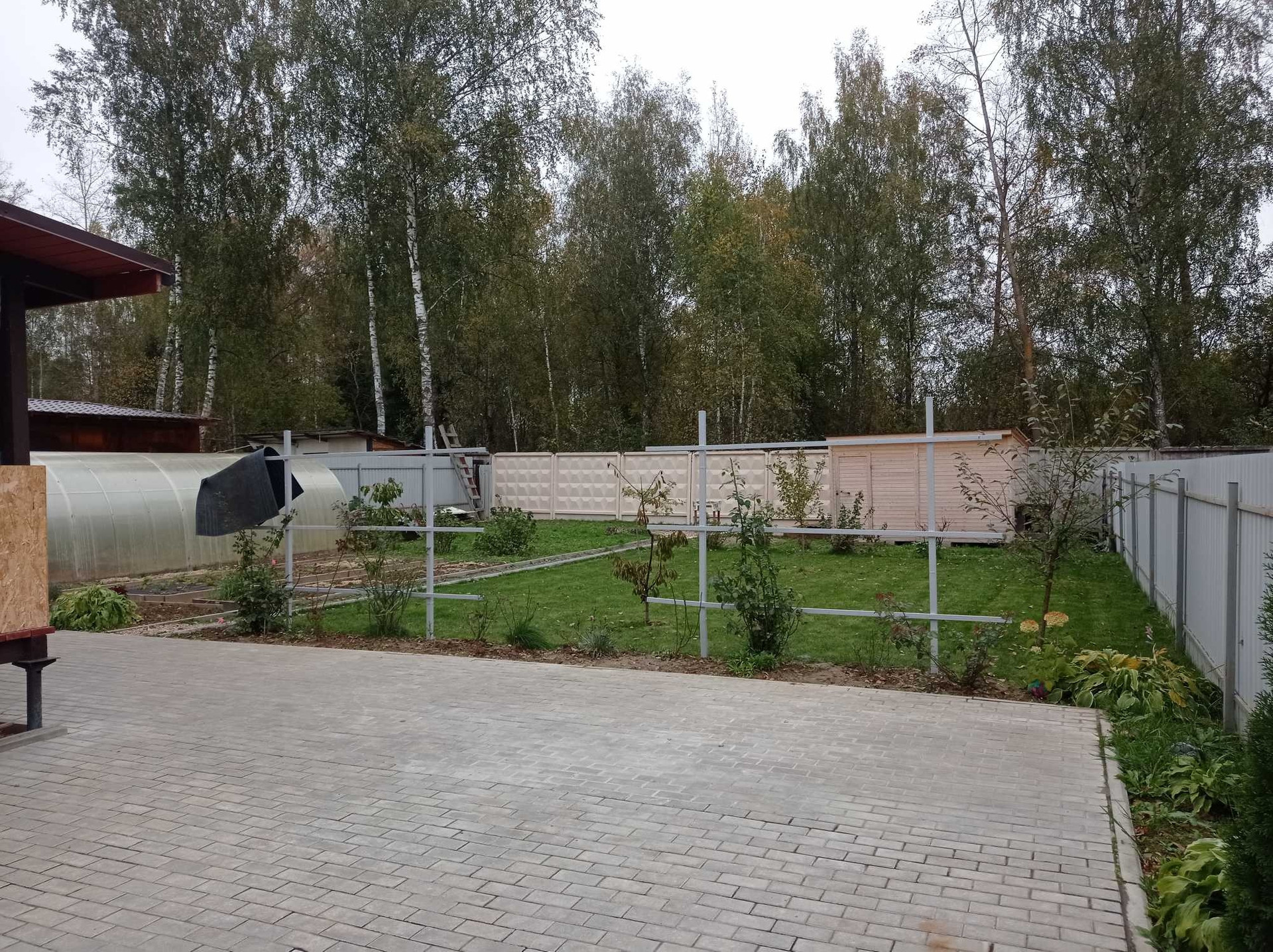 Участок ровный, выложена плитка, засеян газон. Теплица 8 метров, хоз блок.