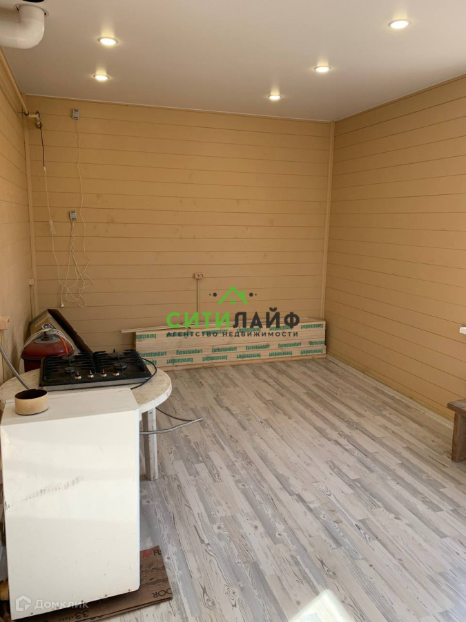 Выполнена разводка электричества, вывод канализации, газ  в доме, пол(ламинат), натяжной потолок, станы - вагонка, сан.узел плитка.