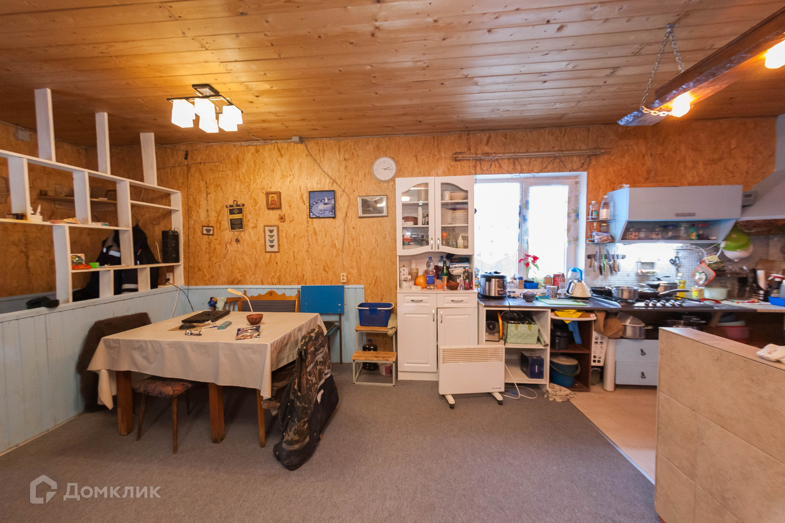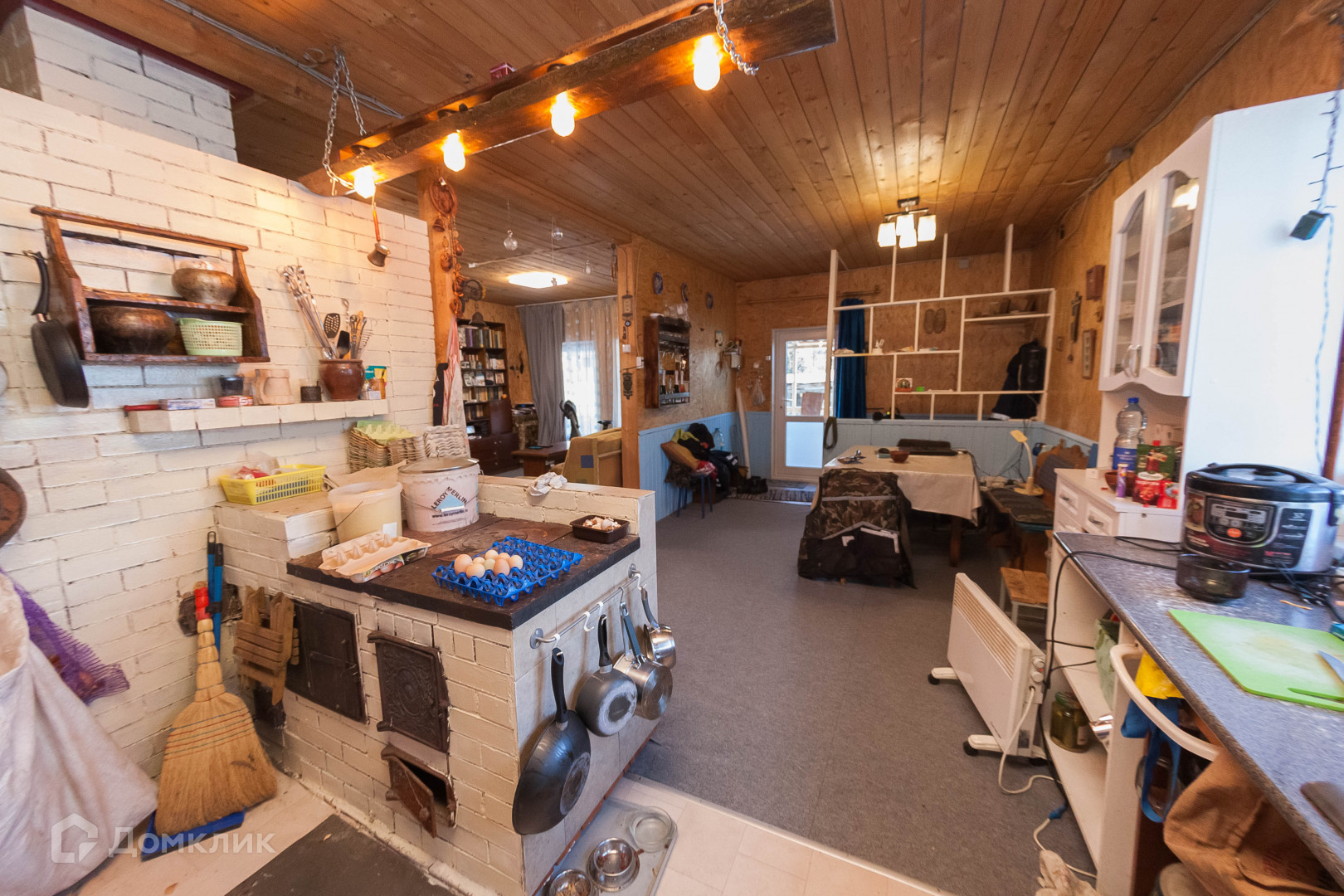 - Кухня - студия 33 м²., укомплектована всем необходимым, установлена варочная дровяная печь с духовкой, (установлен бойлер);
