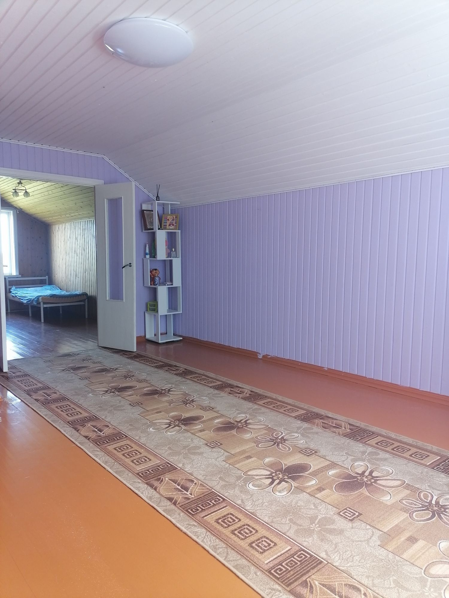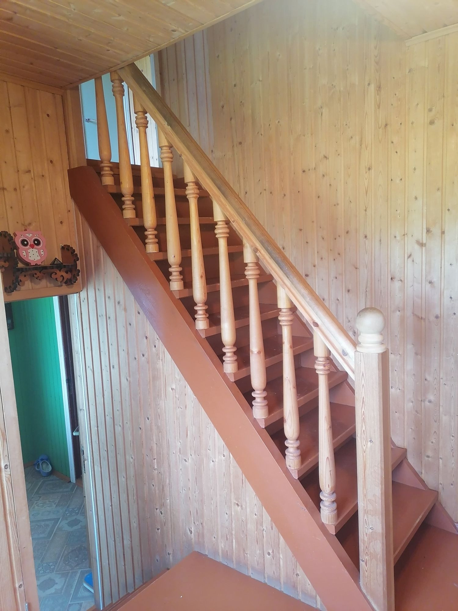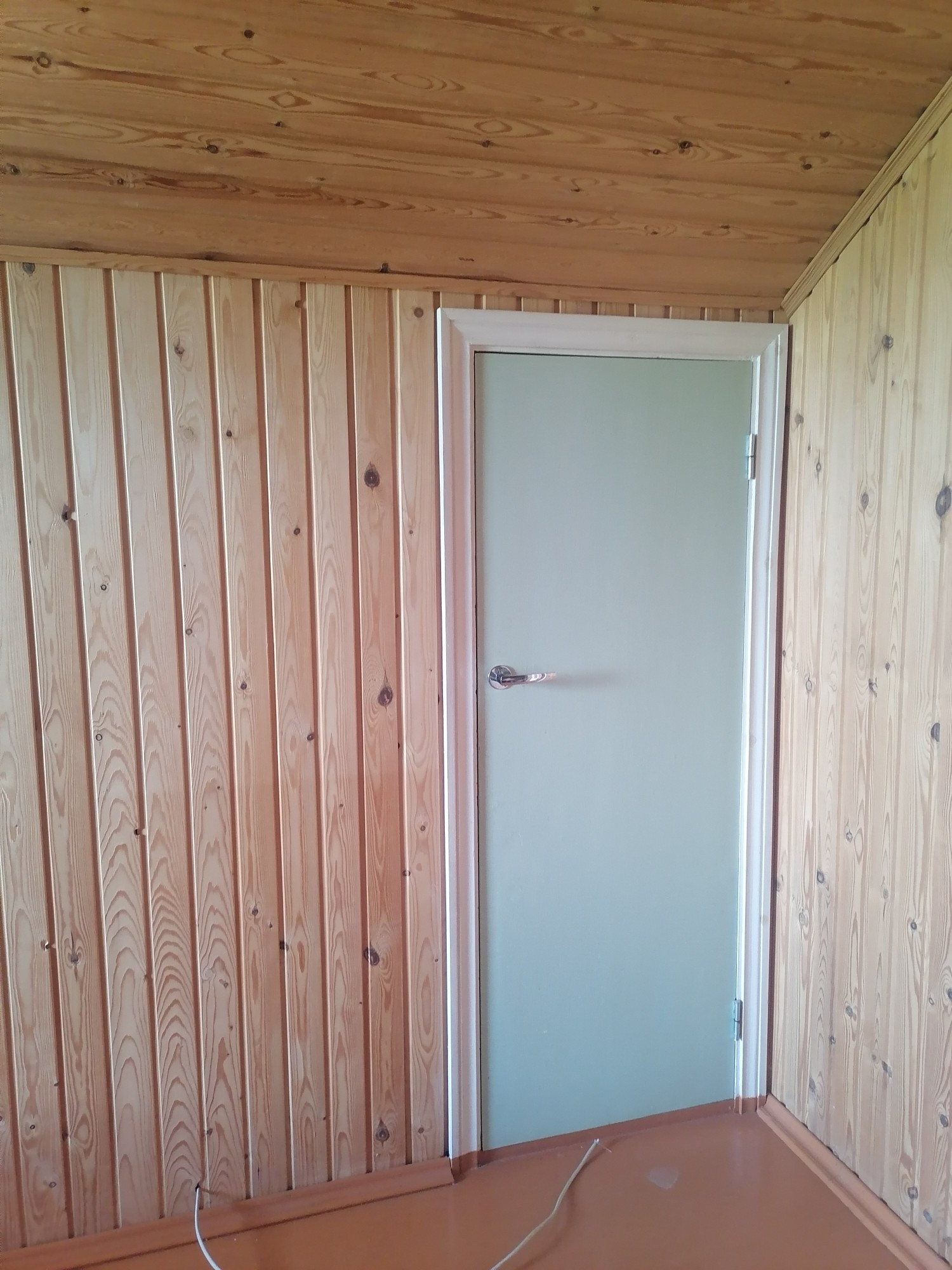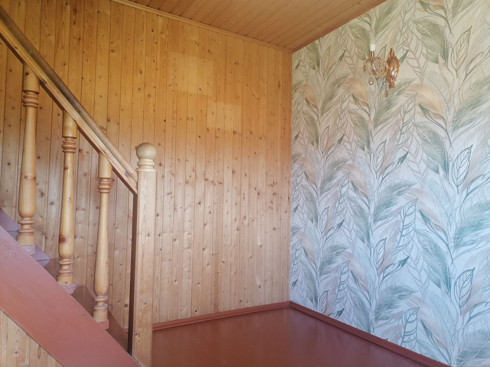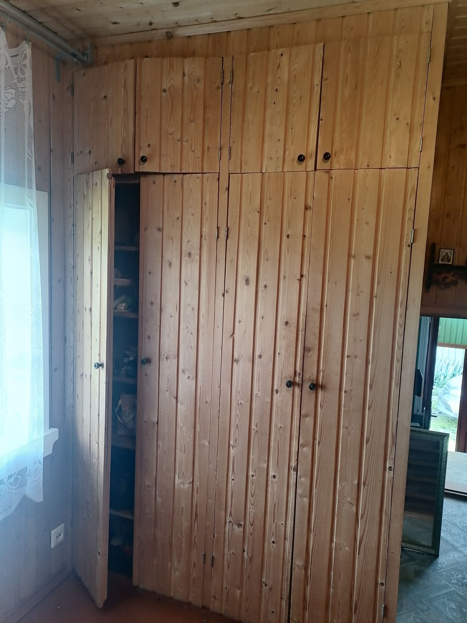 Очень много мест для хранения (встроенные шкафы), всё из дерева, вагонка.