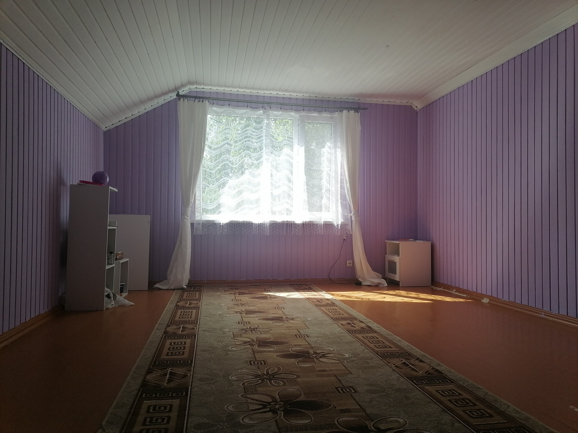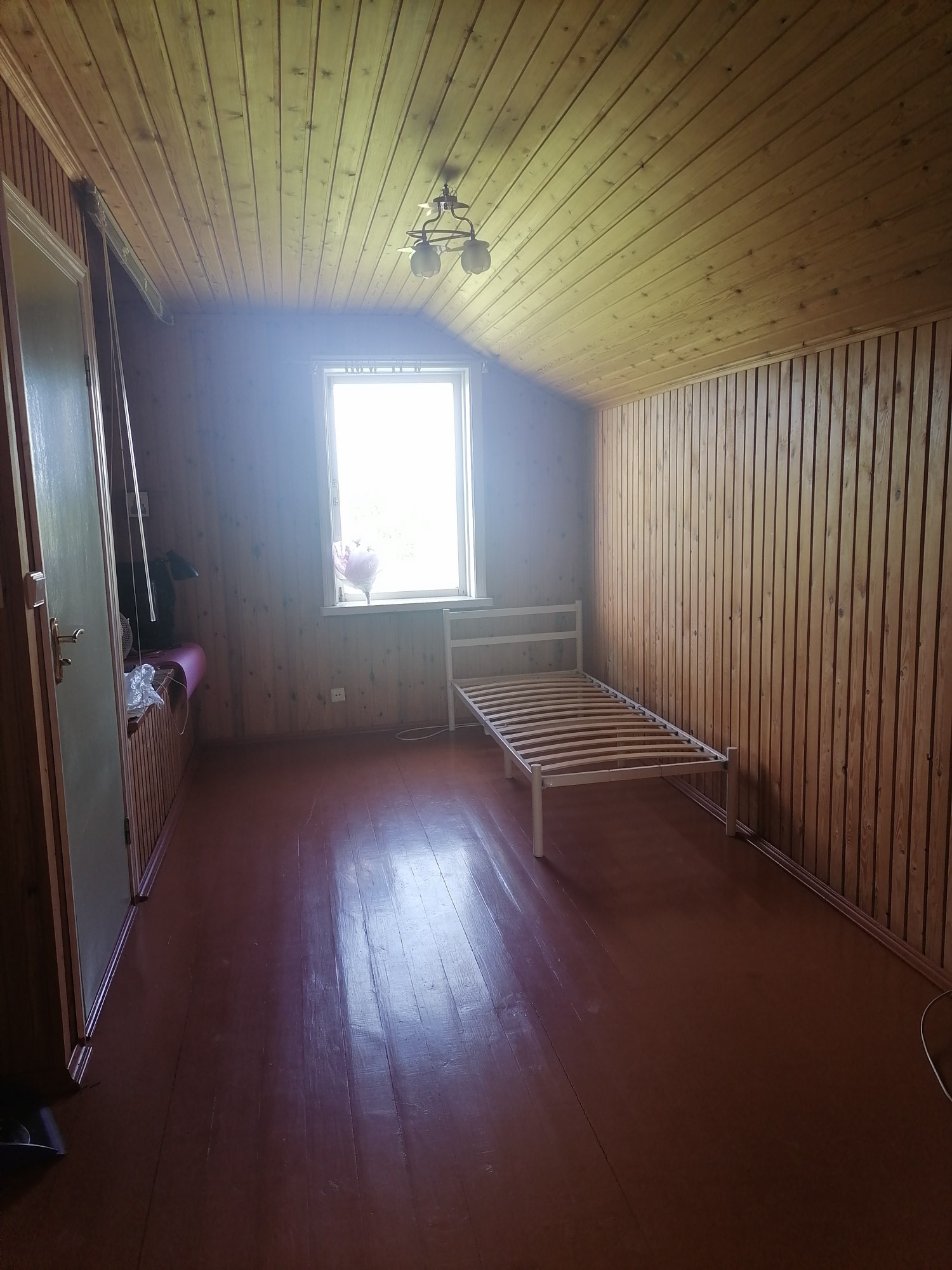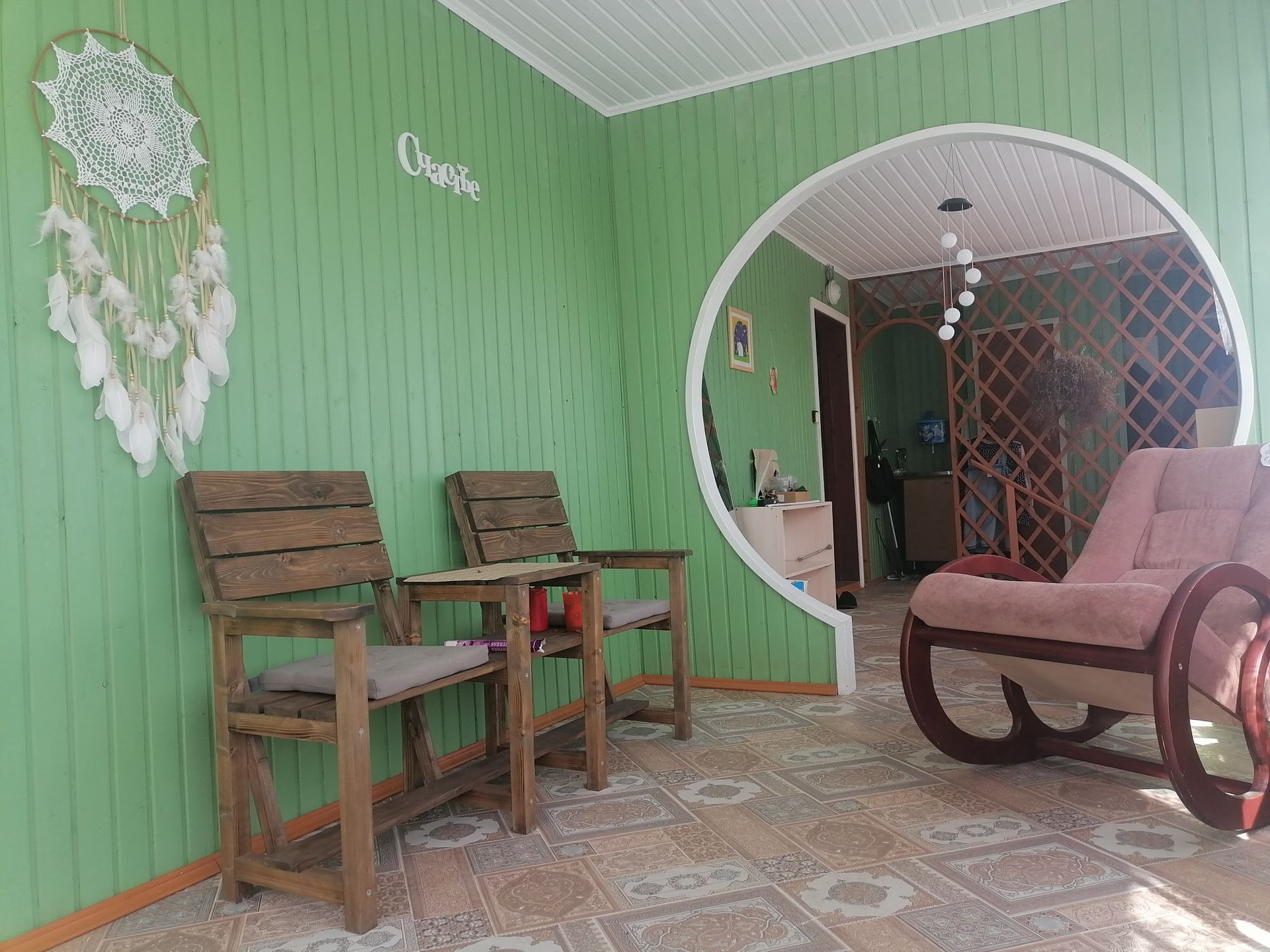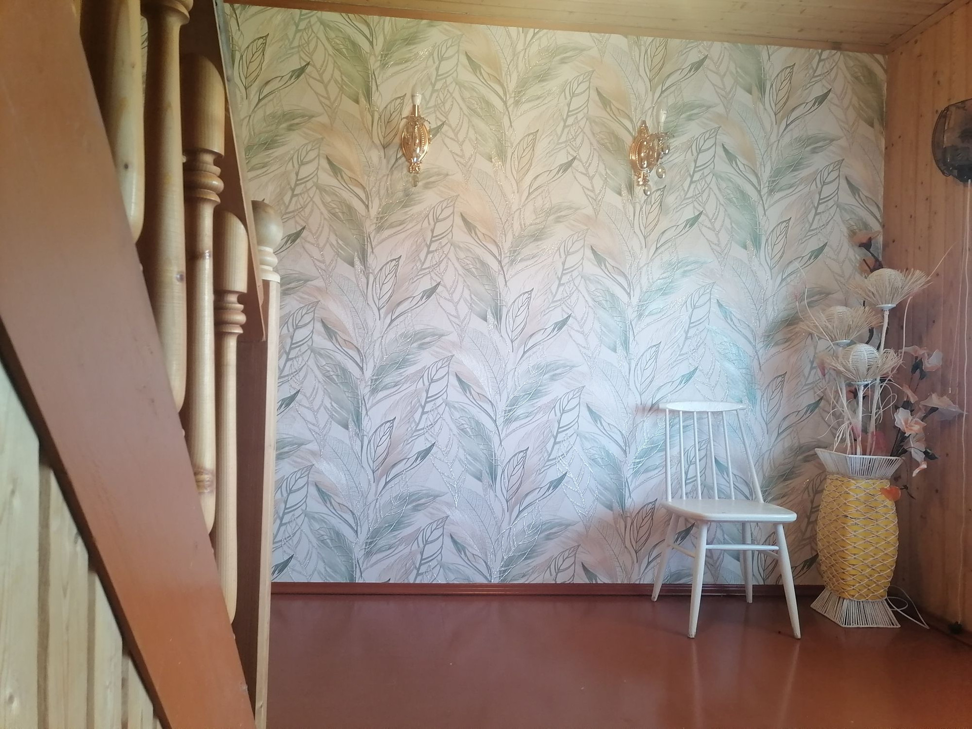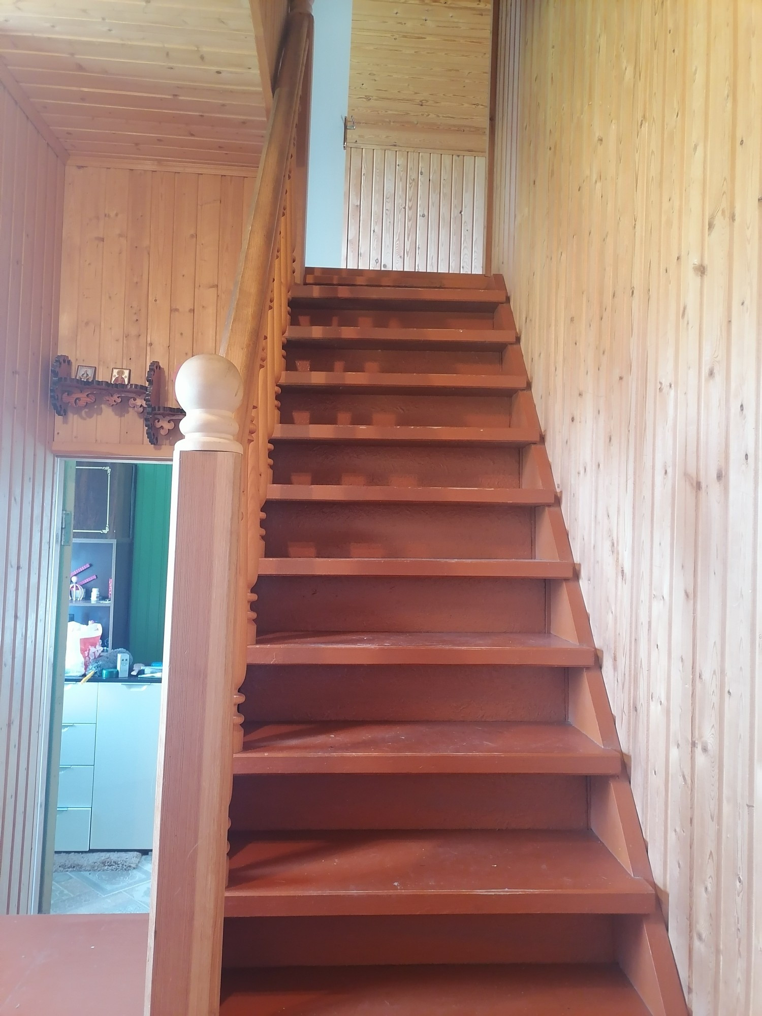 Очень много мест для хранения (встроенные шкафы), всё из дерева, вагонка.