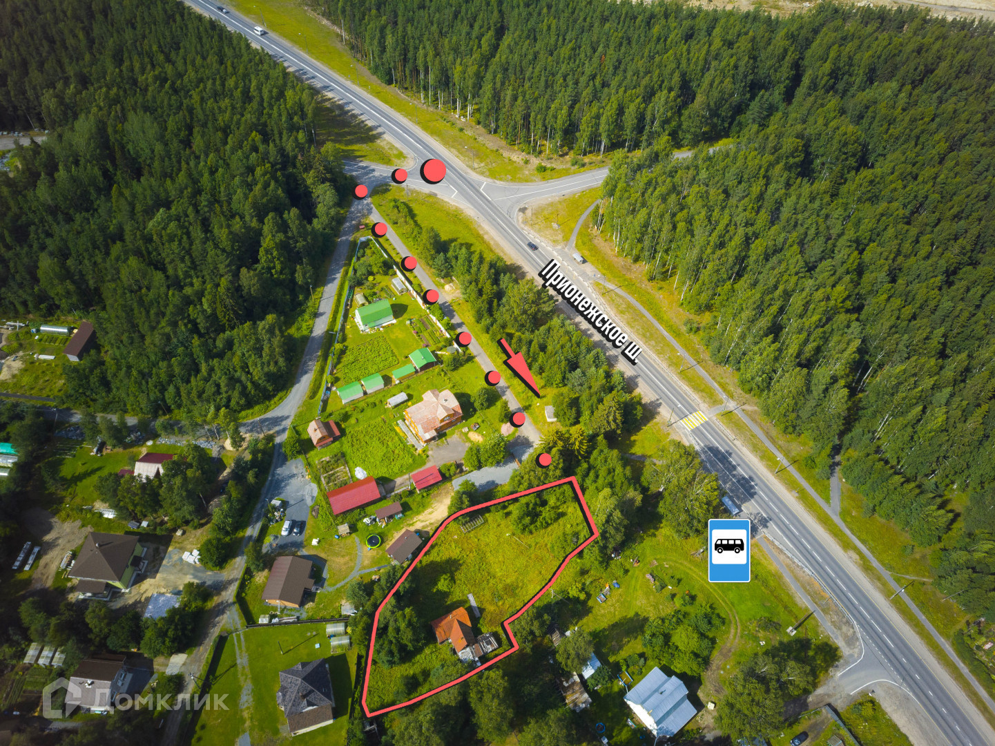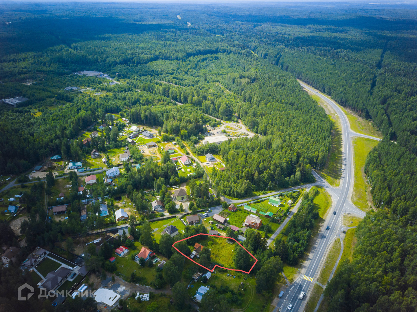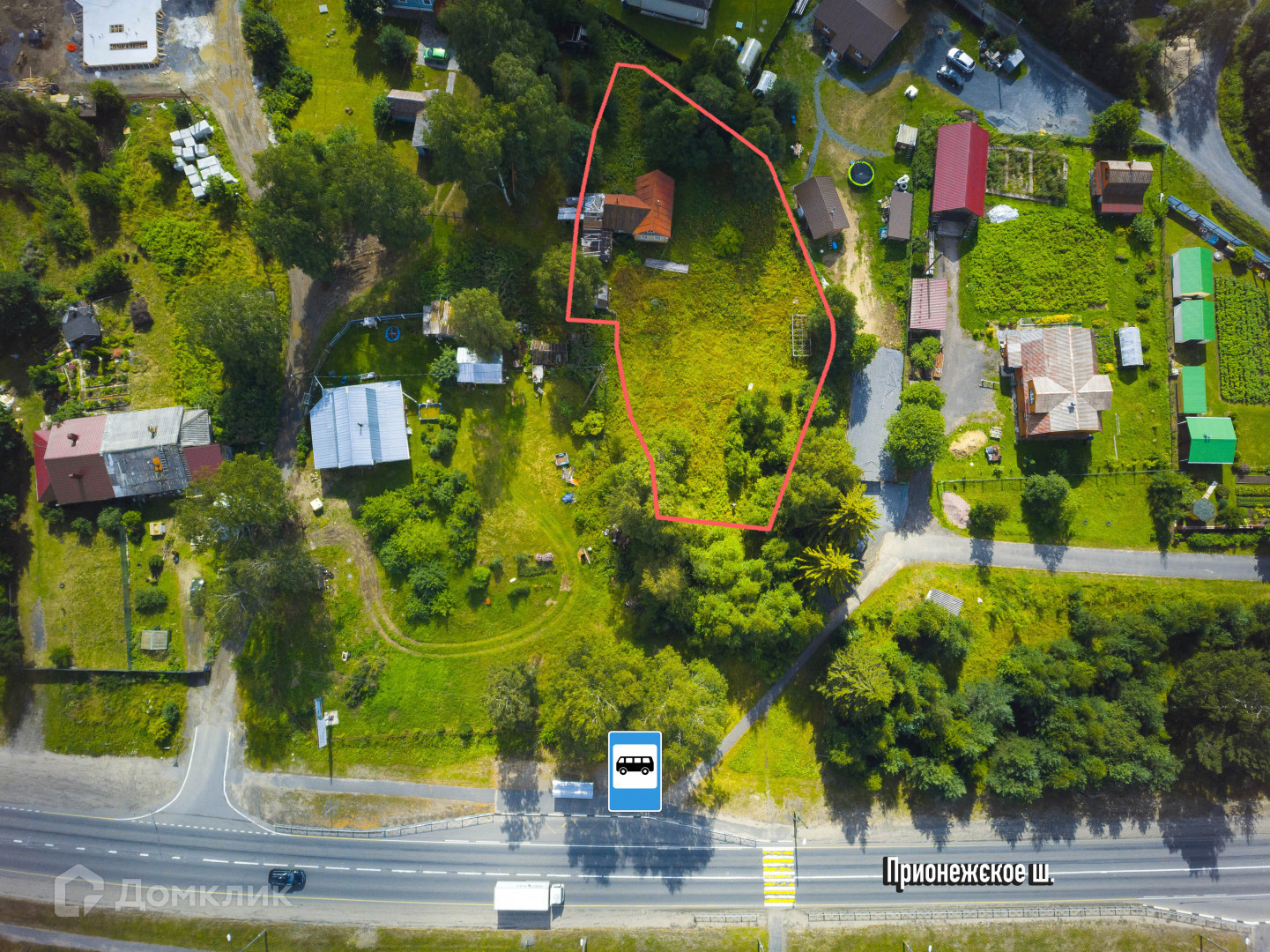 Круглогодичный асфальтированный подъезд прямо до участка с двух сторон.