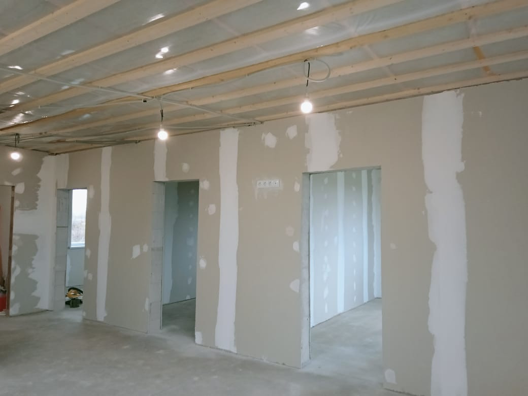 - Внутренняя отделка комнат из гипсокартона + шпаклевка под чистовую отделку