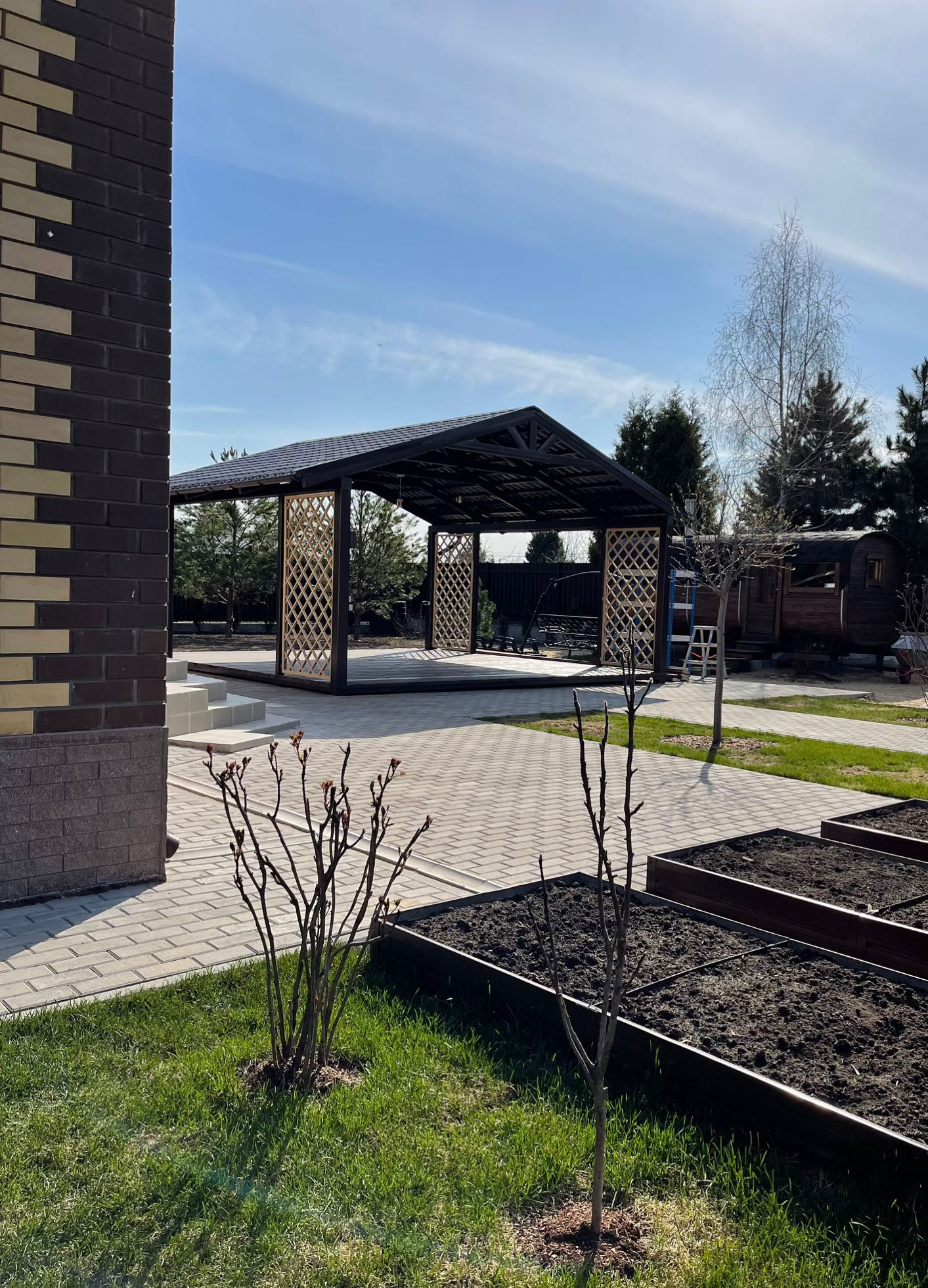 - Большая беседка, выполненная из металла, лаунж-зона