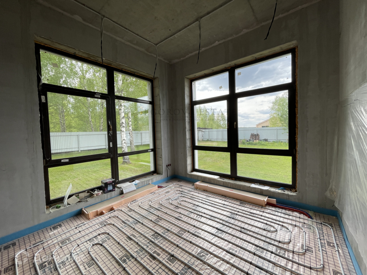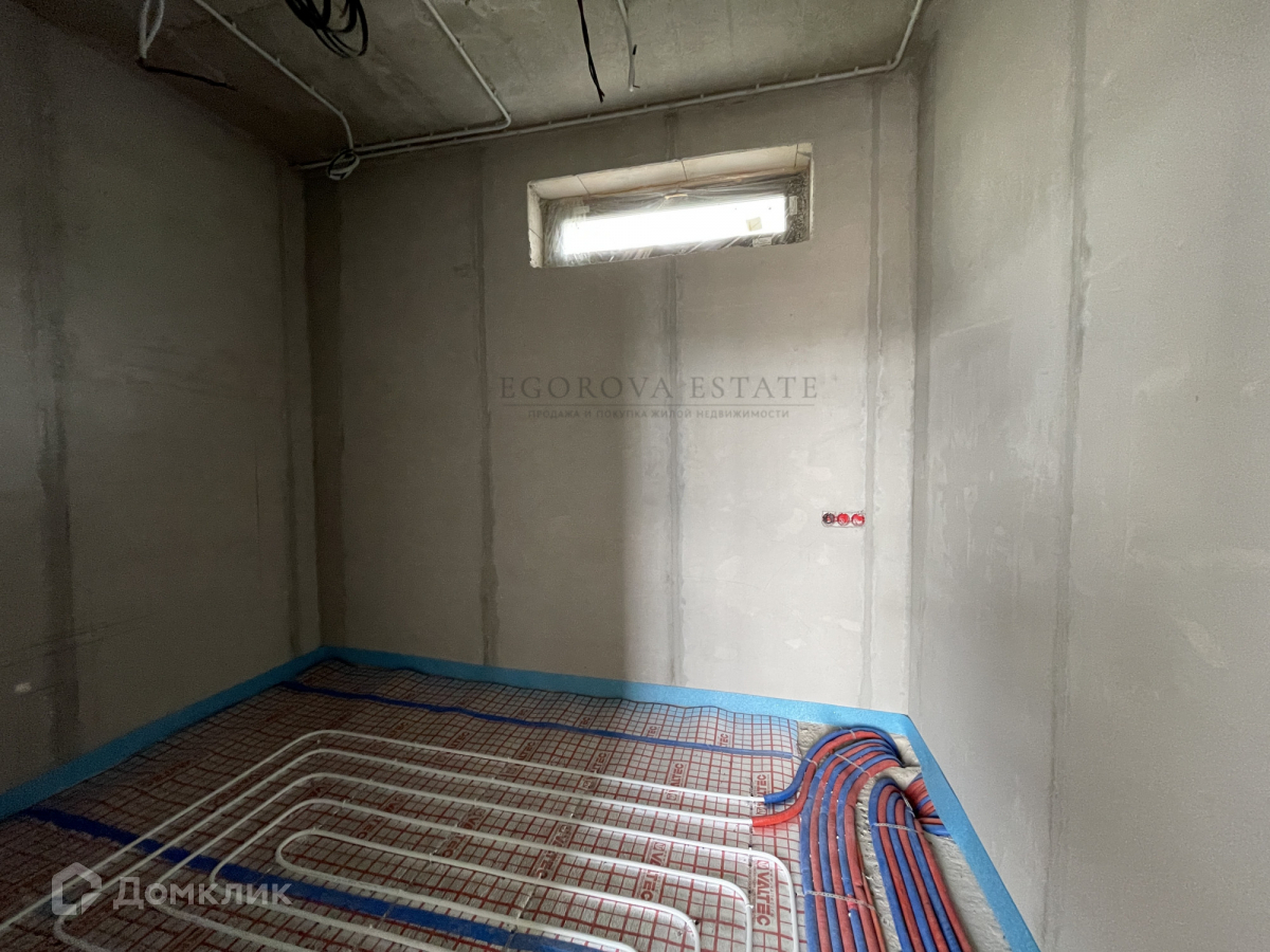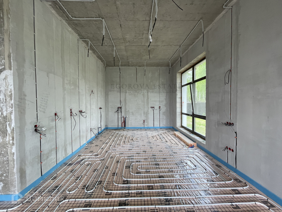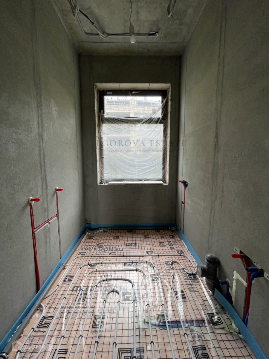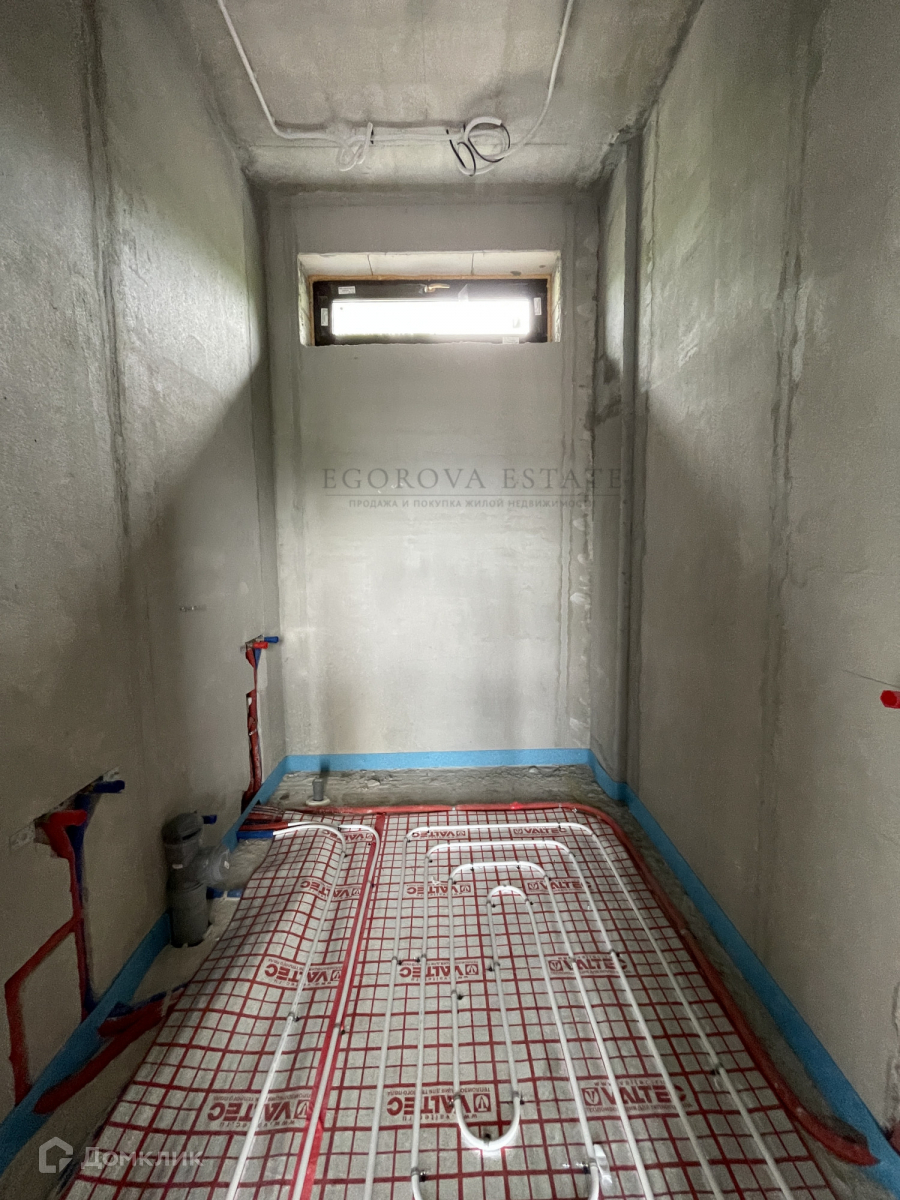 Выполнена разводка сантехники, электрики, установлены теплые полы, стены оштукатурены.
