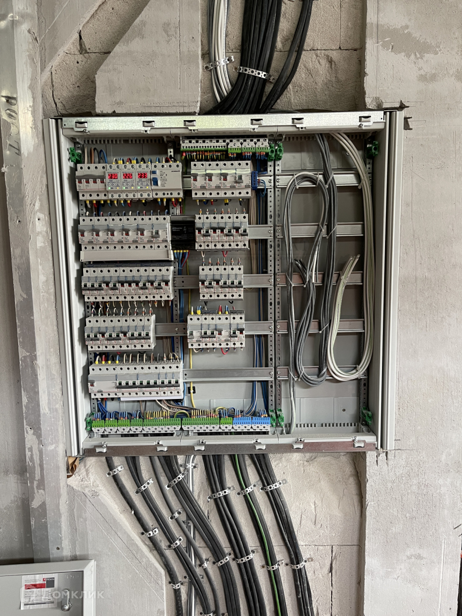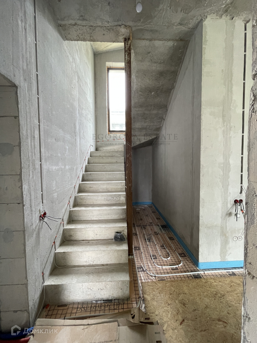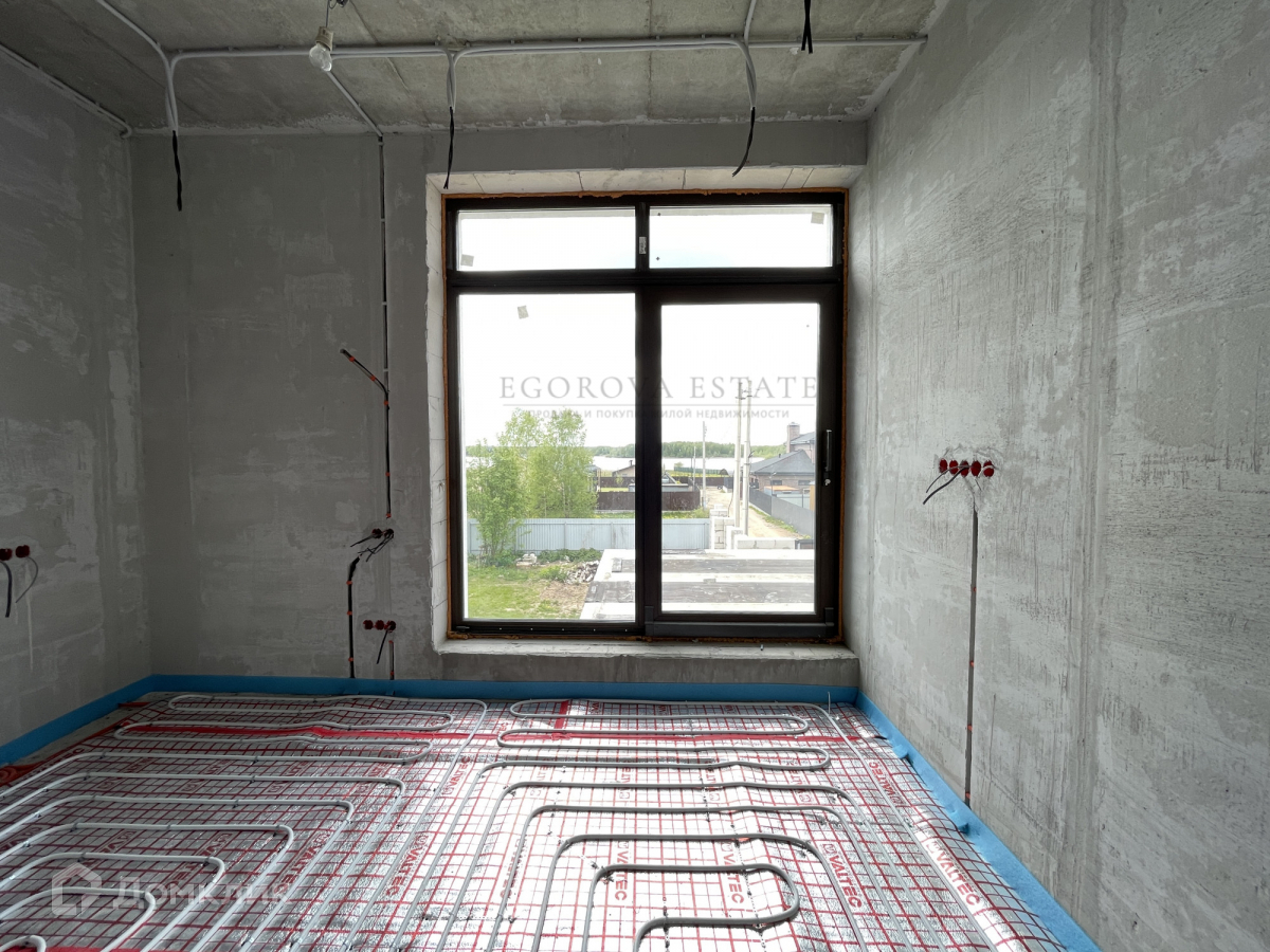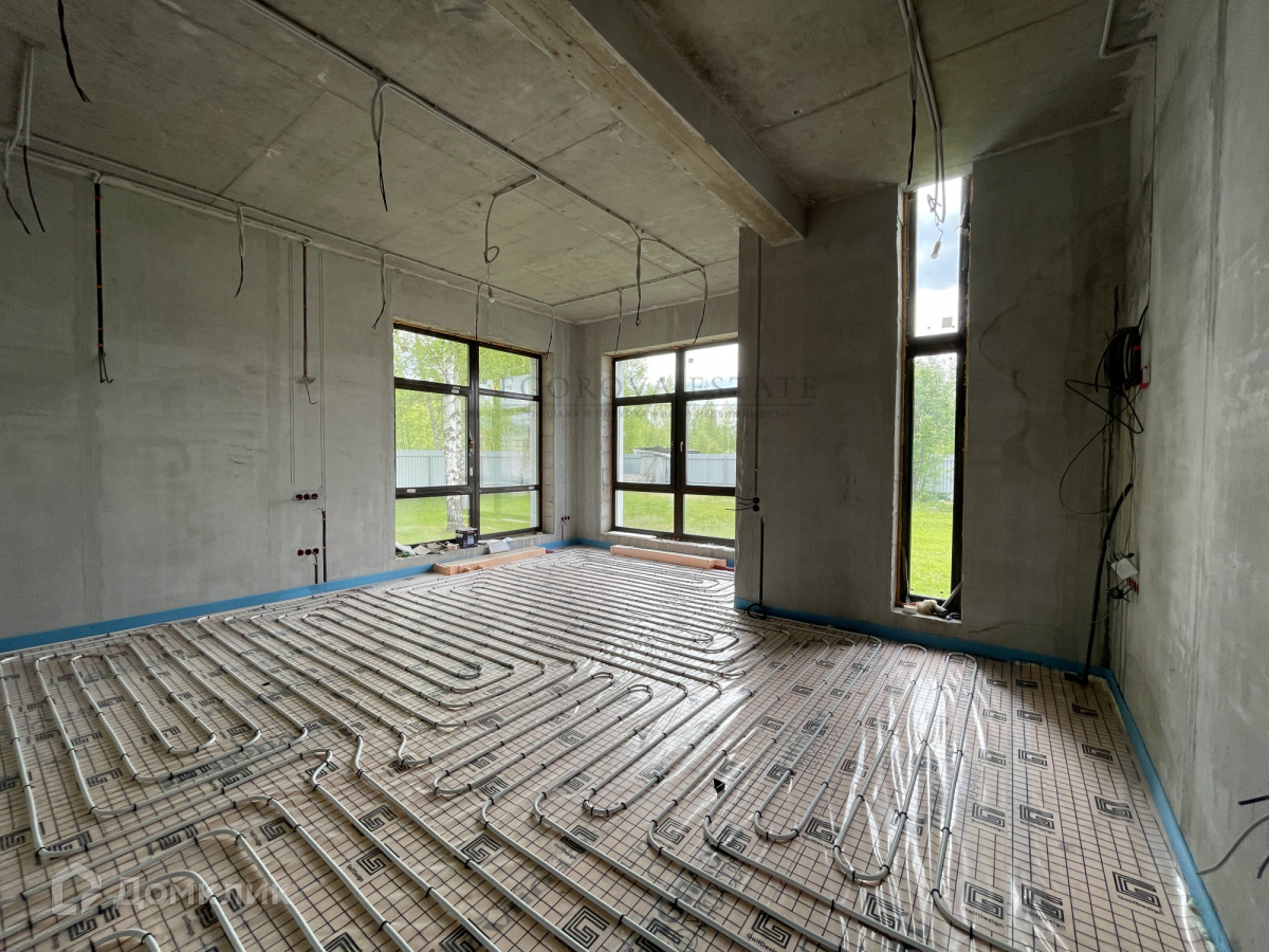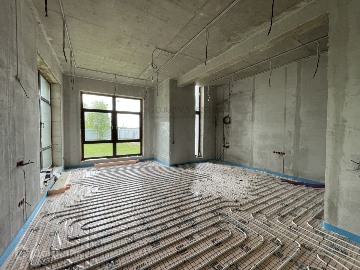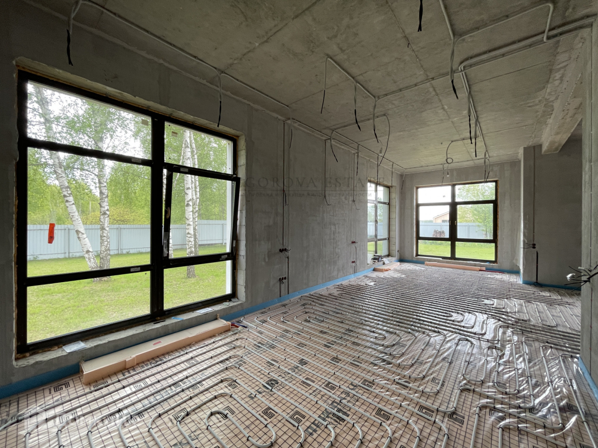 Выполнена разводка сантехники, электрики, установлены теплые полы, стены оштукатурены.