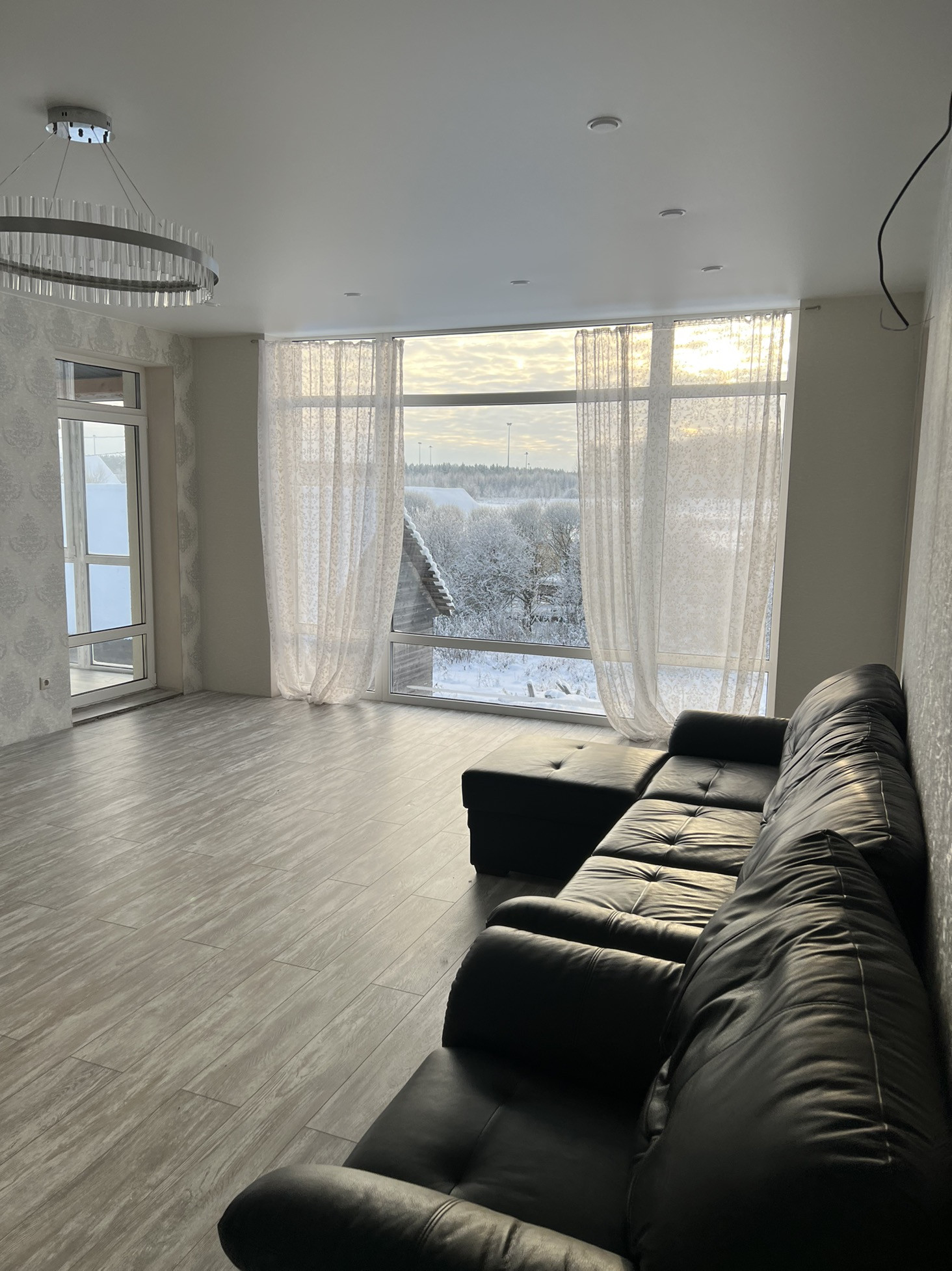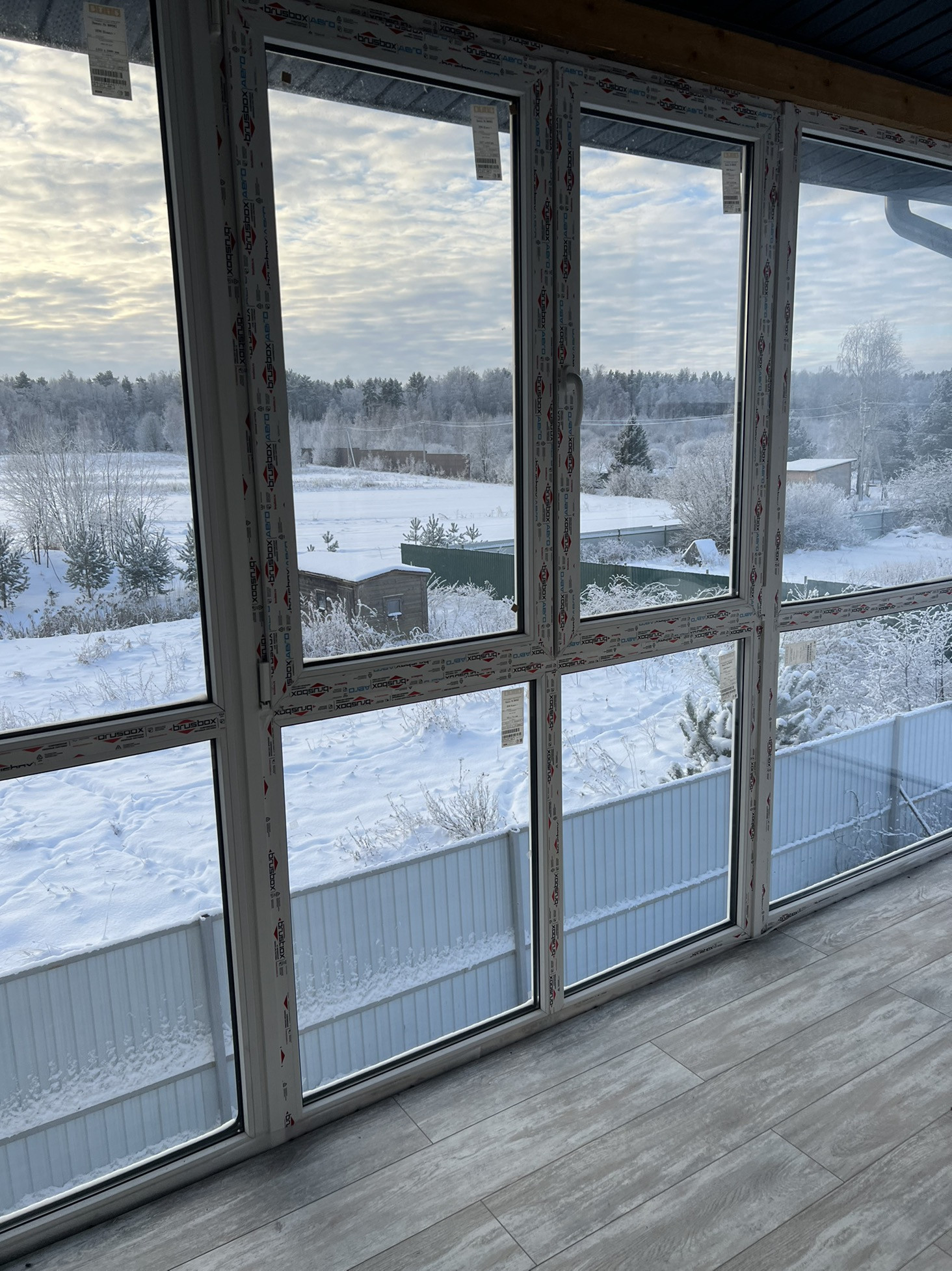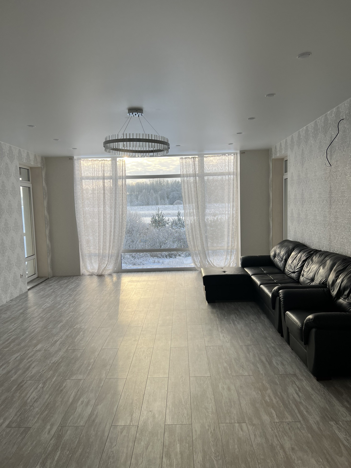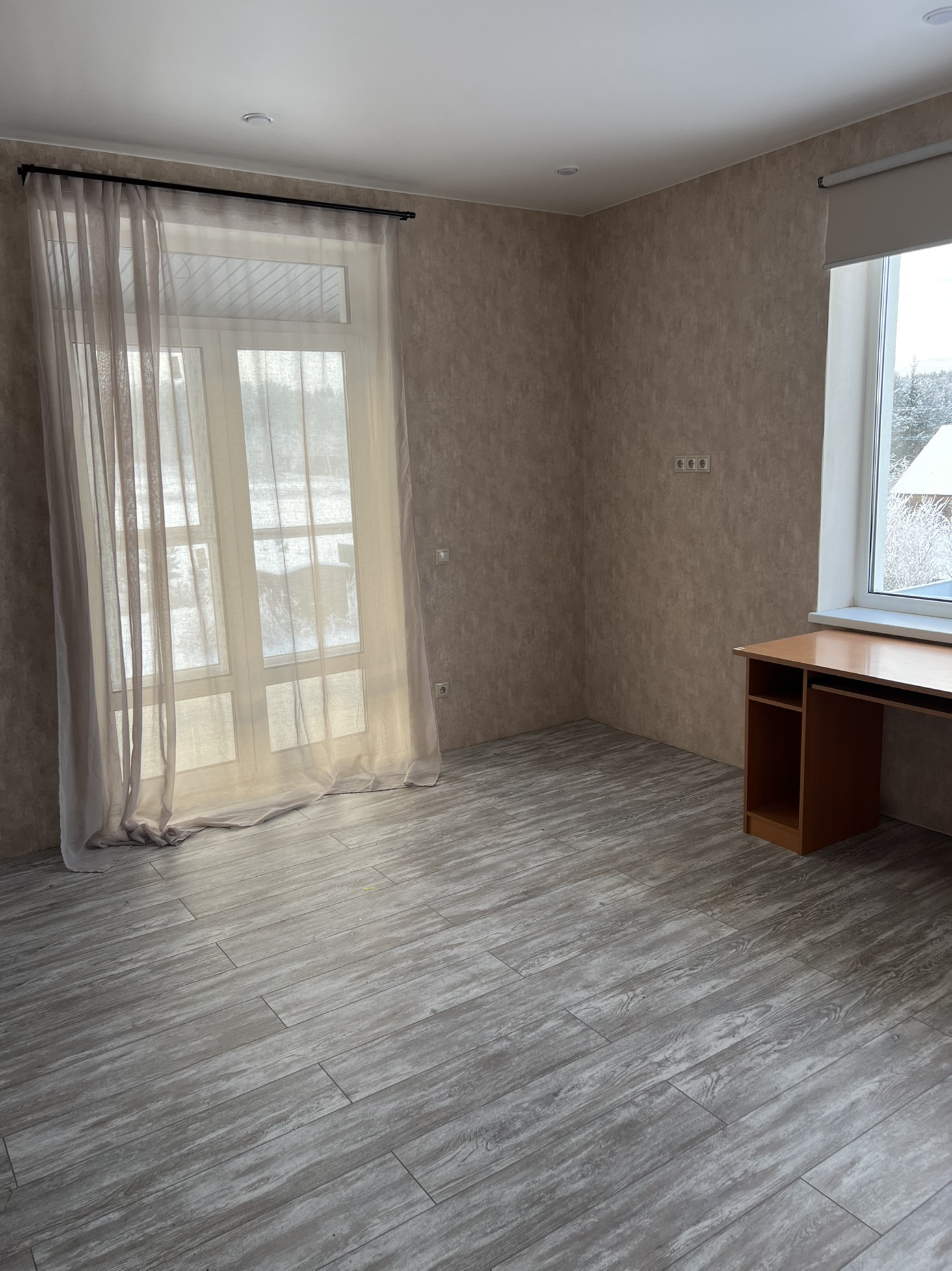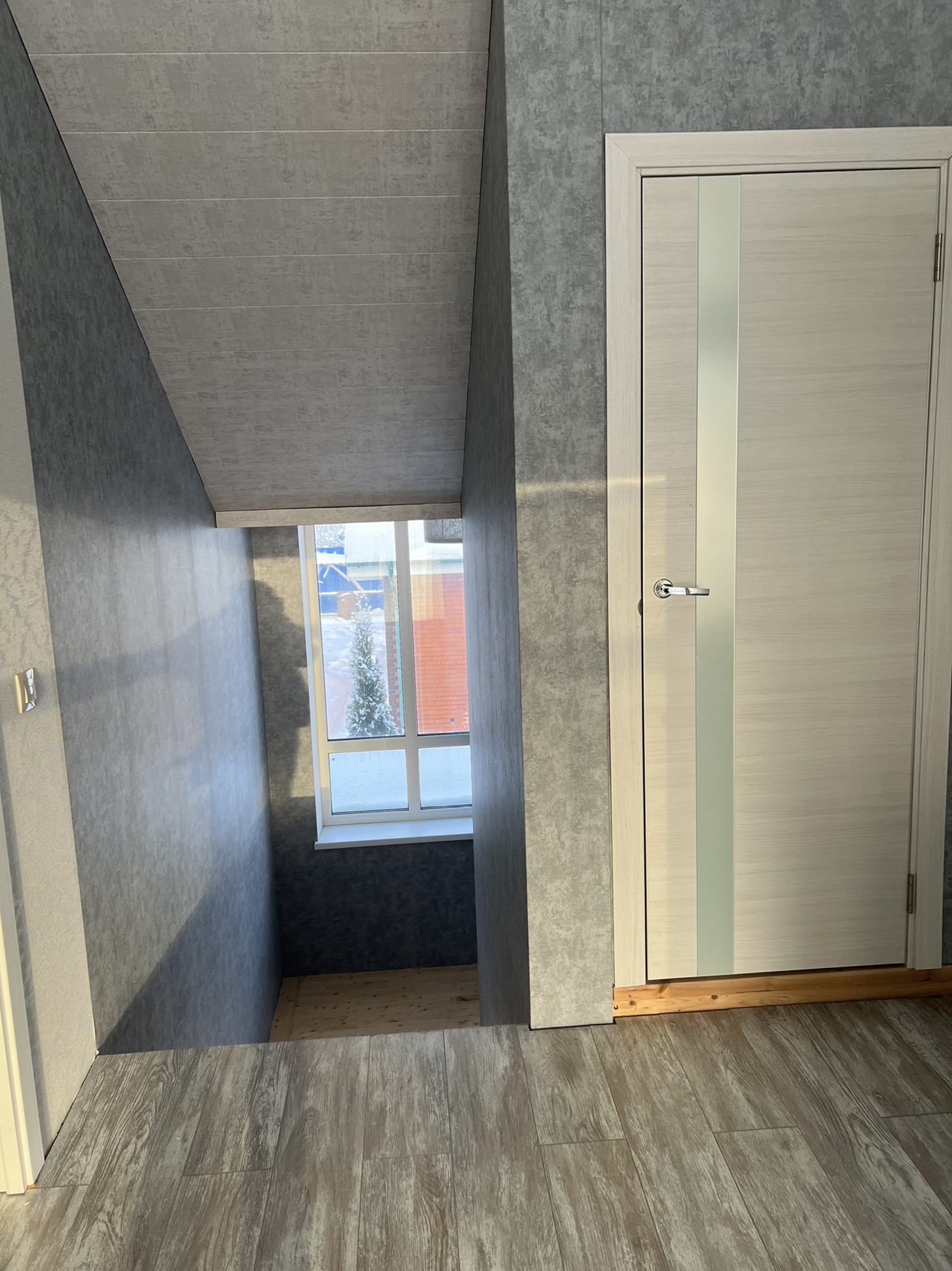 На втором этаже три спальни,большой хол,туалет,ванная и лестница на мансарду.Большие панорамные окна.