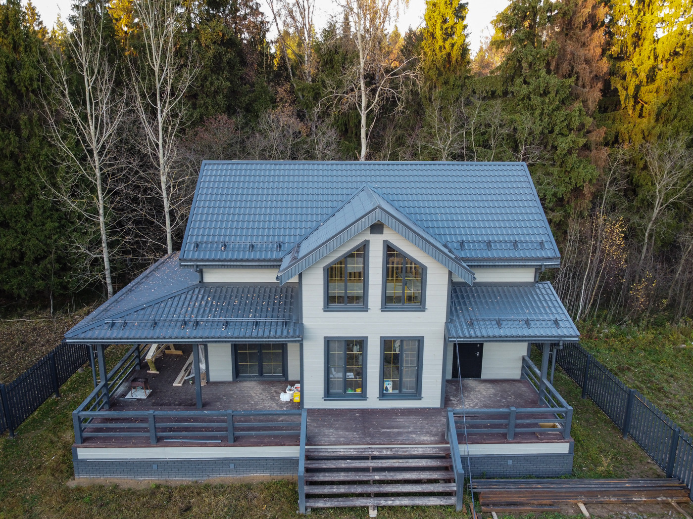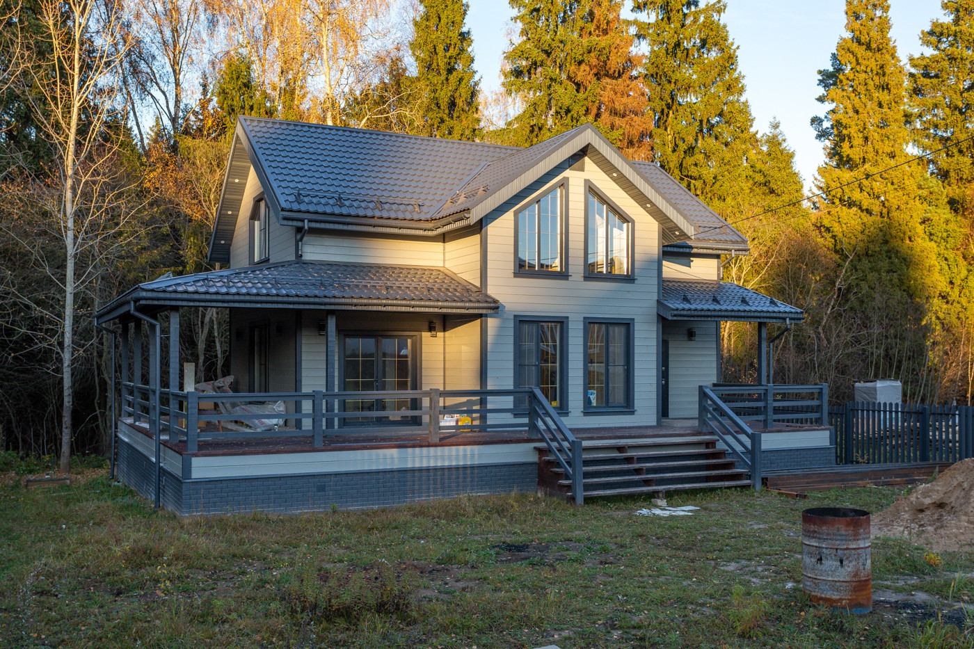 Стильный современный проект и продуманная планировка, пять комнат:просторная гостиная совмещённая с кухней и комната/кабинет на первом этаже. На втором этаже три светлые спальни, гардеробная, на каждом этаже санузлы.