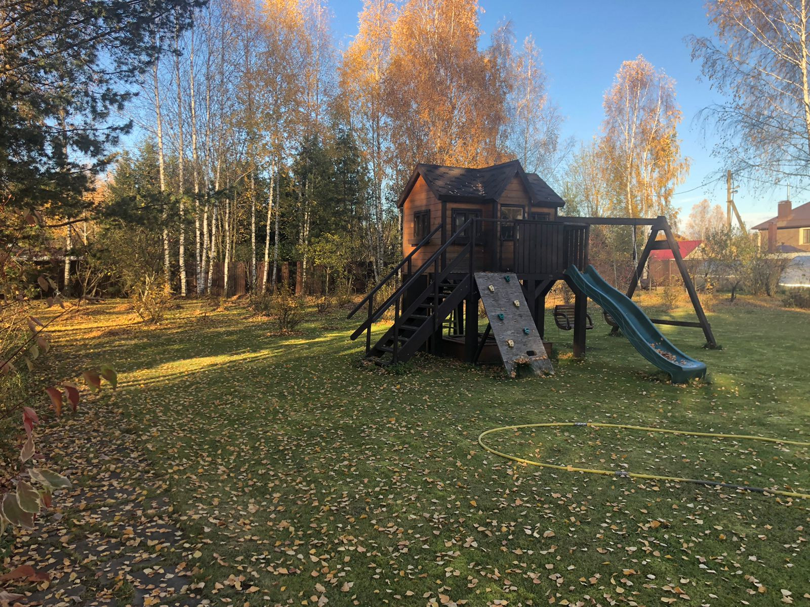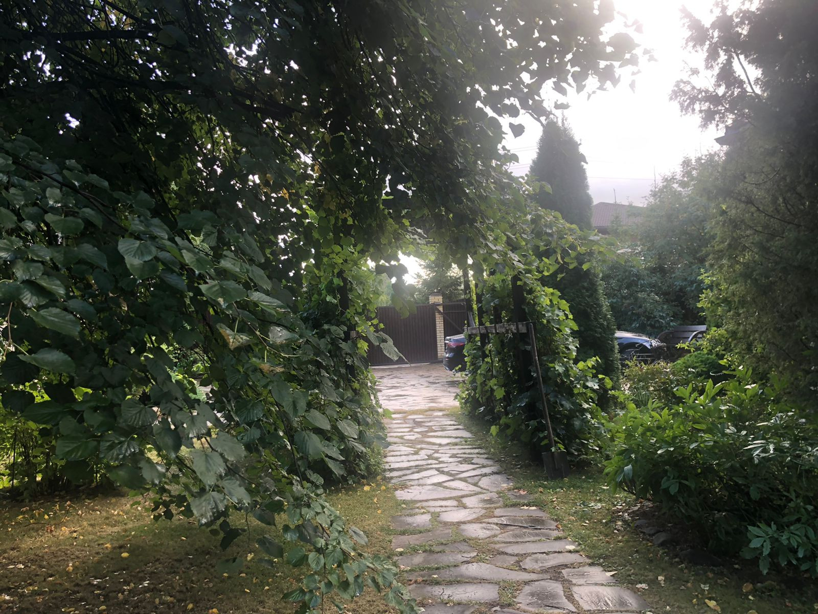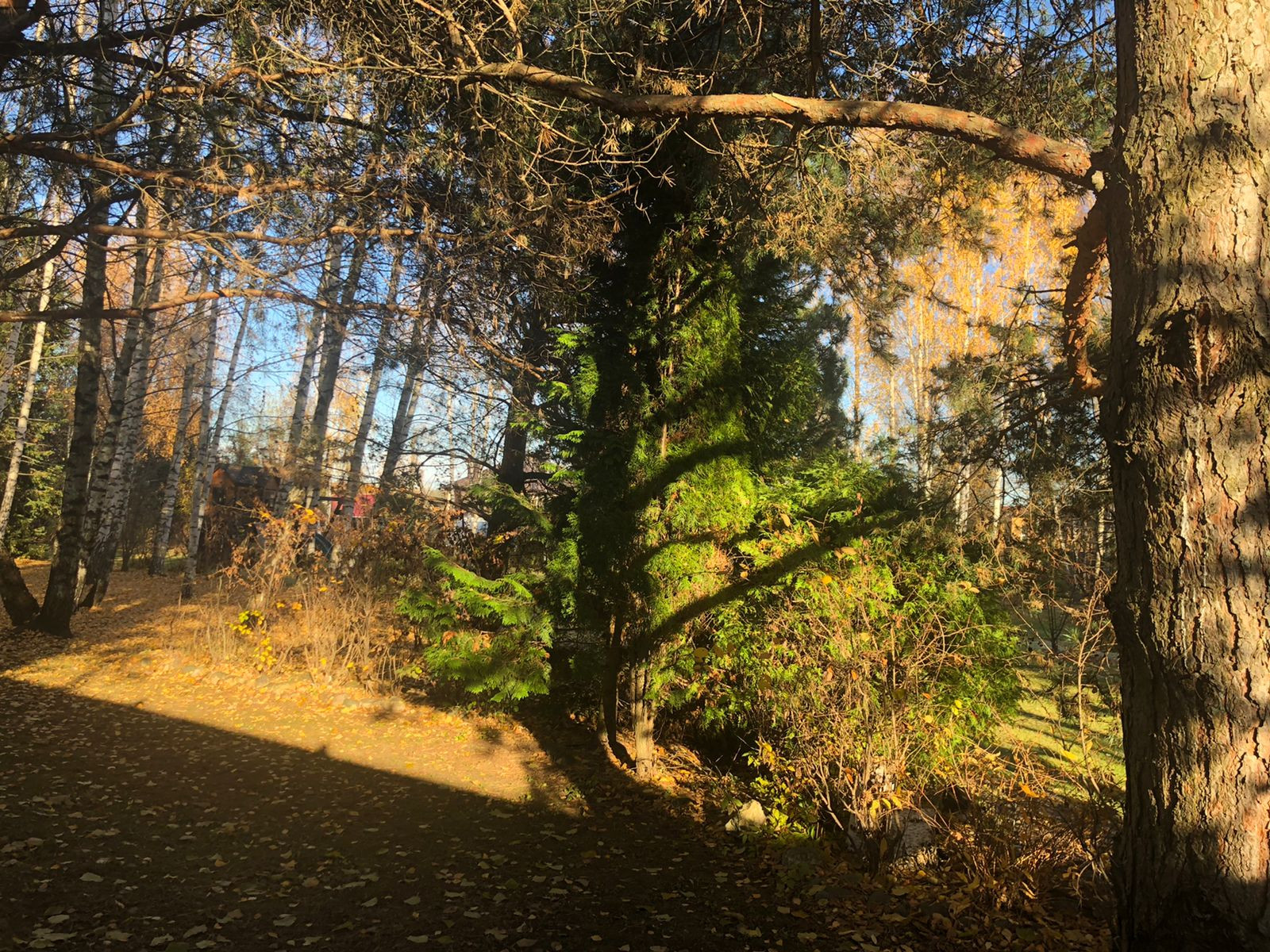 Участок правильной формы, ровный, растут природные деревья, высажены цветы, кустарники.