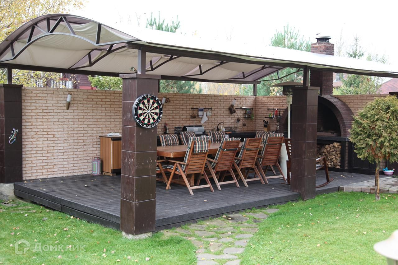 На участке проведен ландшафтный дизайн , беседка с барбекю.