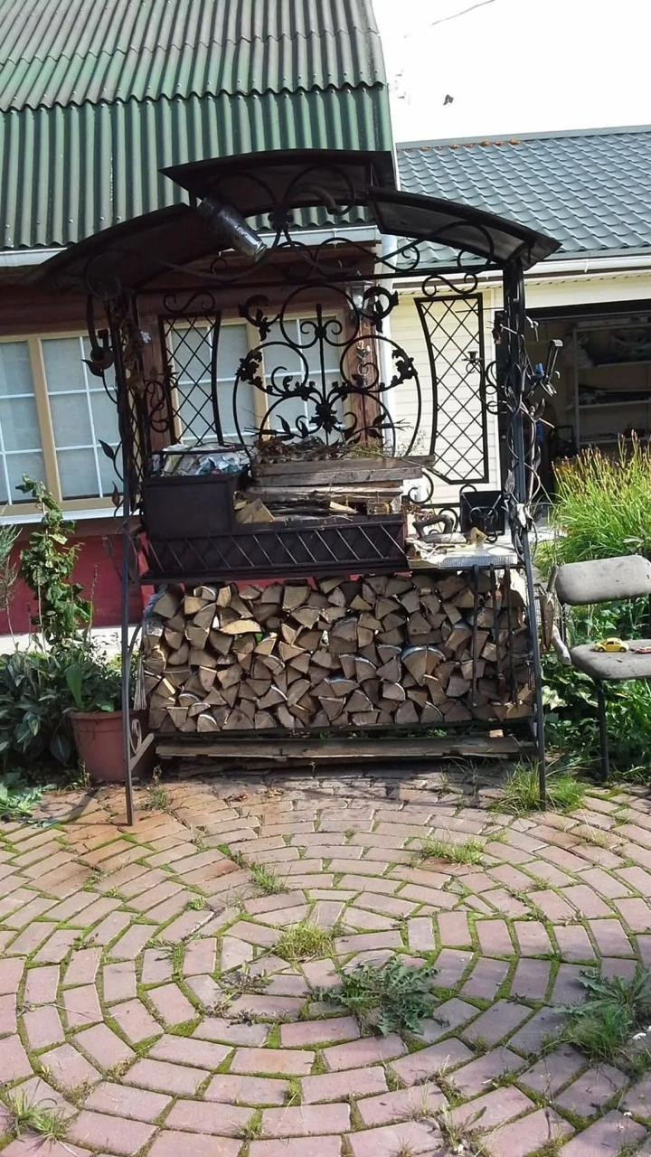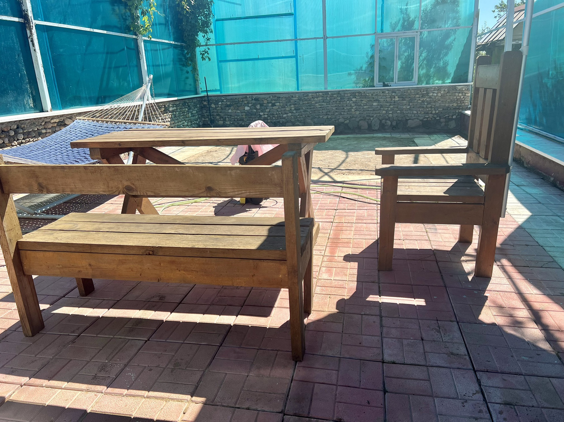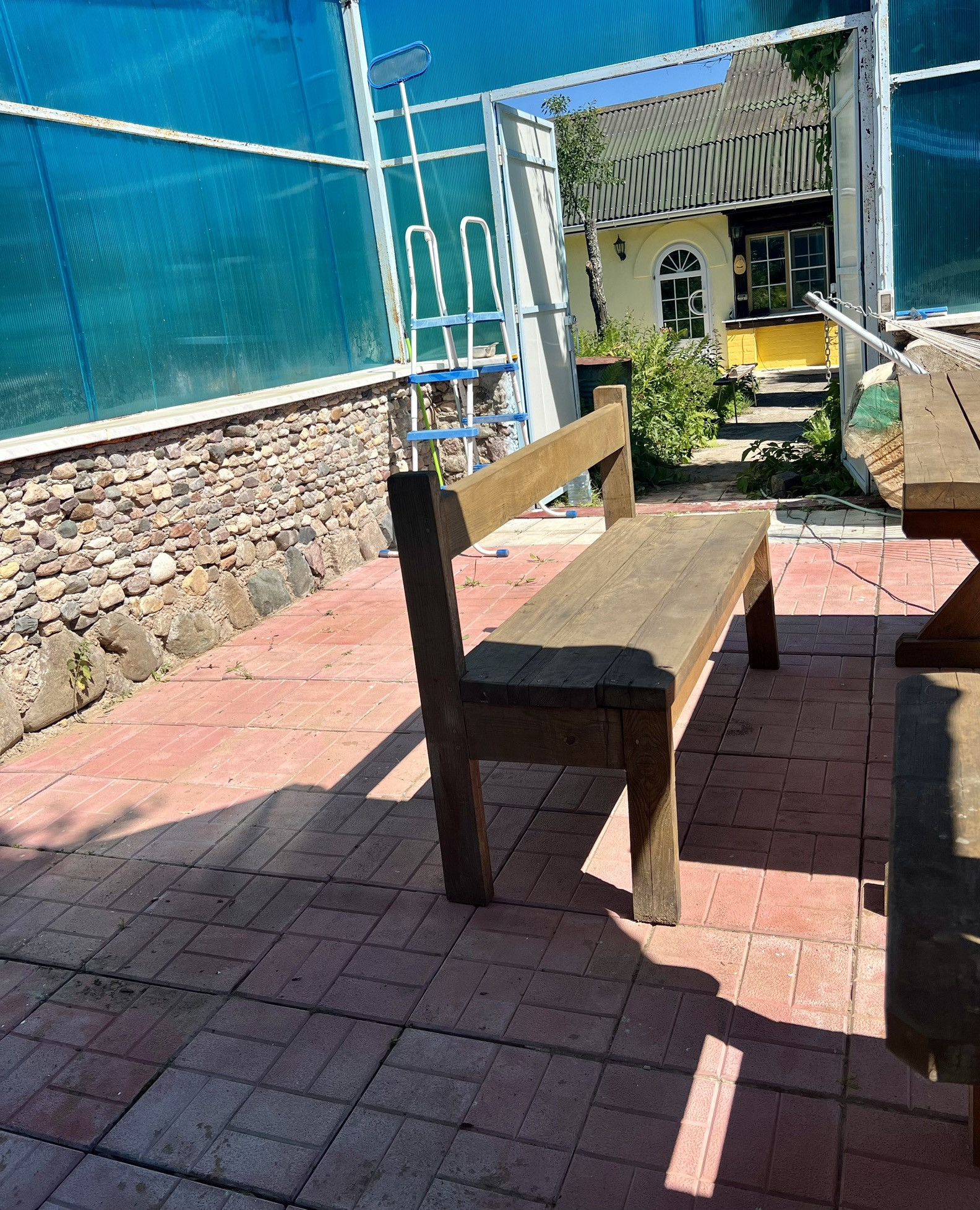 Веранда для бассейна боковые стены из дикого камня пол из брусчатки и бассейн на 36 тон воды, подсобка на ленточном фундаменте и дровница