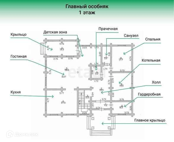 1 этаж – прихожая, холл, спальня, 2 с/у, гостиная, кухня, хоз. помещение.