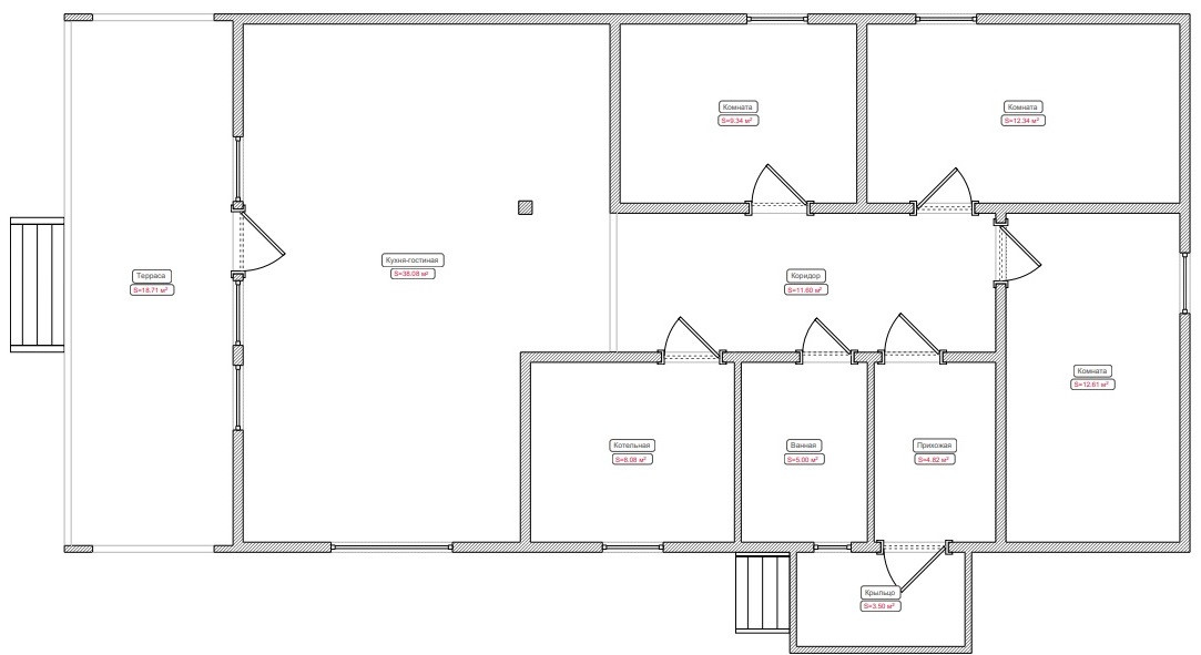 - в доме три спальни, кухня-гостиная, санузел, тамбур и бойлерная.