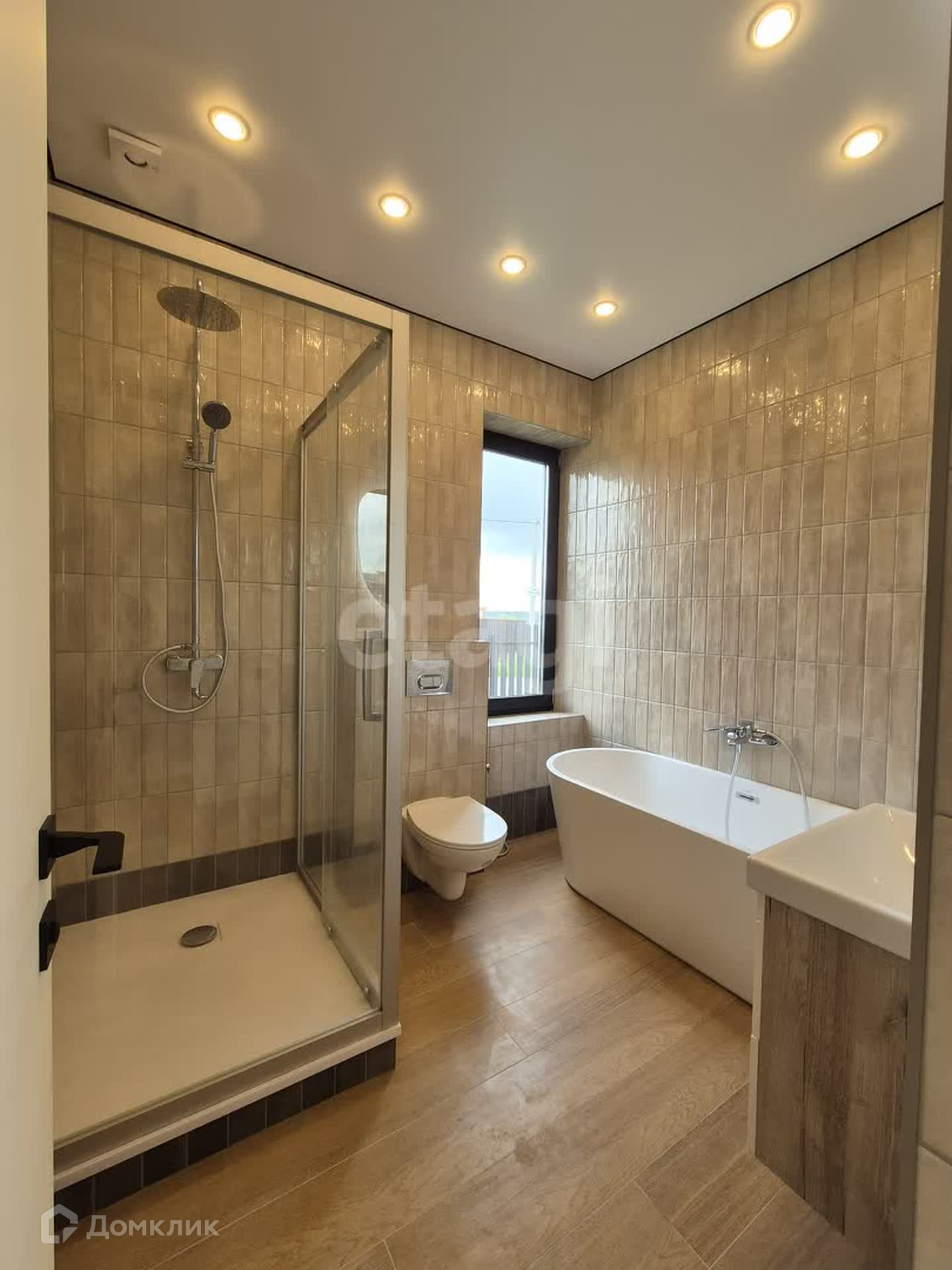 Внутренняя отделка выполняется, на полах будет уложен керамогранит, установлена сантехника, двери скрытого монтажа, смонтированы натяжные потолки с теневым профилем.