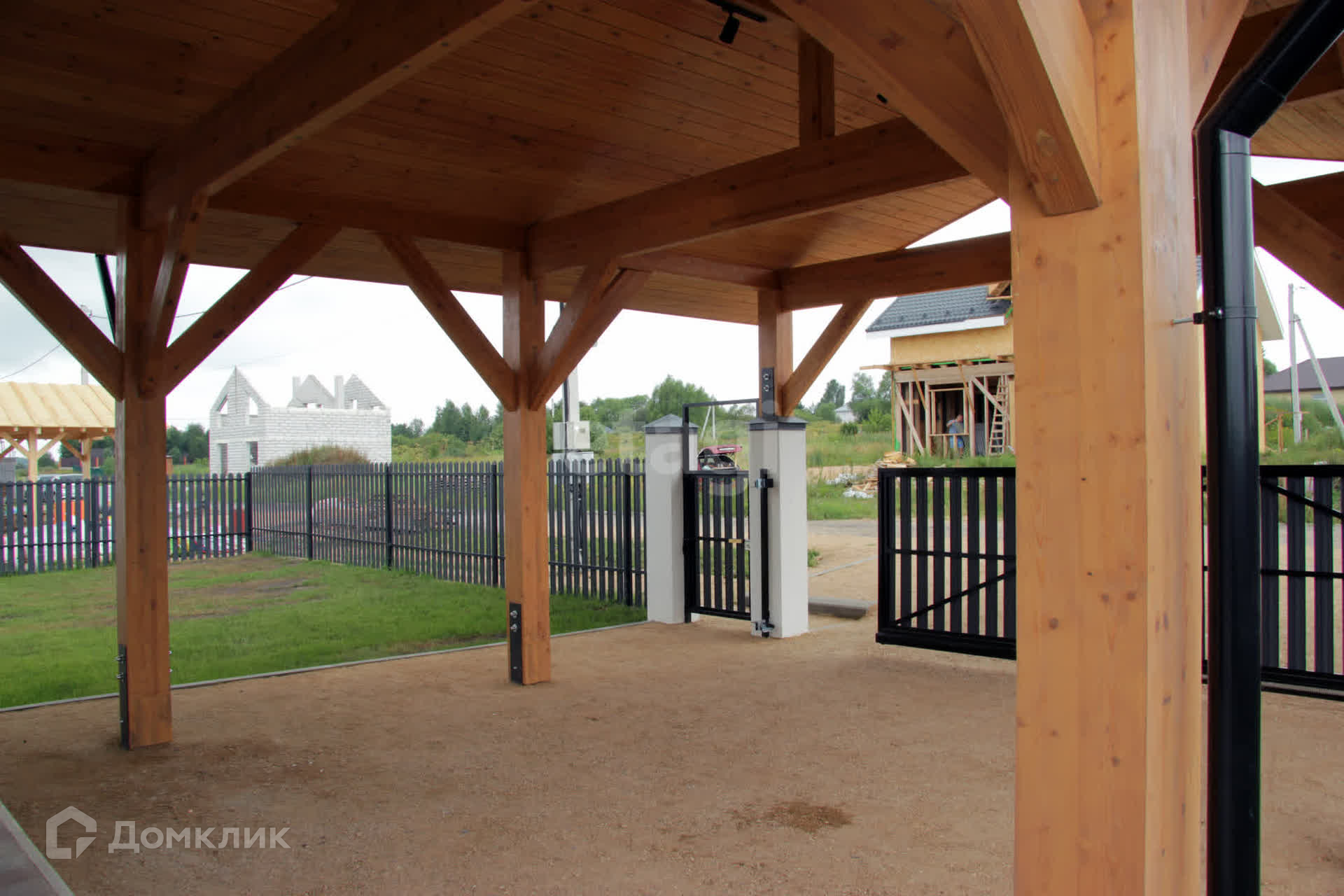 Патио и автомобильный навес выполнены с применение балок из клееного бруса, покрыты немецким маслом Вiоfа. На крыше патио смонтирован прозрачный монолитный поликарбонат.