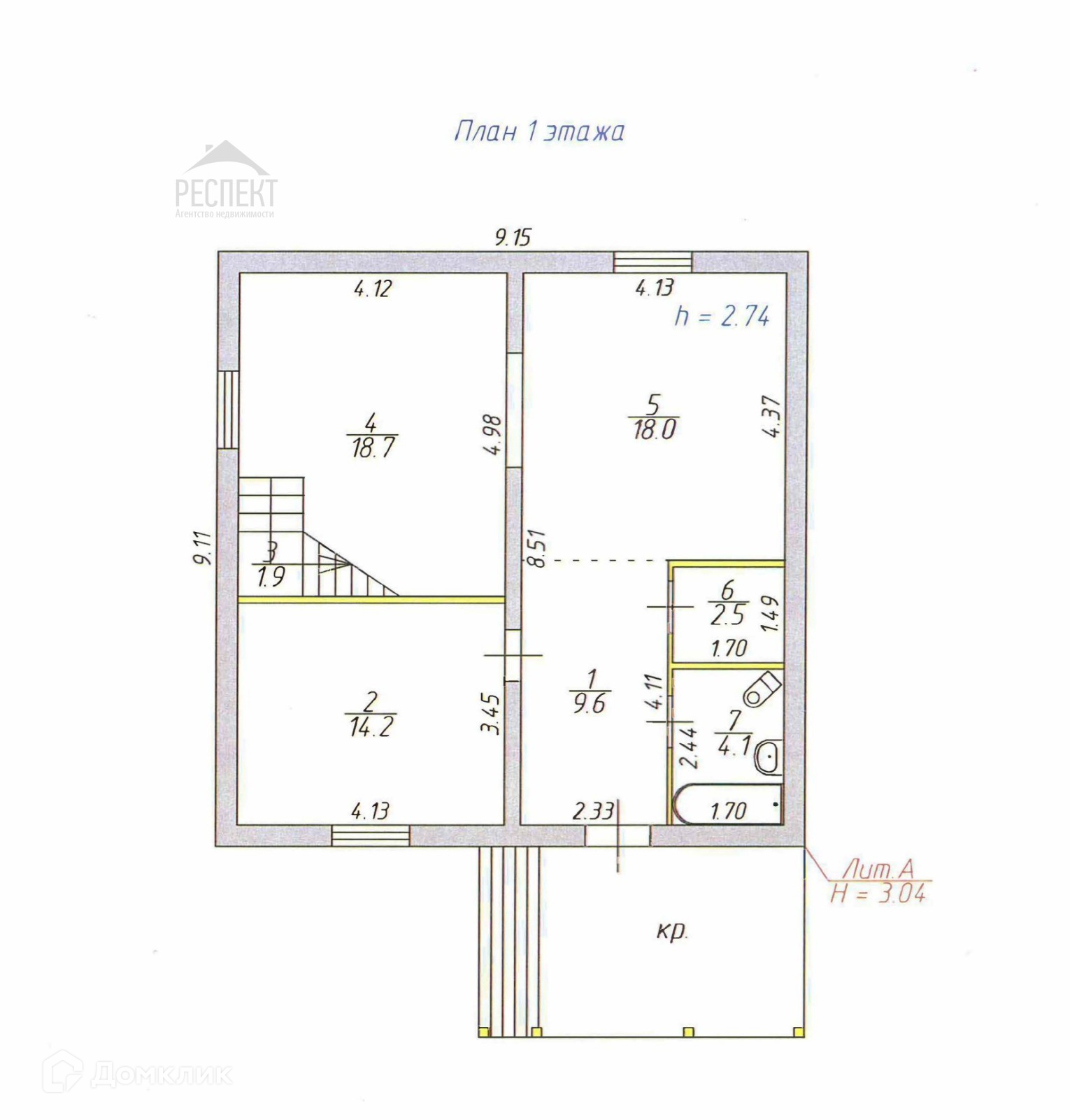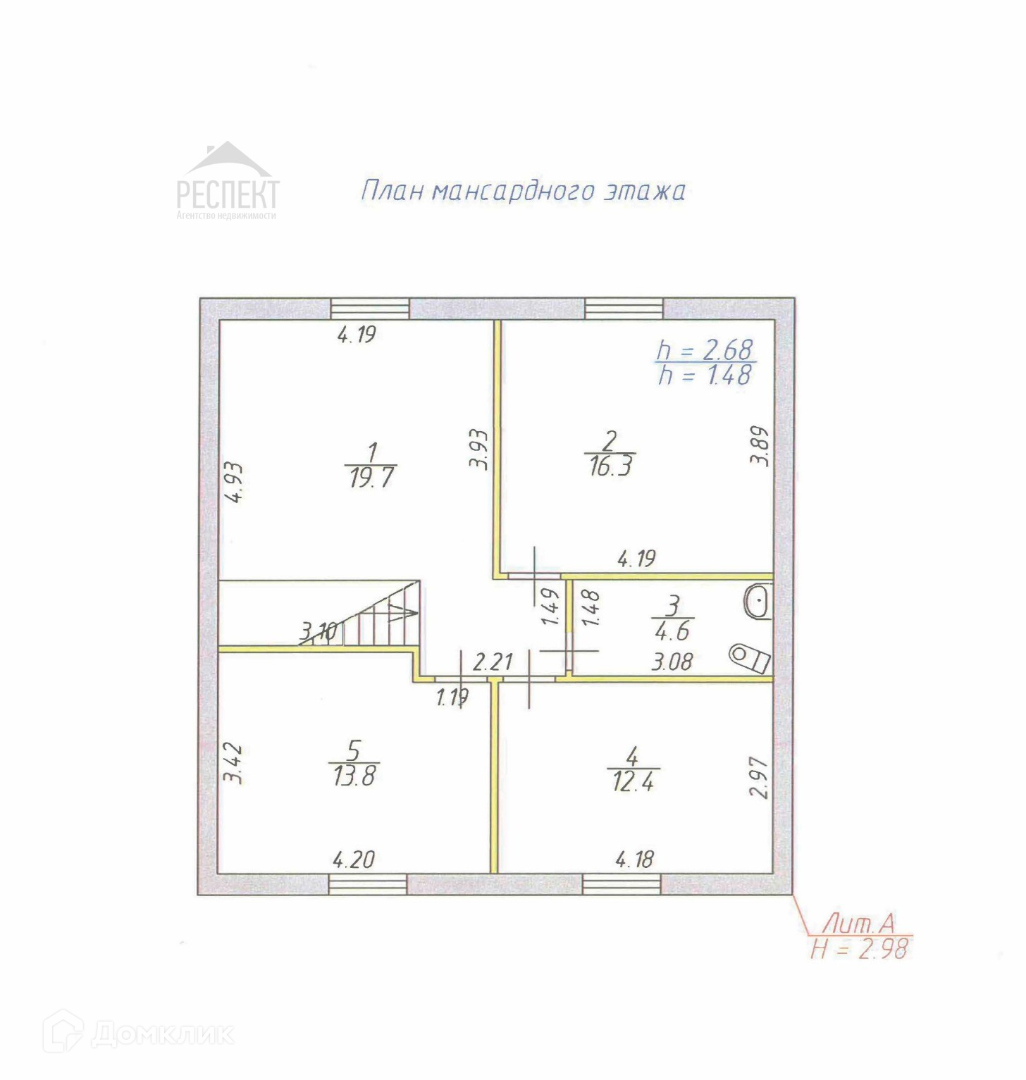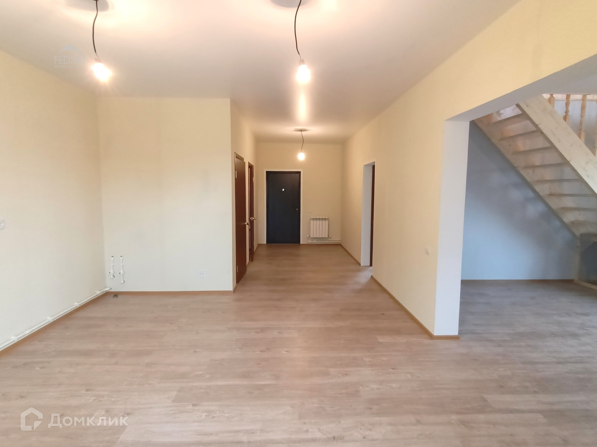 1-й этаж: прихожая, бойлерная, санузел, кухня-гостиная, изолированная комната и просторная комната с лестницей на второй этаж. 2-й этаж: три комнаты, большой холл и второй санузел.