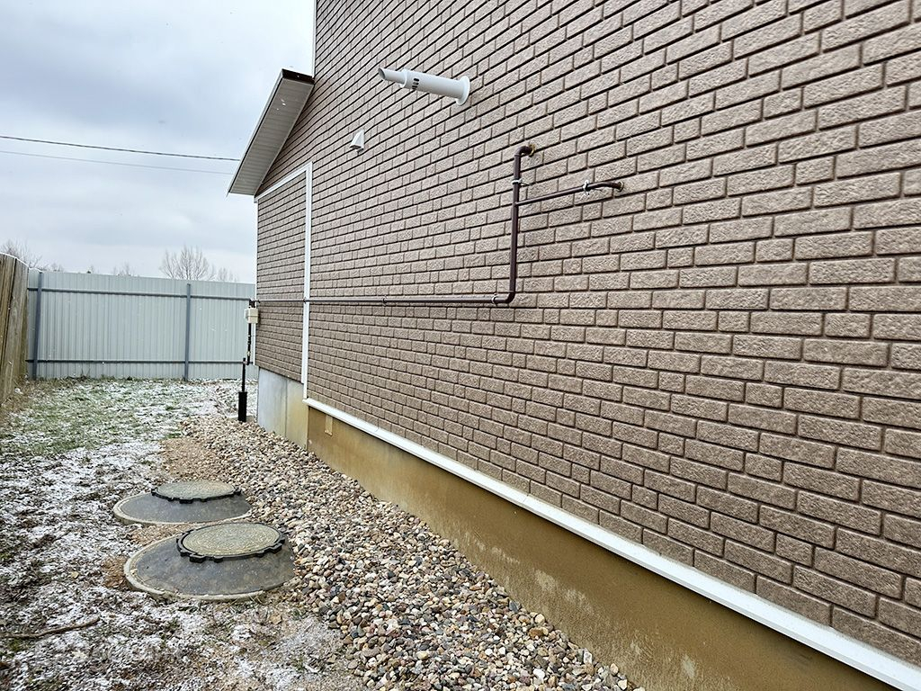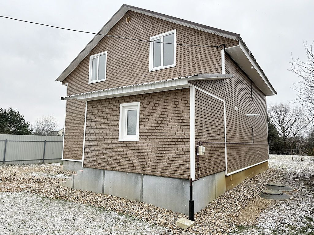 Построен из газосиликатных блоков, снаружи обшит сайдингом.Окна стеклопакеты, крыша металлочерепица. На полу ламинат, линолеум.Дом полностью отделан и готов к проживанию.1 этаж: прихожая, кухня-гостиная, спальня, санузел, бойлерная.2 этаж: 3 спальни, холл, санузел.Коммуникации: Магистральный газ, электричество 380 В (15кВт), водоснабжение - скважина, канализация - септик.