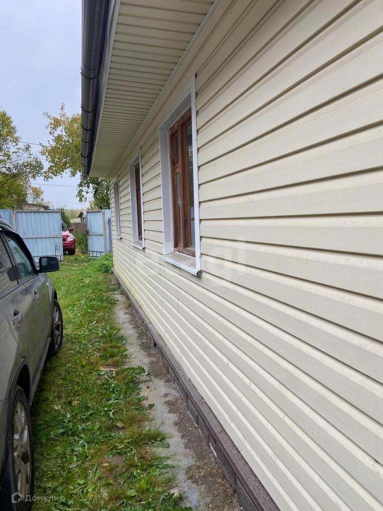 Фундамент ленточный с отмосткой, основная часть дома из бревна, облицовка сайдингом. На окнах новые деревянные рамы, железная дверь.