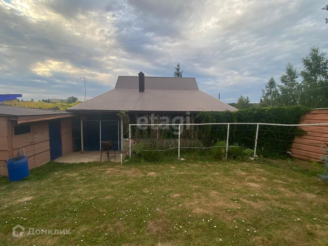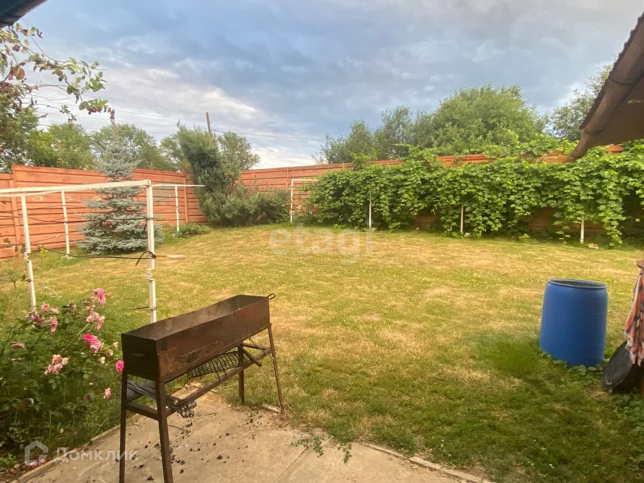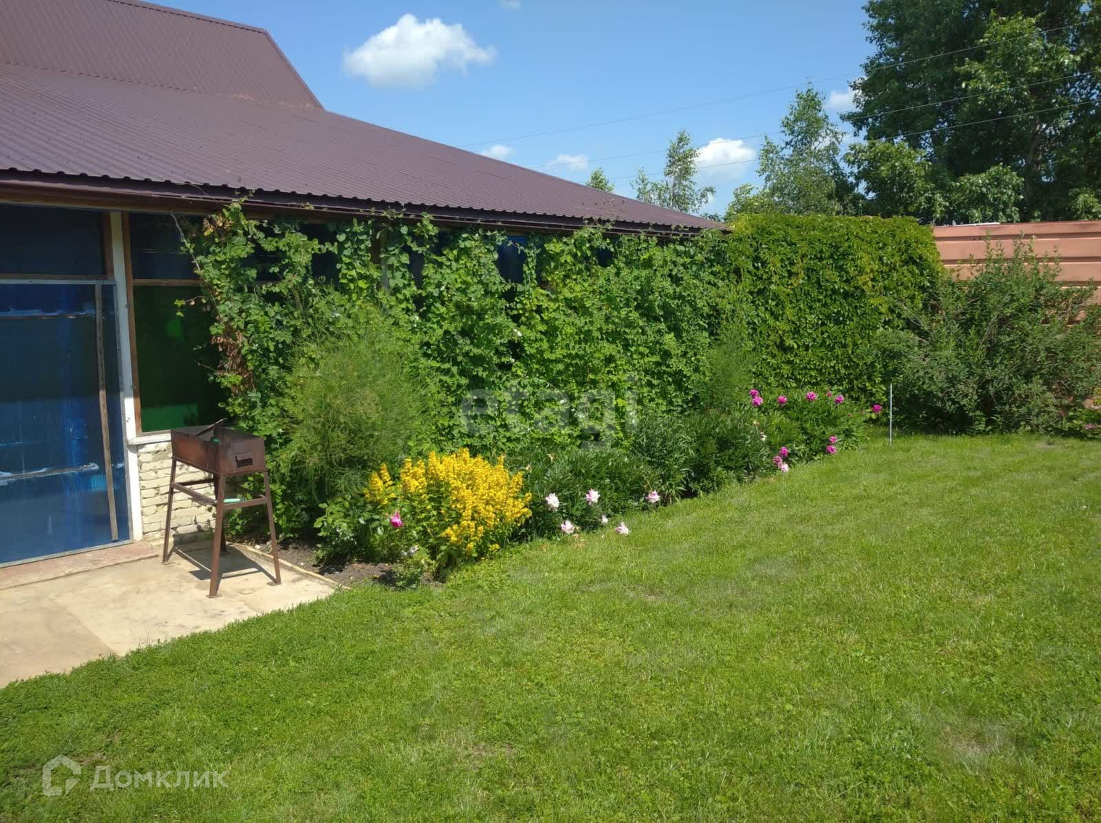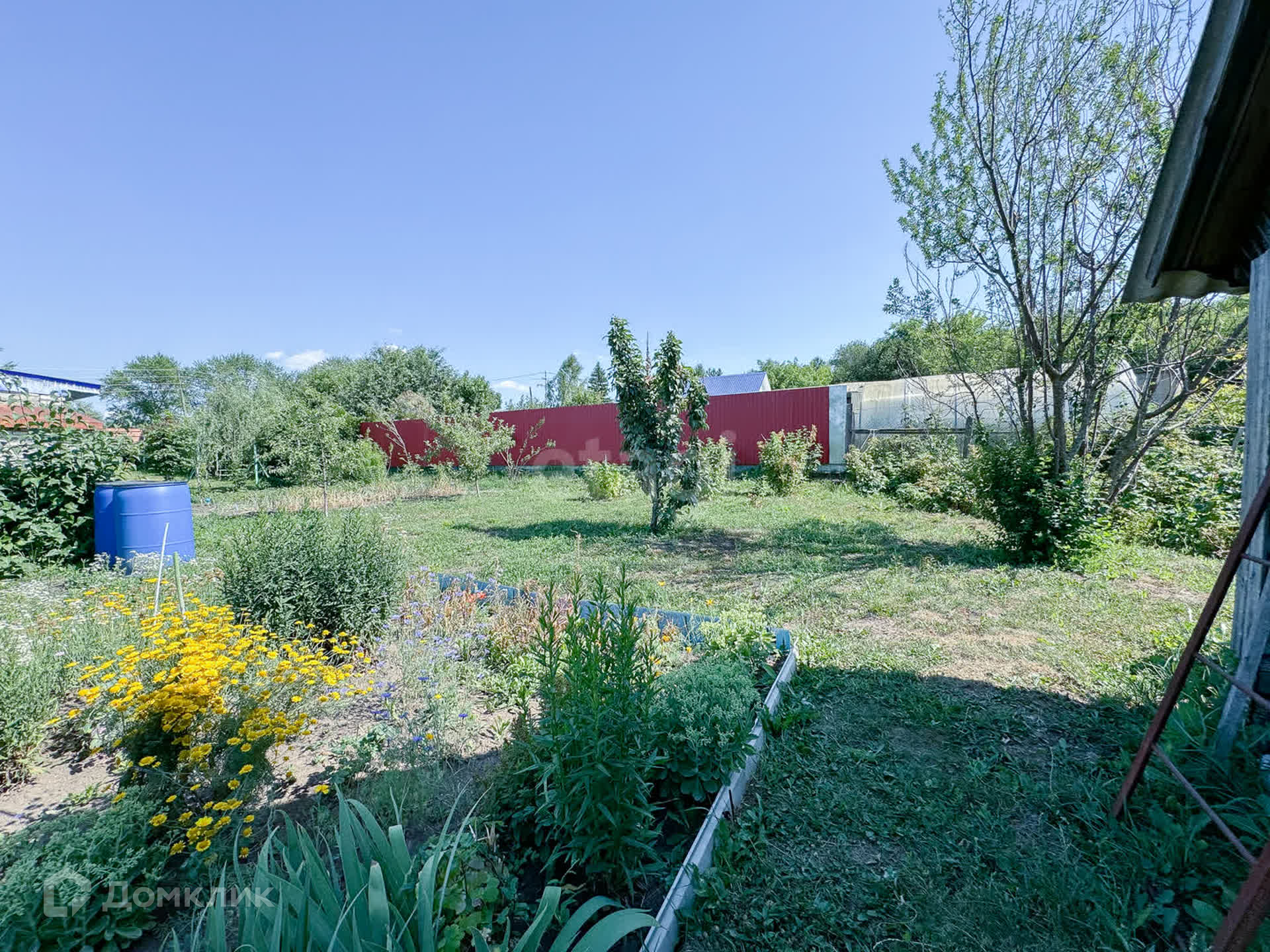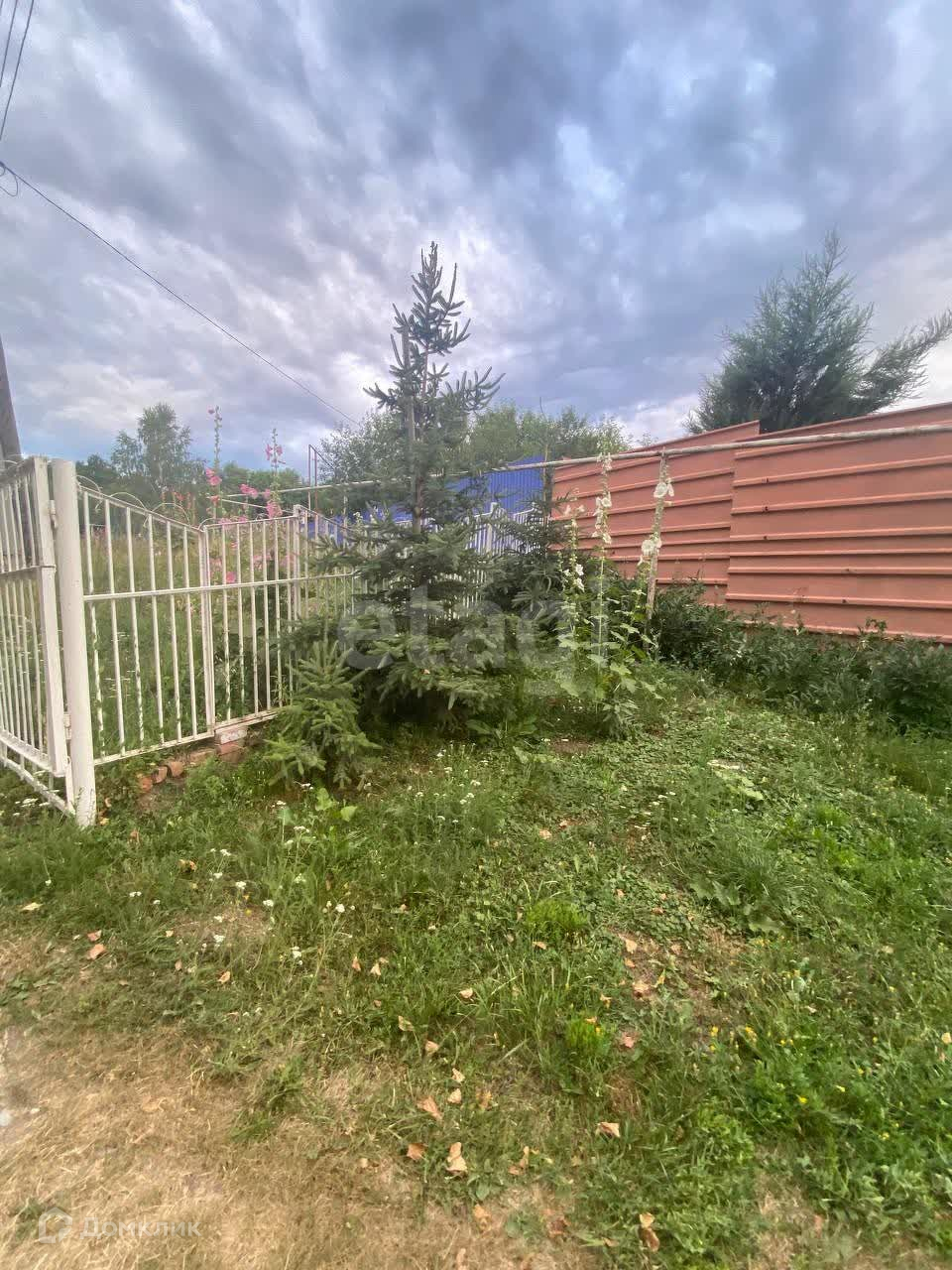 Перед домом территория огорожена (закрывается воротами), посажены ели, березы, липы, клен, калина.