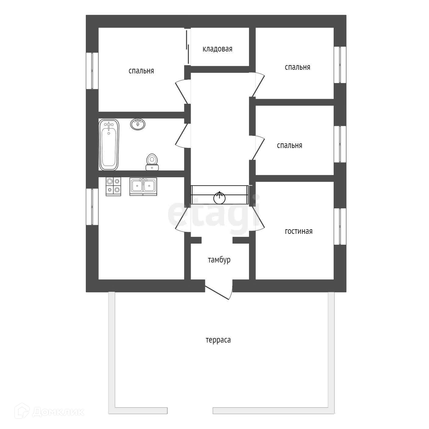 Дом площадью 81 кв. м., добротный, построенный из кирпича, с качественным фундаментом, подвал под всем домом (возможно использовать как гараж). Высокие потолки. Четыре комнаты, кухня, кладовая, небольшой тамбур, просторный санузел.