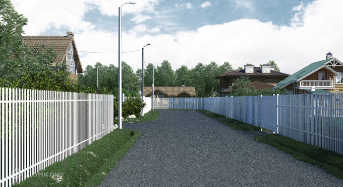 посёлок оформляется в едином стиле с помощью одинаковых заборов на всех участках, что позволяет приобрести ухоженный и стильный вид. .