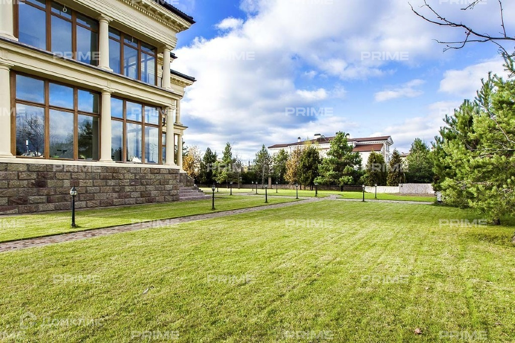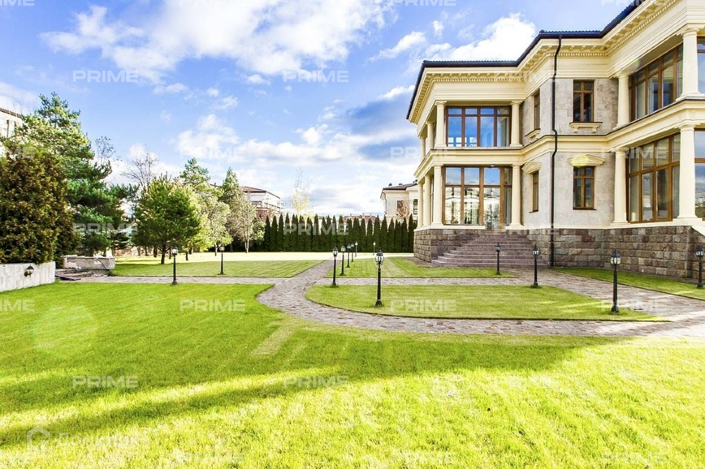 Особняк аккуратно вписан в благоустроенную парковую территорию участка с высаженным ровным газоном, стройными елями и соснами, мощеными дорожками вдоль которых выполнено красивое уличное освещение.