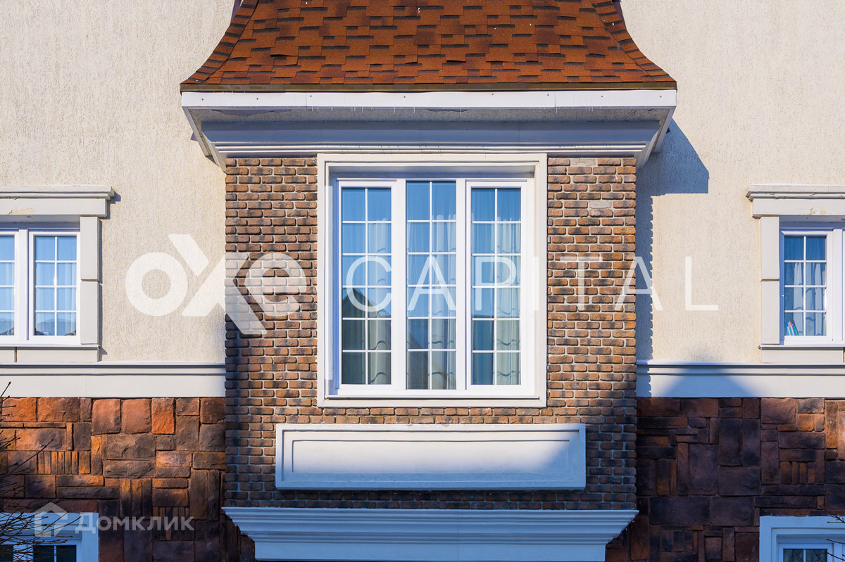 Фасад облицован бежевой штукатуркой и коричневой клинкерной плиткой.