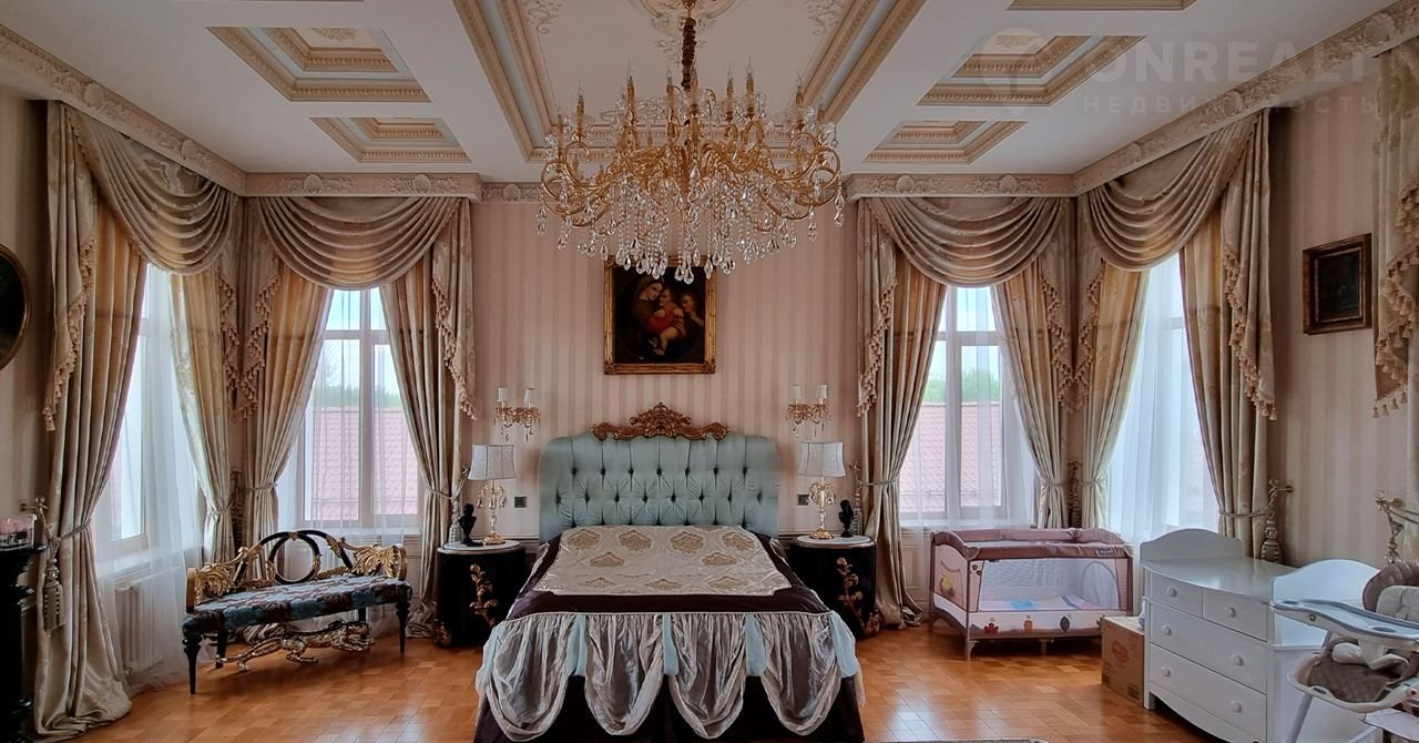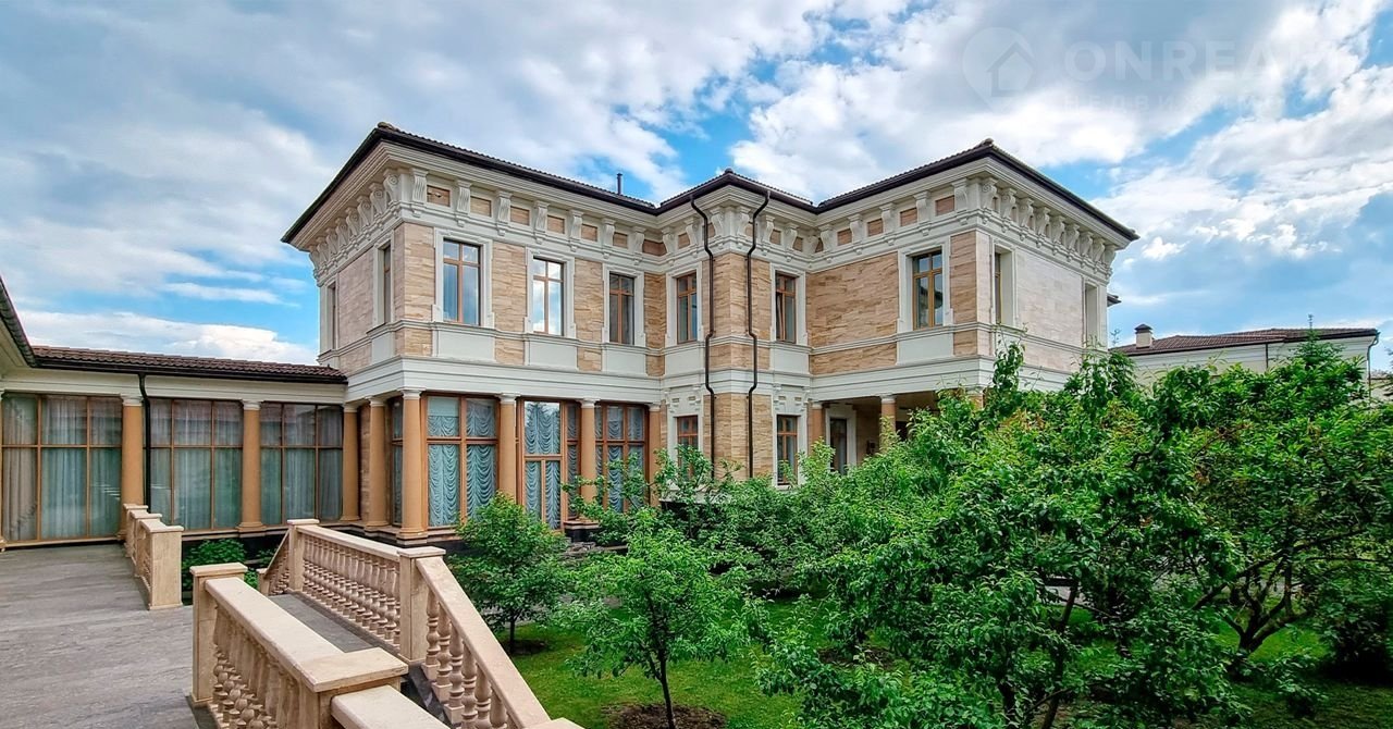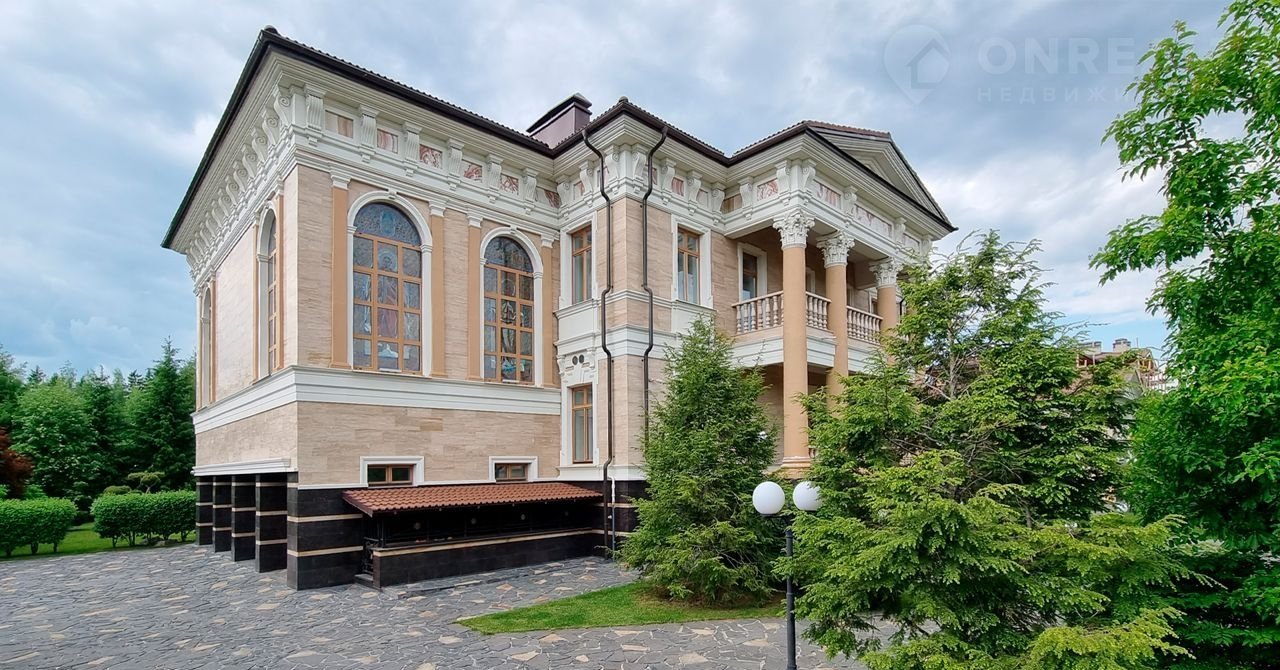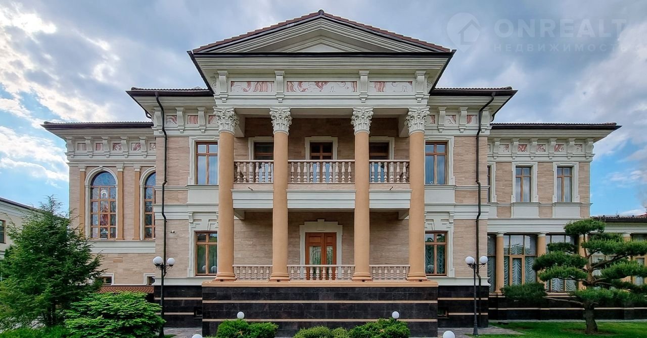 ID 10 402. Монолит. Просторный загородный особняк площадью 1850 м² расположен на полевом участке 40 соток. Бежевый фасад с колоннами и резными капителями, балясинами и наличниками выполнен в классическом стиле. В оформлении интерьера в теплой палитре оттенков использованы лепнина, позолота, витражи, колонны и полуколонны. В резиденции спланировали 4 спальни, каминный зал, гостиную, кухню, столовую, кабинет-библиотеку со вторым светом, SPA-зону с русской баней, инфракрасной сауной и купелью, бассейн, профессиональную соляную комнату. Предусмотрен гараж на 4 машины и квартира для персонала с отдельным входом. На участке выполнен ландшафтный дизайн, высажены садовые деревья и кустарники, вымощены дорожки, оборудовано уличное освещение.