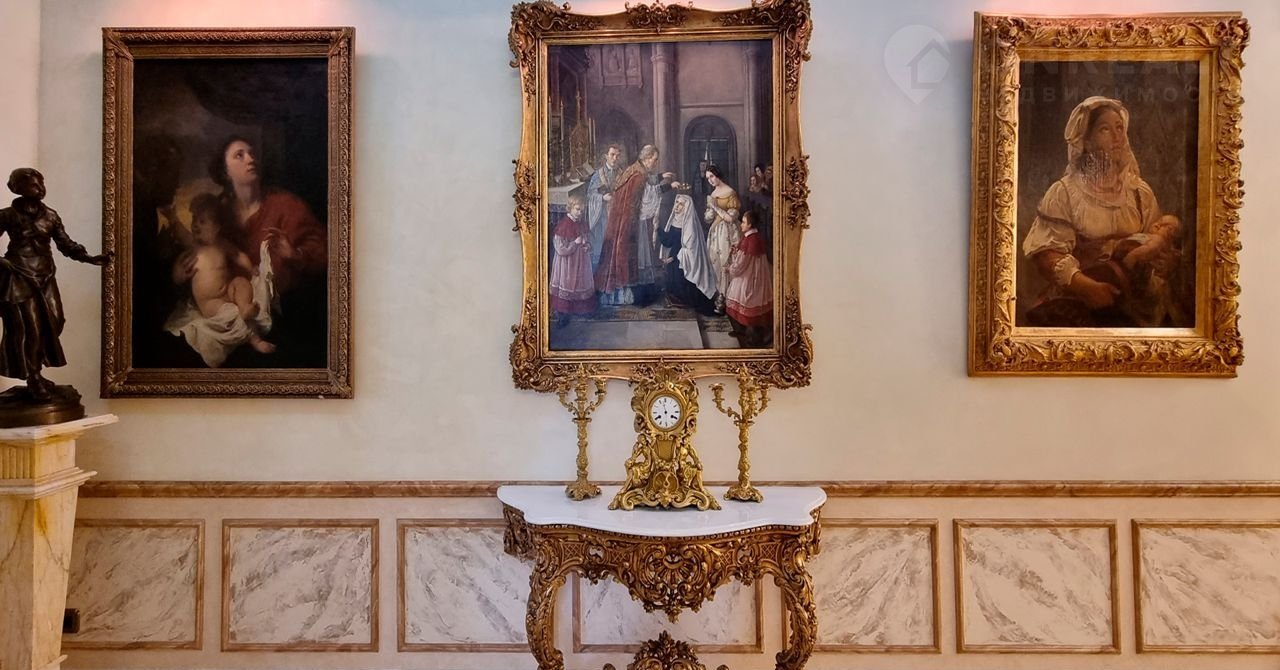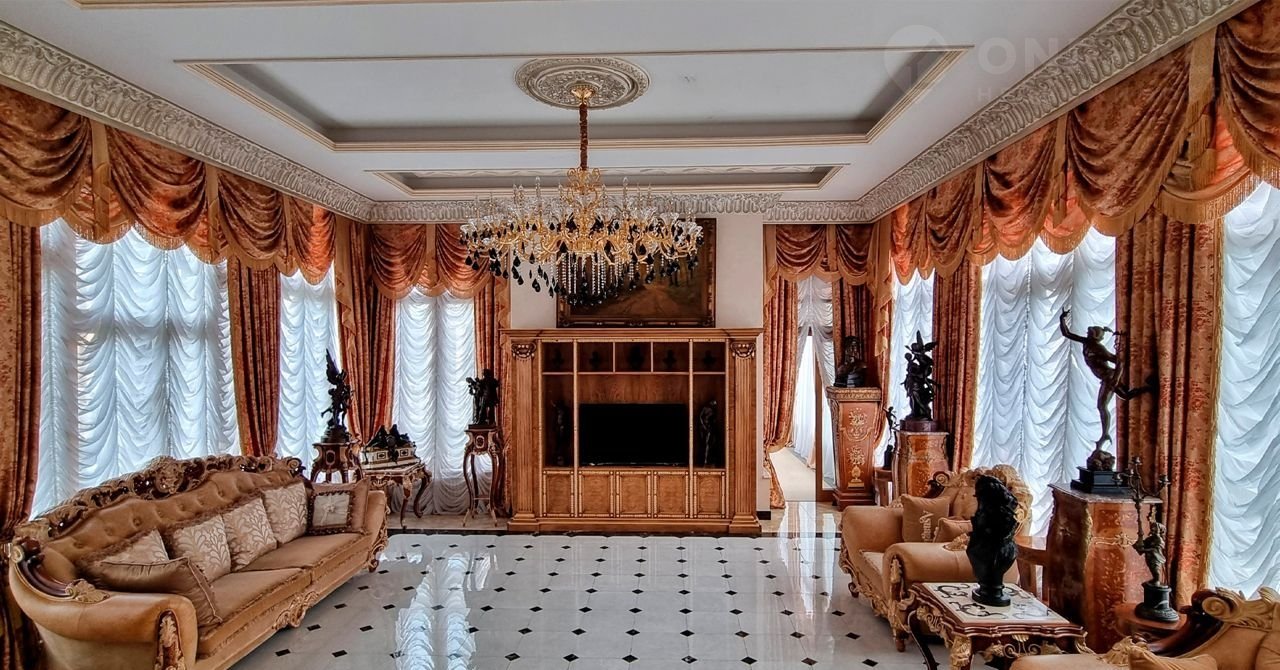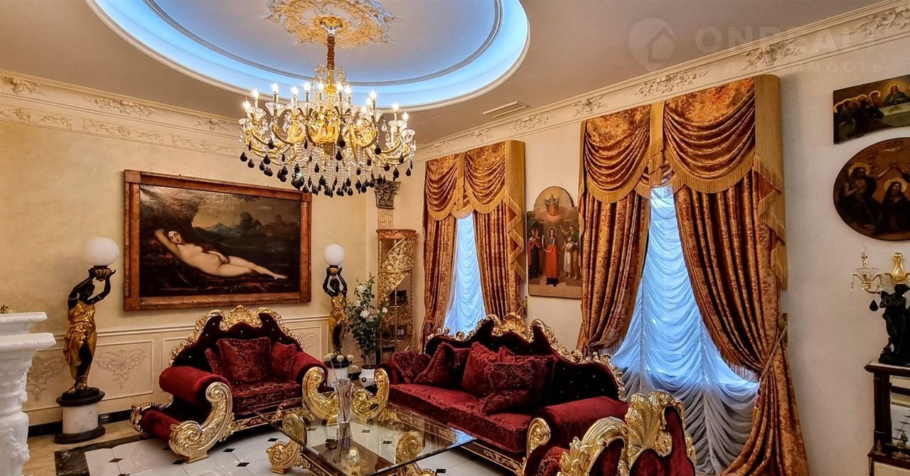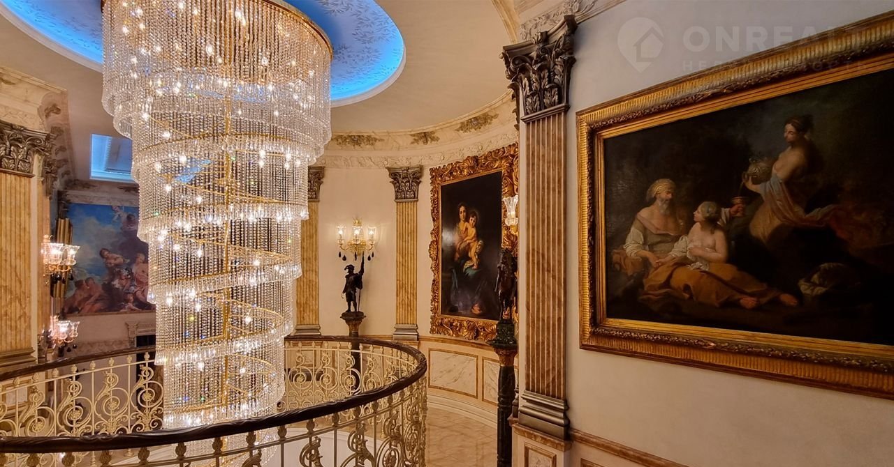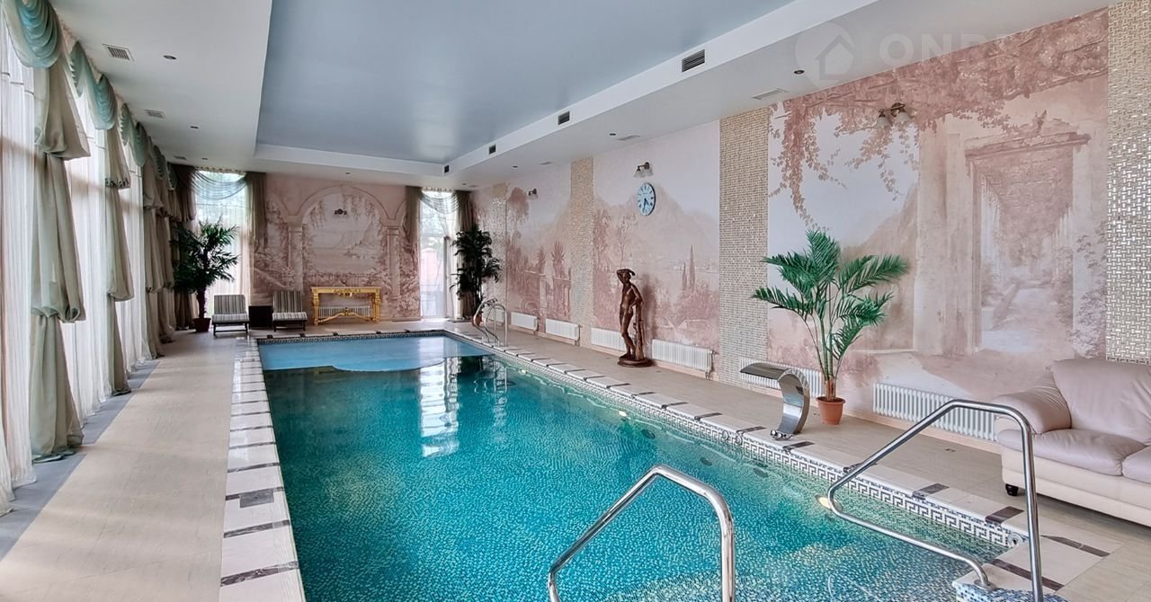 ID 10 402. Монолит. Просторный загородный особняк площадью 1850 м² расположен на полевом участке 40 соток. Бежевый фасад с колоннами и резными капителями, балясинами и наличниками выполнен в классическом стиле. В оформлении интерьера в теплой палитре оттенков использованы лепнина, позолота, витражи, колонны и полуколонны. В резиденции спланировали 4 спальни, каминный зал, гостиную, кухню, столовую, кабинет-библиотеку со вторым светом, SPA-зону с русской баней, инфракрасной сауной и купелью, бассейн, профессиональную соляную комнату. Предусмотрен гараж на 4 машины и квартира для персонала с отдельным входом. На участке выполнен ландшафтный дизайн, высажены садовые деревья и кустарники, вымощены дорожки, оборудовано уличное освещение.