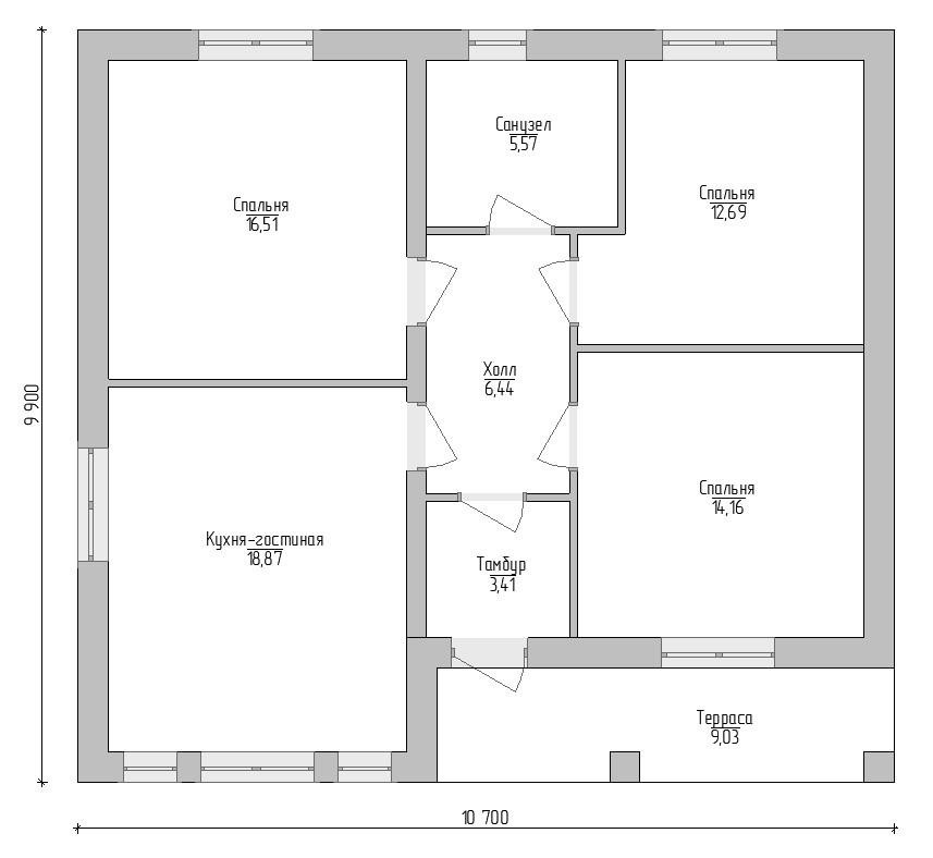 в продаже просторный одноэтажный дом площадью 85 квадратных метров с террасой при входе.