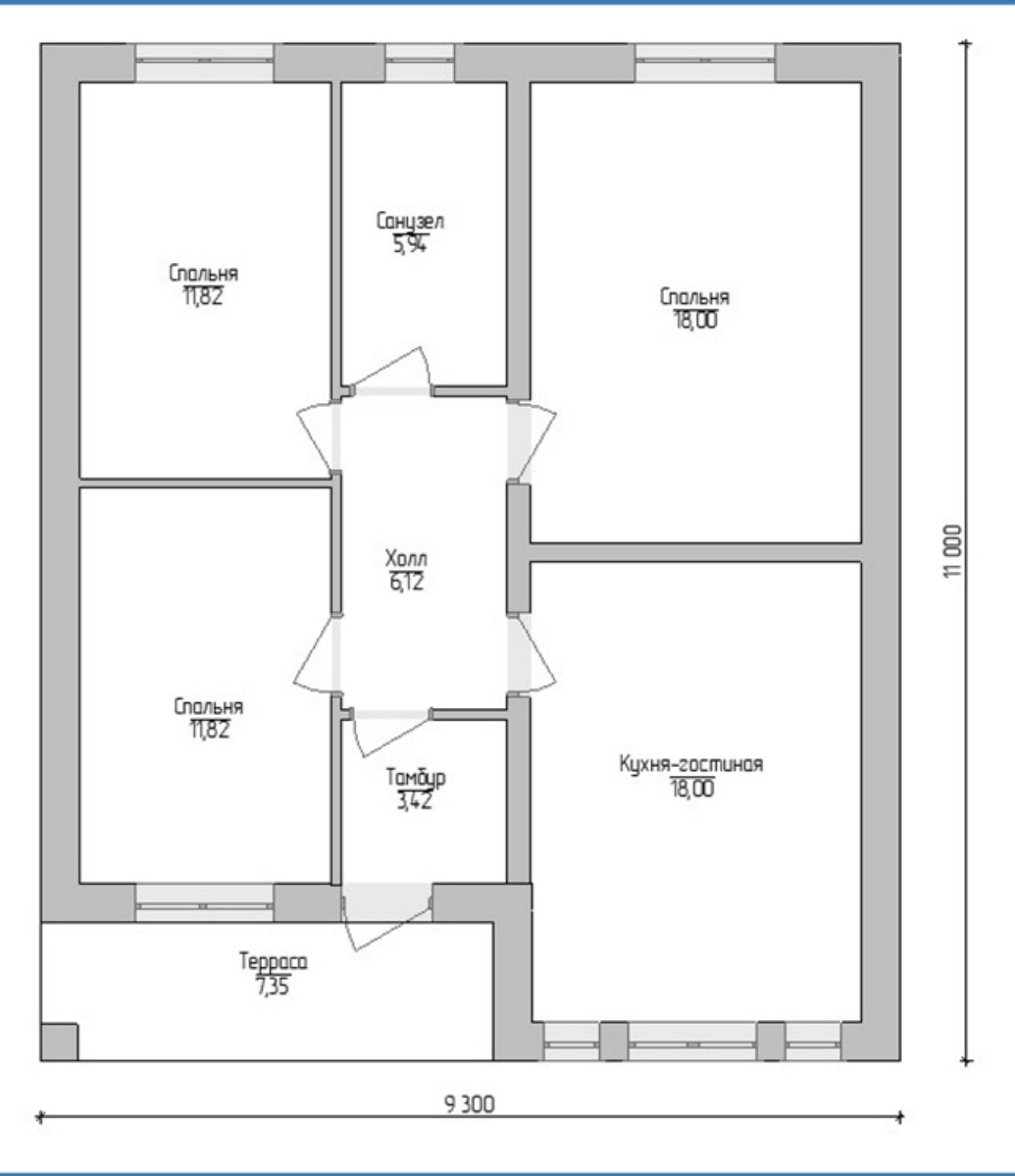 Планировка дома: кухня-гостиная, три спальни, санузел, тамбур, холл и тераса.