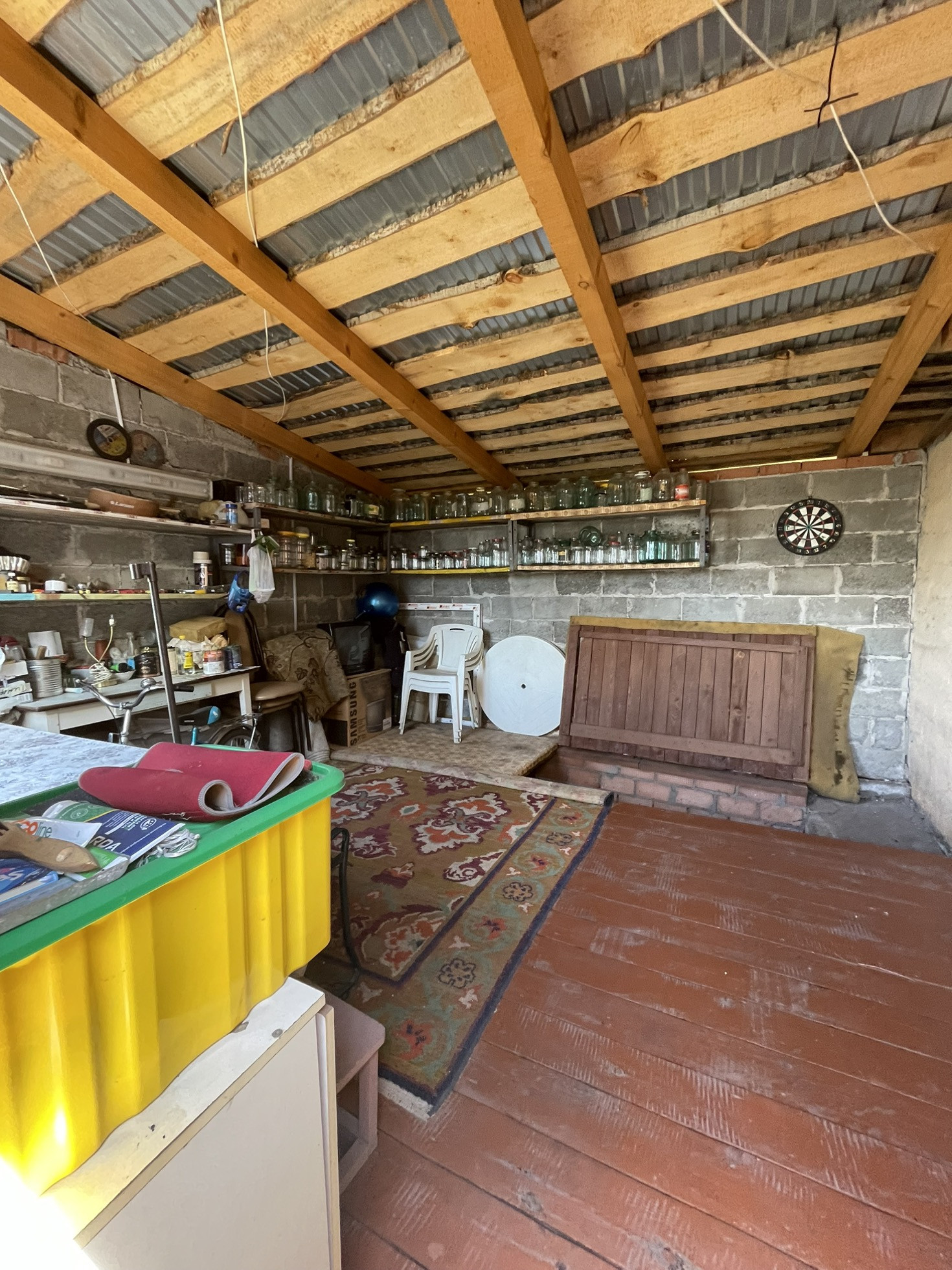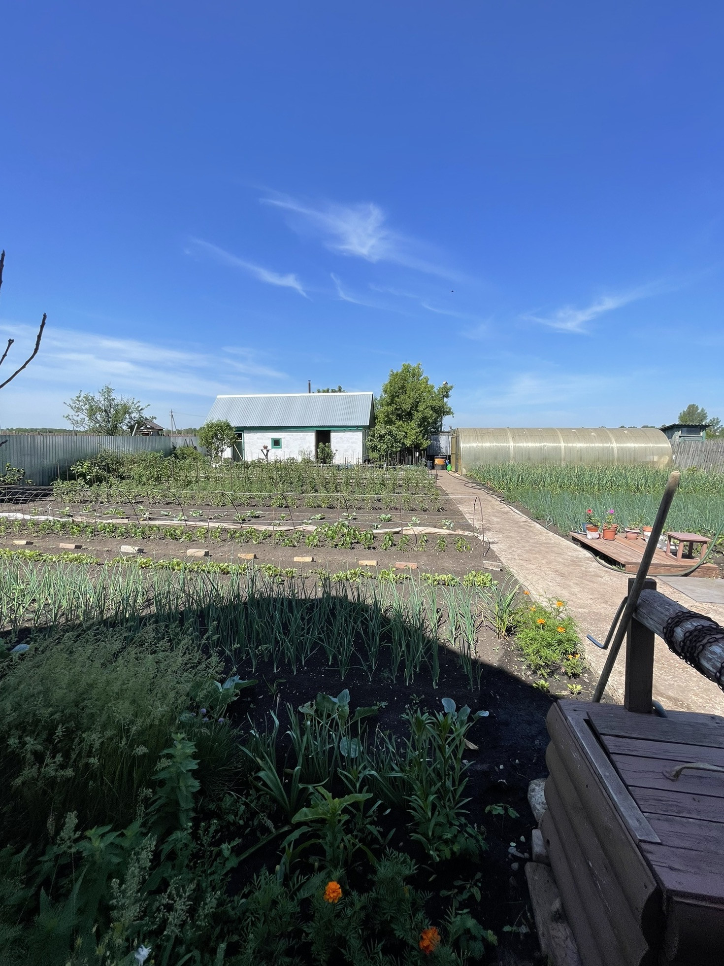В огороде засажены яблони,вишни,малина, клубника и все сезонные овощи.