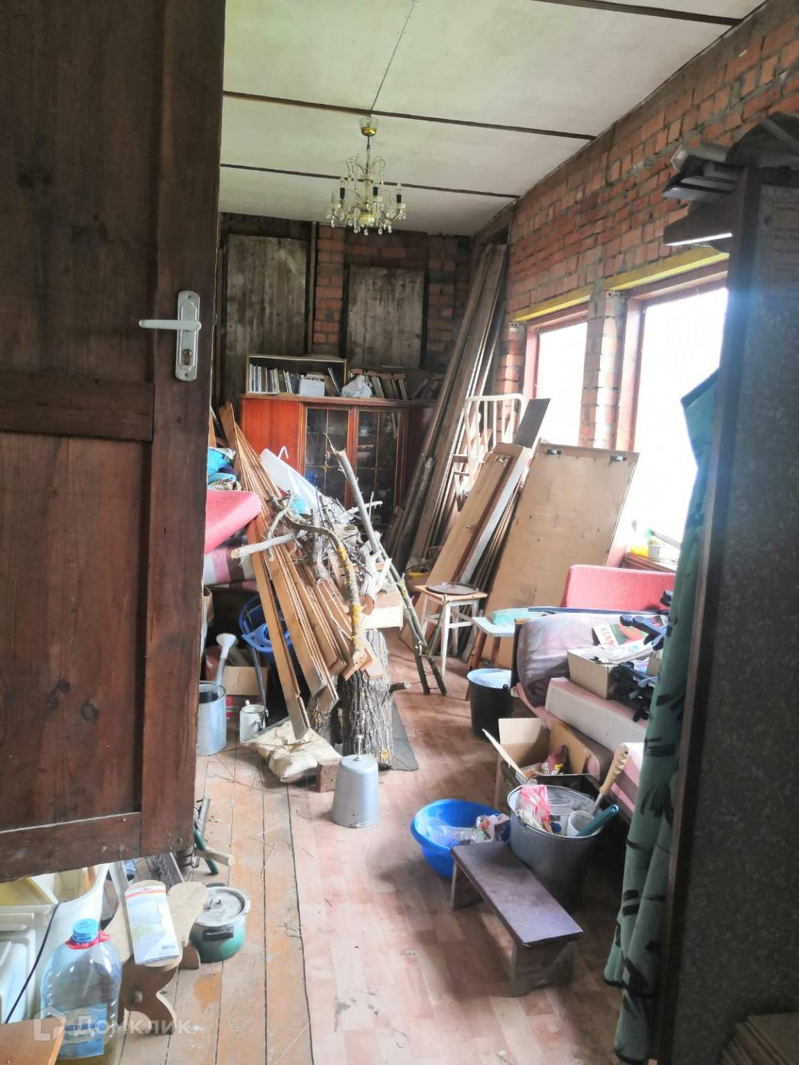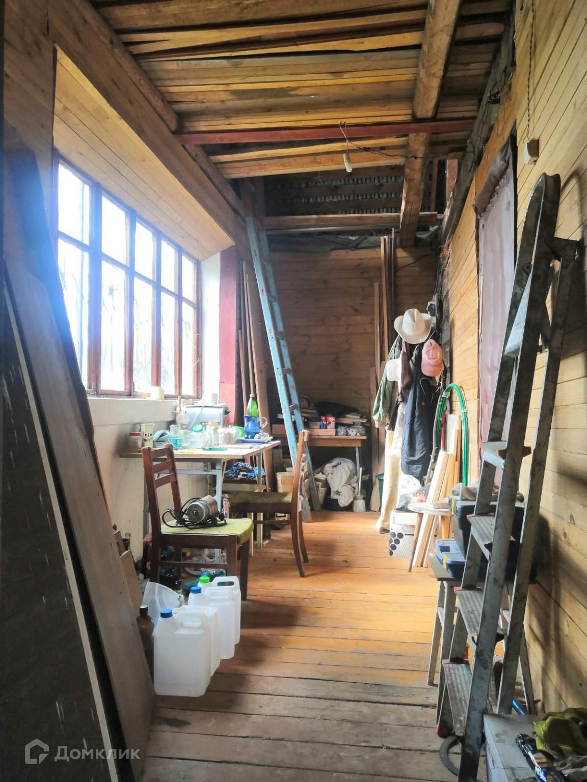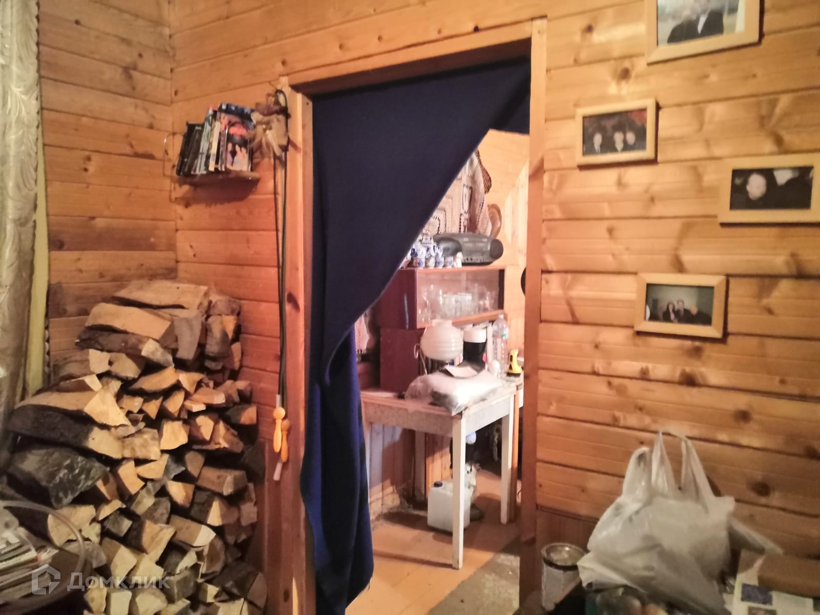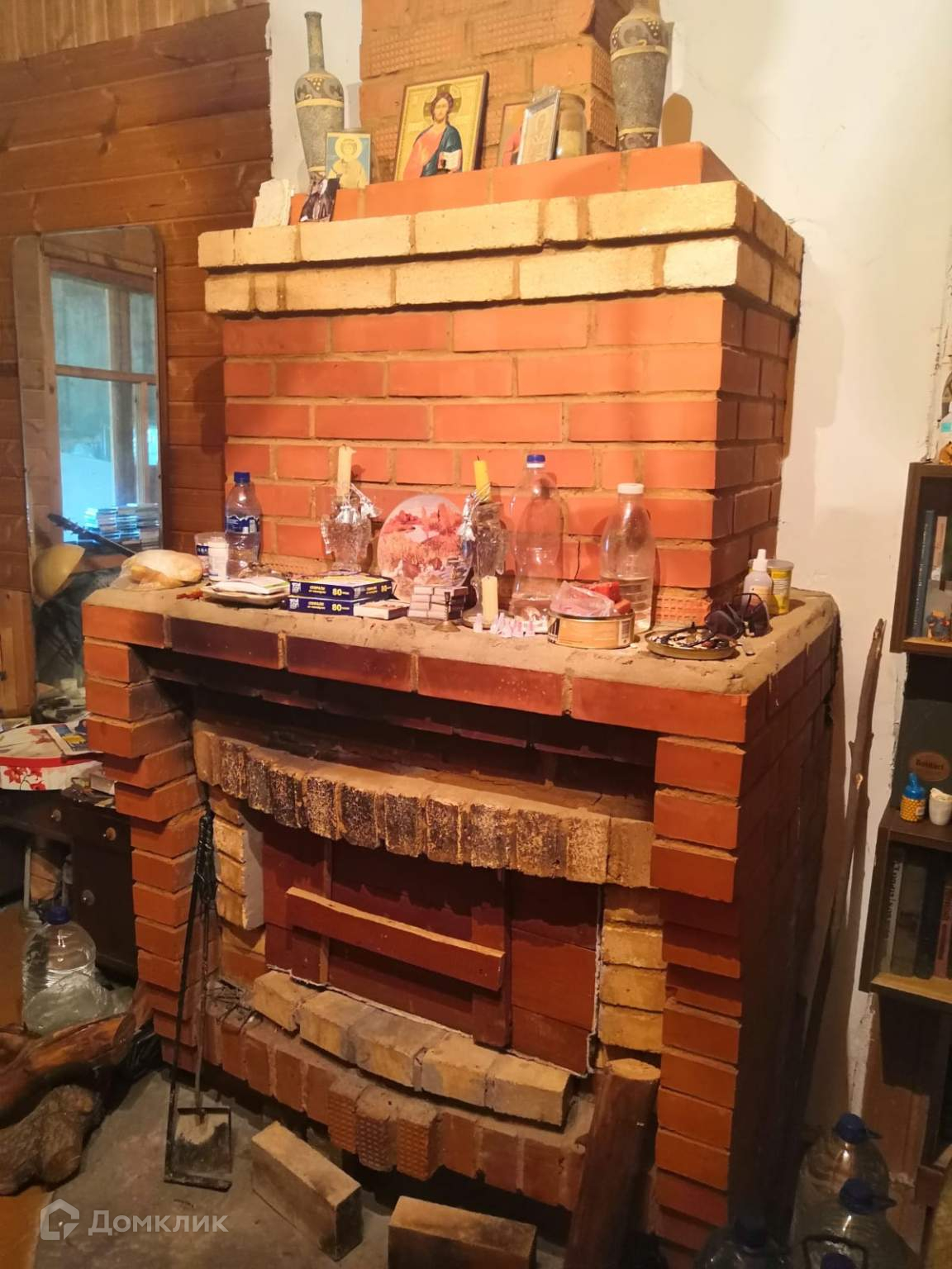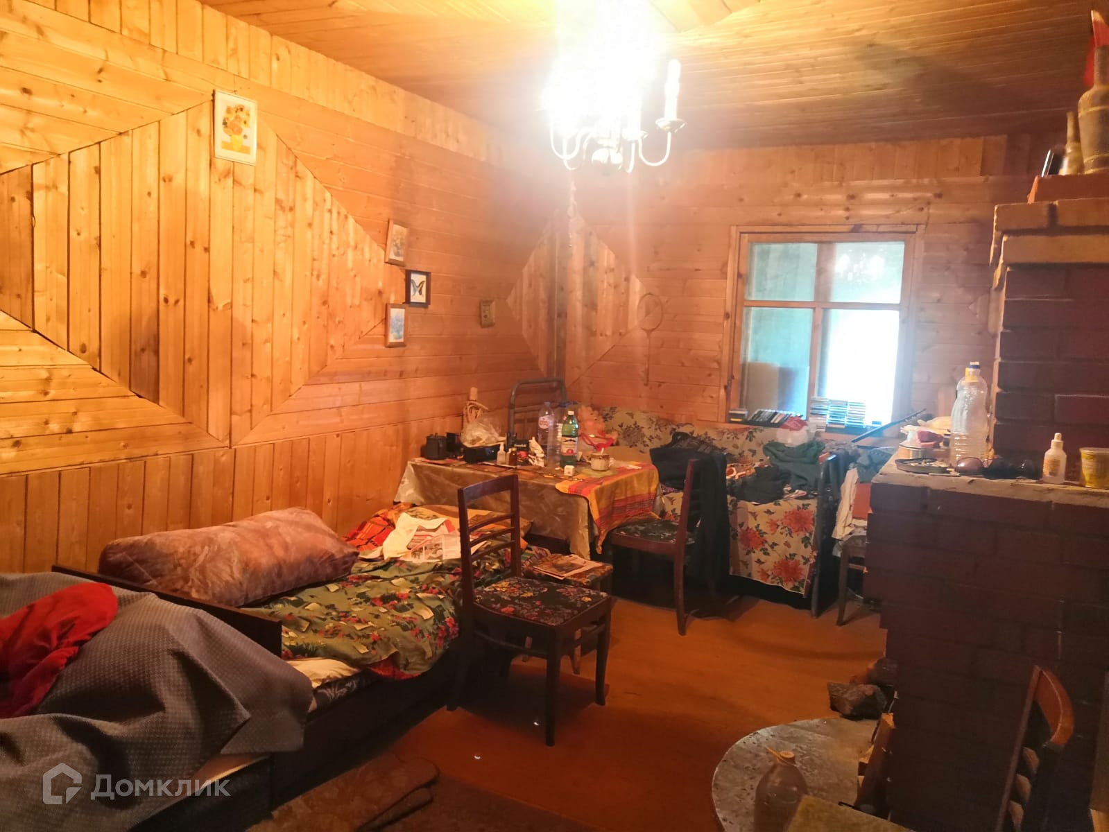 Дом двухэтажный, внутри 2 закрытые террасы (23.7 м2 и 13.7 м2) и жилой сруб. Второй этаж не сделан, лестница приставная. В срубе одна большая жилая комната 18.4 м2, одна промежуточная 6.6м2 между кухней и комнатой, кухня 7.2 м2. Имеется диван и 2 одноместные кровати. Со стороны комнаты камин, со стороны кухни печь на которой можно готовить.
