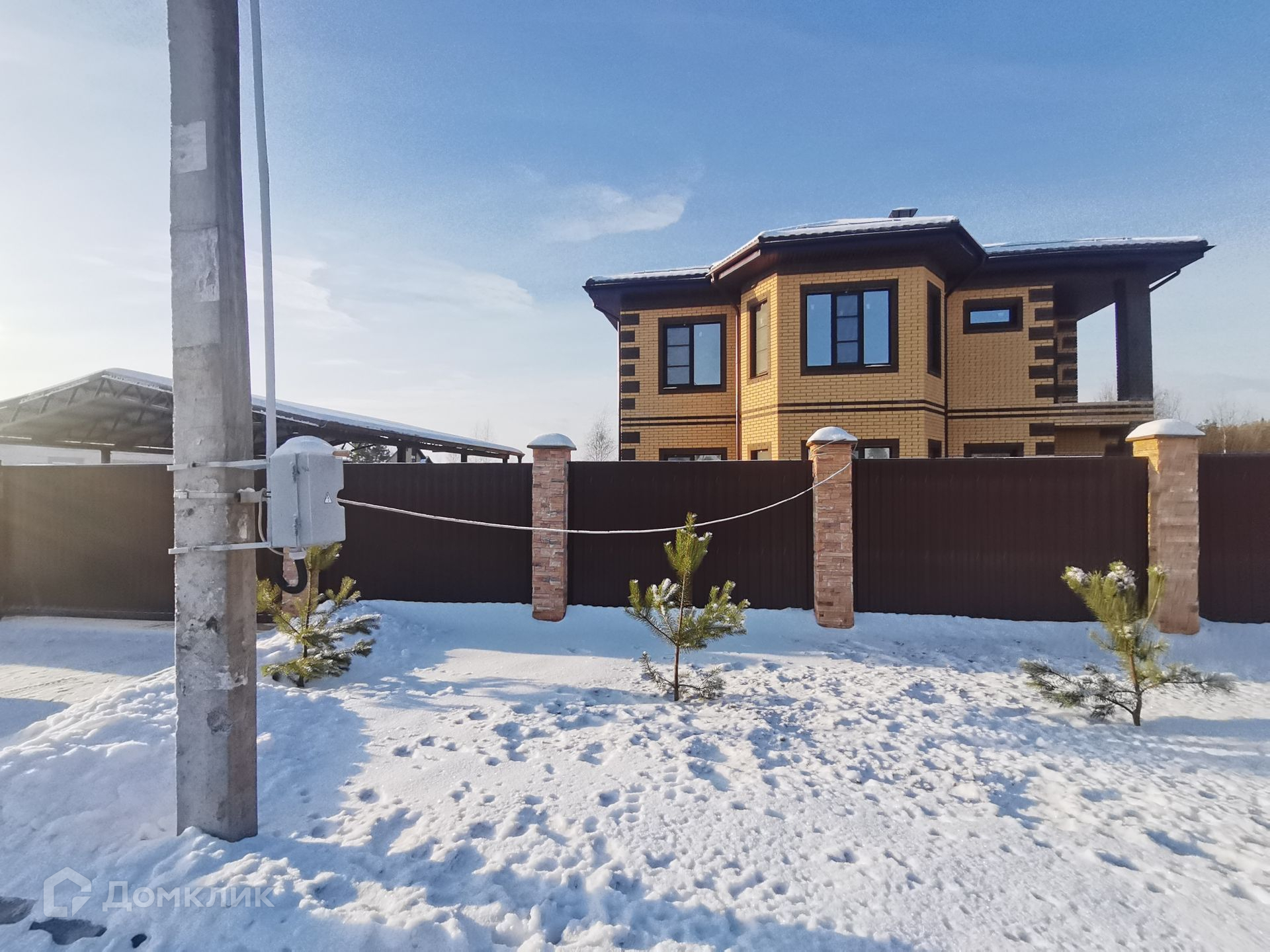 На участке расположено парковочное место с навесом на два автомобиля, залиты все дорожки, по всему периметру посажены сосновые деревья, участок огорожен забором.