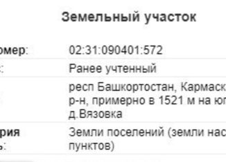 Продается участок общей площадью 15 сот. с возможностью присоединения 10 сот. по периметру участка, в сумме получится 25 сот., по цене 22 000 рублей за сот., расположенный по адресу: Респ. Башкортостан, Кармаскалинский р-н, с/c Подлубовский, д. Вязовка Бекетовского сельсовета. ХАРАКТЕРИСТИКИ: - Кадастровый номер участка: 02:31:090401:1116. - Участо... |