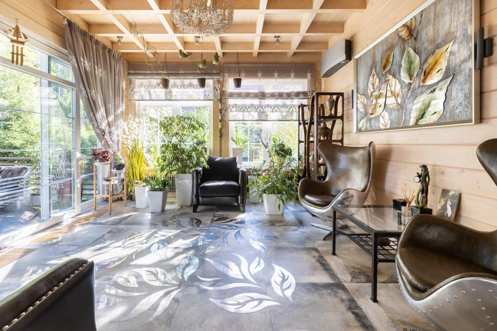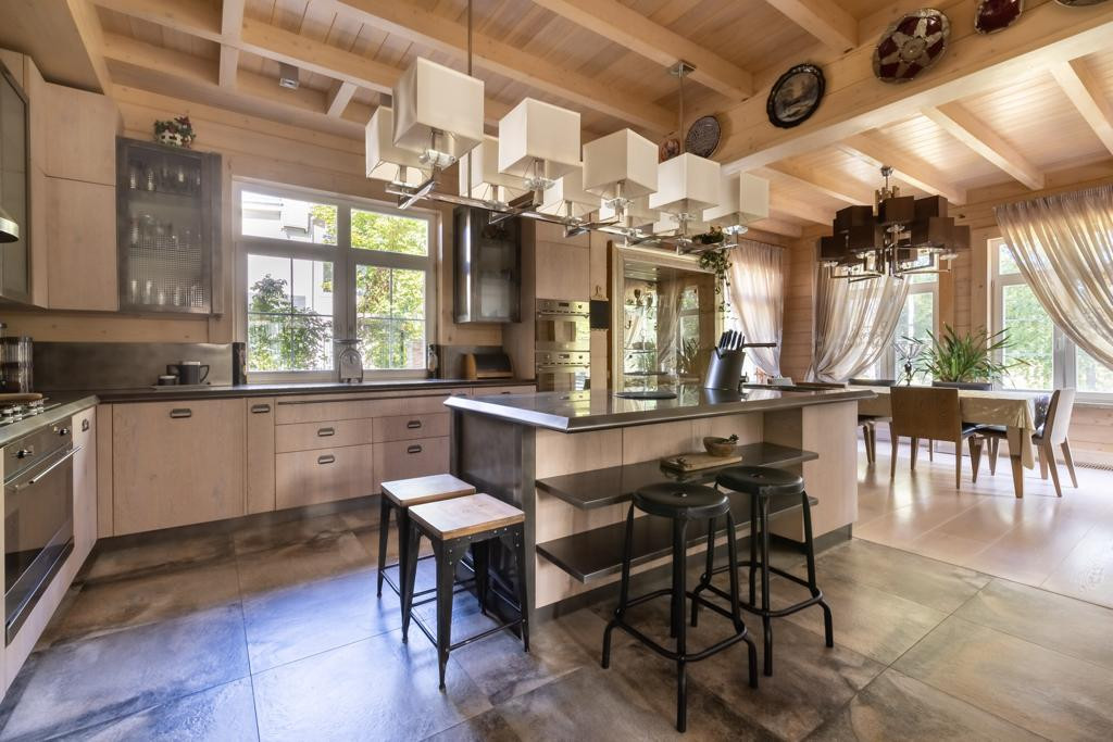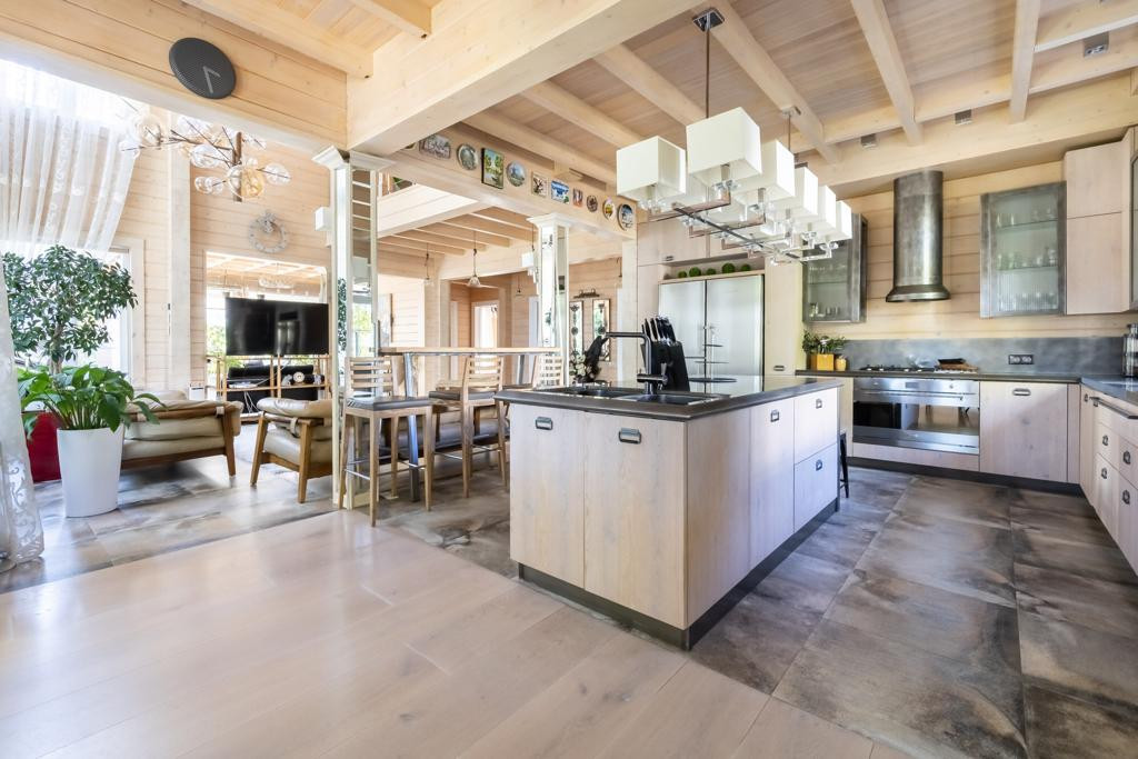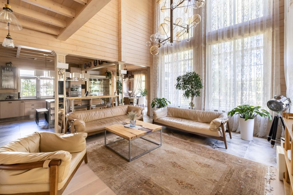 Первый этаж: кухня-столовая. Мебель-кухня Scavolini по индивидуальному заказу (дерево/стекло/металлические столешницы), бытовая техника: Gaggenau, Bork, SMEG, libherr. Гостиная со вторым светом: итальянская люстра по индивидуальному заказу, барная стойка и журнальный столик из массива и смолы, кожаная мебель Италия, телевизор Samsung. Зимний сад с выходом на террасу. Санузел с душевой кабиной, гостевая спальня, коридор, кладовая, бойлерная.
