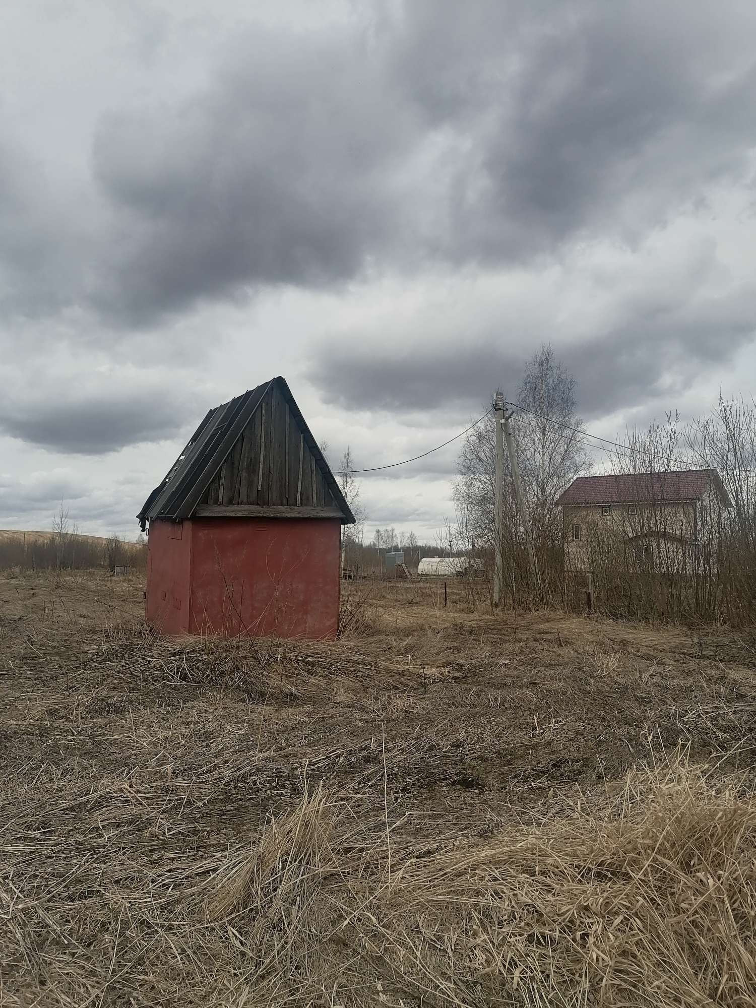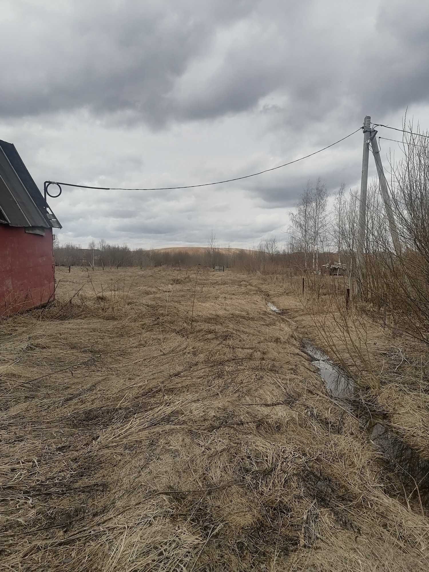Участок ровный, подготовлен для строительства, обнесен сеткой рабицей, есть бытовка, подведено электричество.
