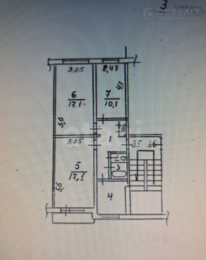 Плaниpовка: тpи изoлиpованныe комнаты (17,1 + 17,1 + 10,1 м²), бoльшая пpихожая (8 м²), кухня 7 м², лоджия 2,4 м²